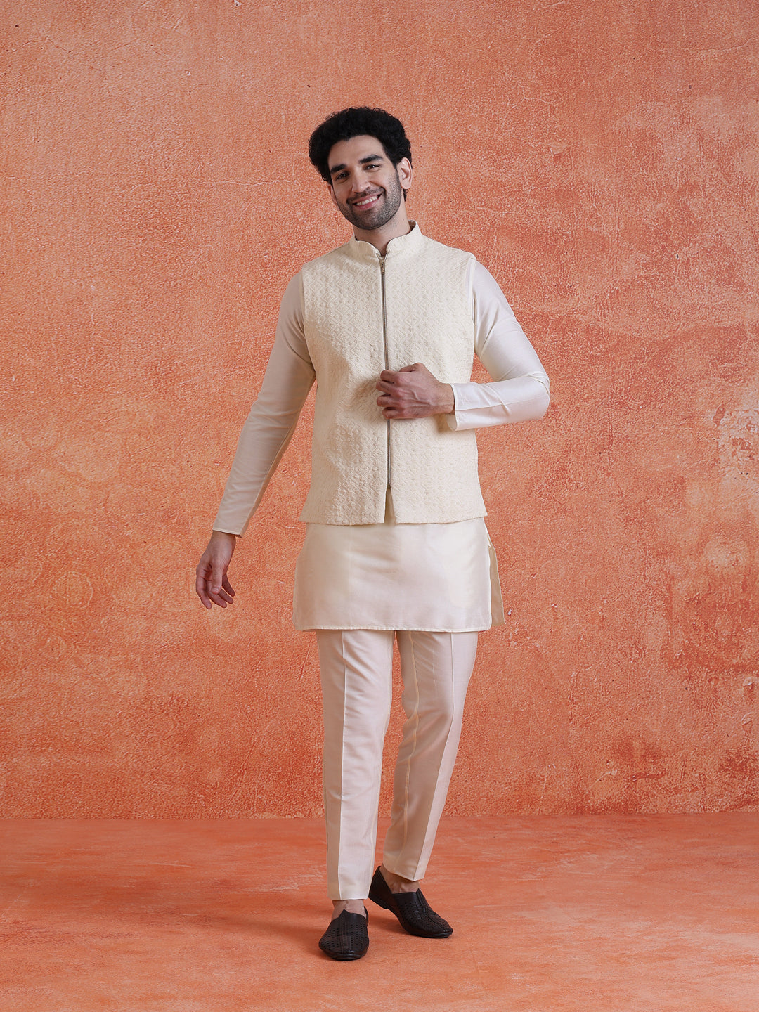Upgrade your festive style with this cream Jacquard Jacket with Zip. Crafted from a premium Silk Blend, it offers a modern, structured fit.