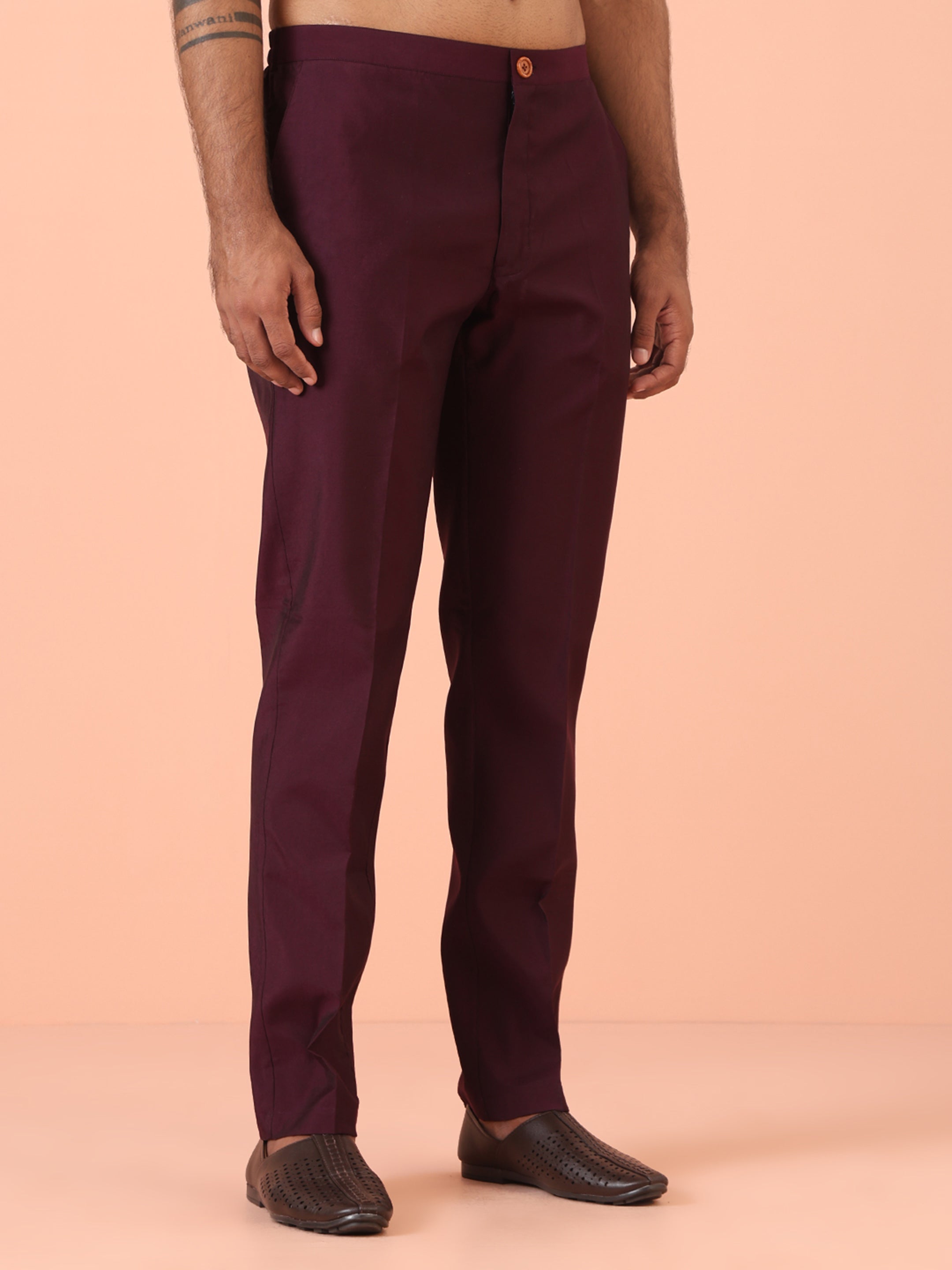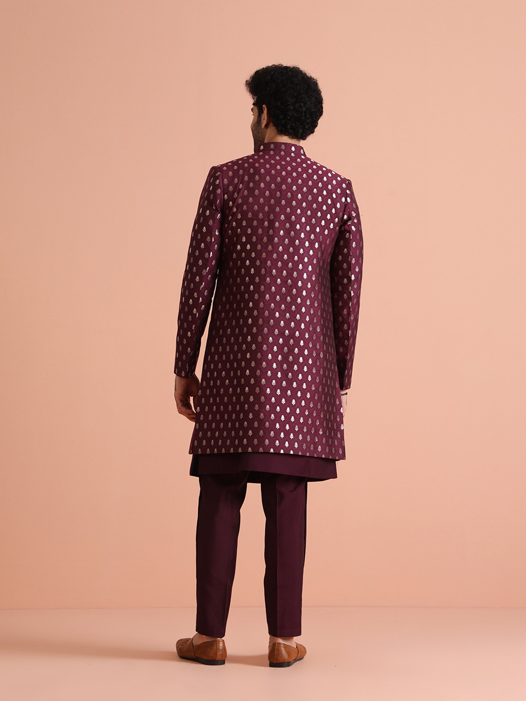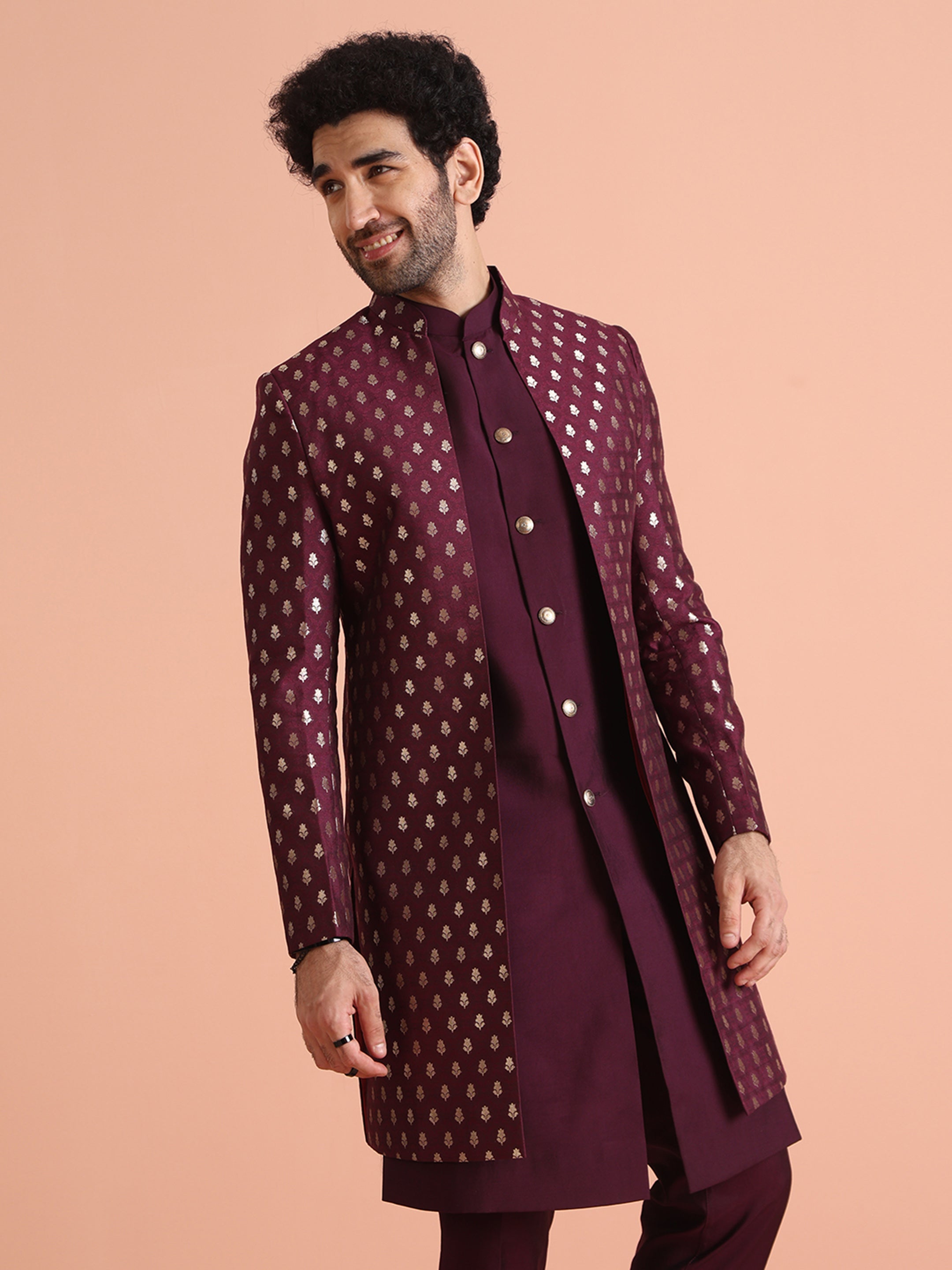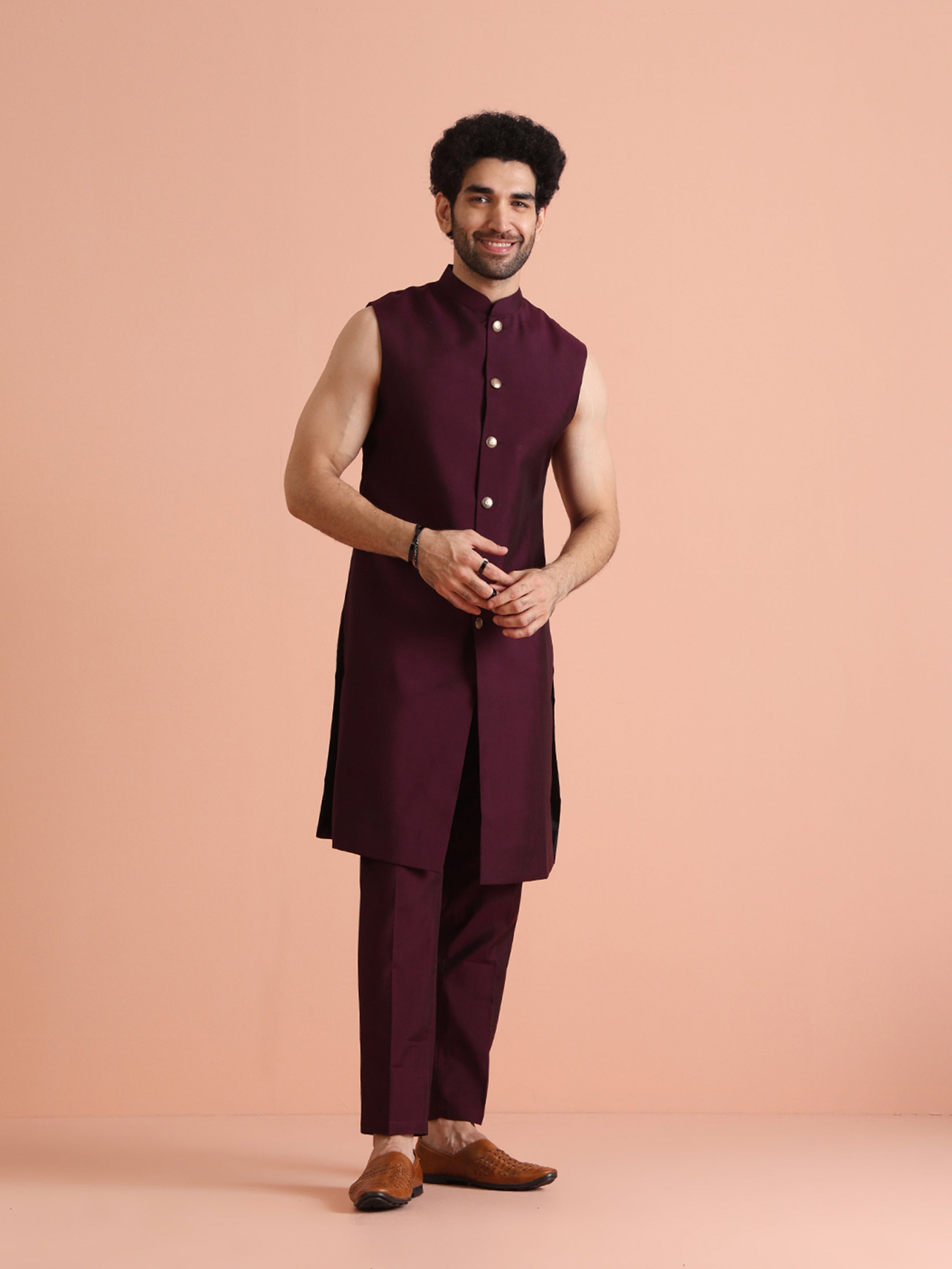 Experience classic elegance with this Men's Wine Color Silk Blend Jacket Indo Western Indo Western Trouser Set. The Jacquard Pattern adds a refined touch, while the breathable fabric ensures comfort throughout the day. Ideal for festive events or casual wear, this Jacket Indo Western Indo Western Trouser Set is a wardrobe essential.