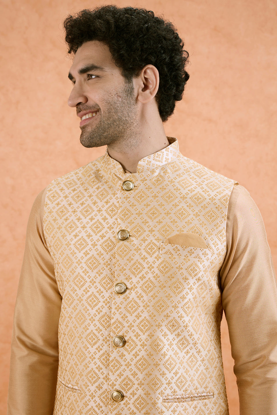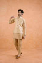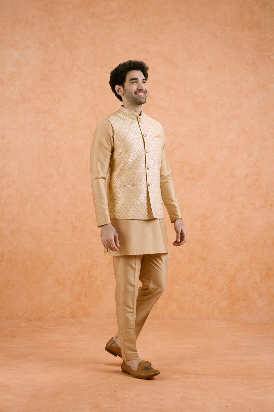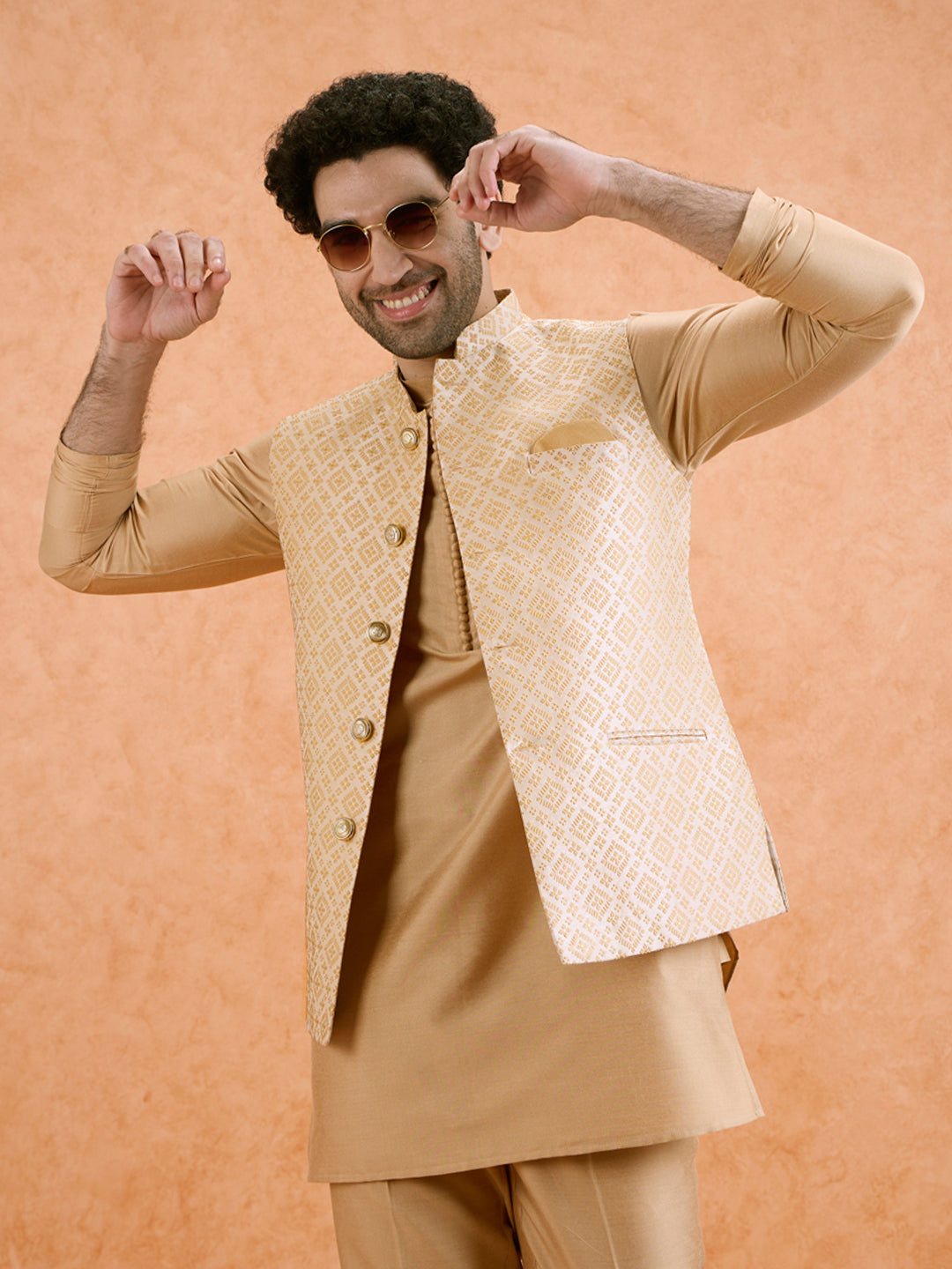 This Gold Nehru Jacket is a yes for all your casual occasions. The Jacket is of Jacquard which adds on to the defined and modern look. This Jacket will complete your look