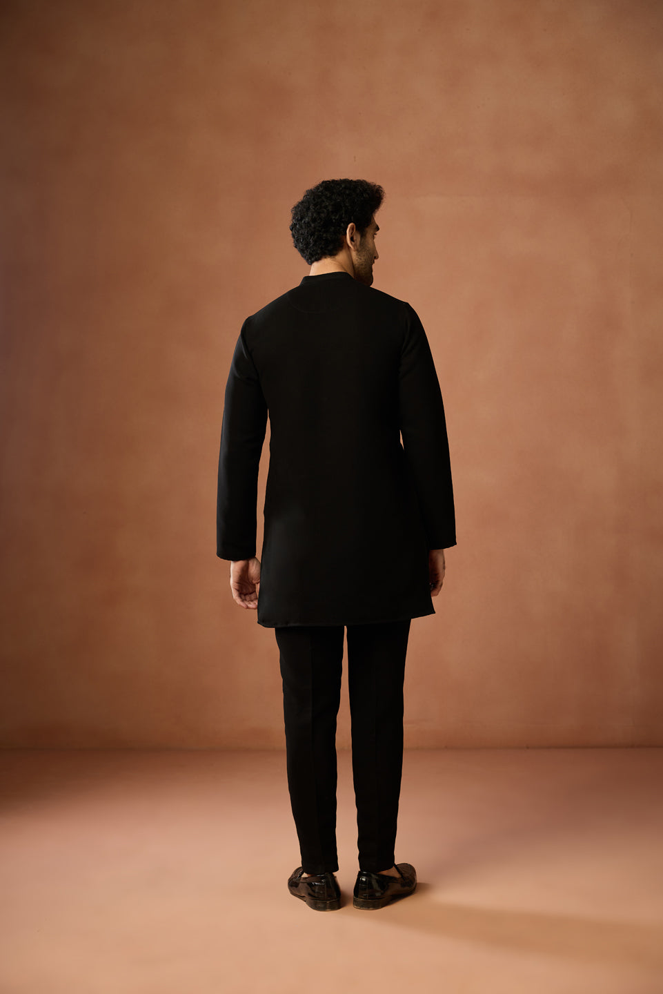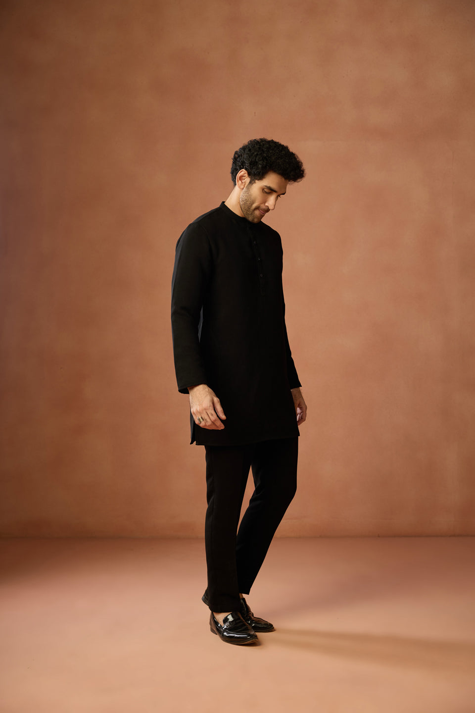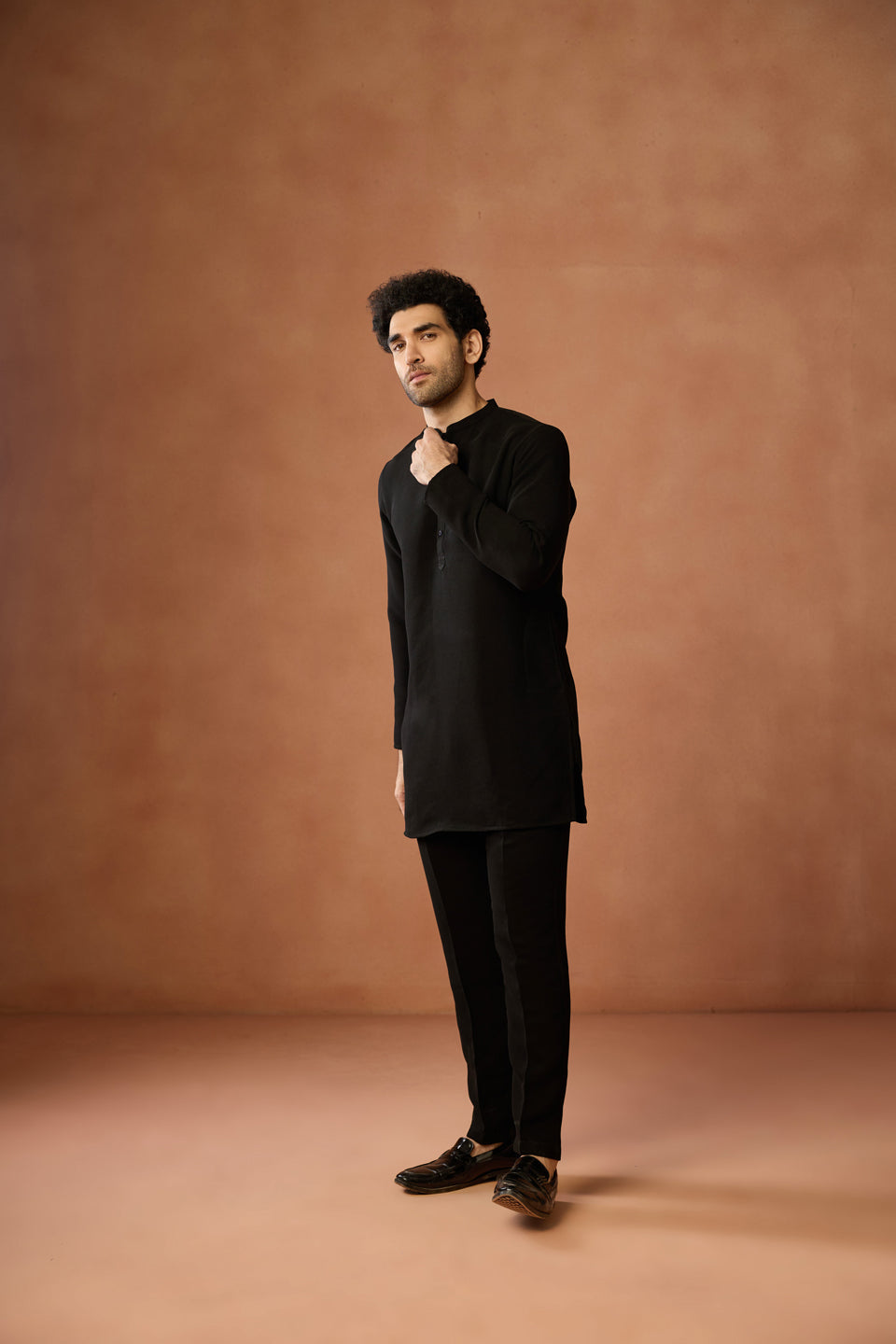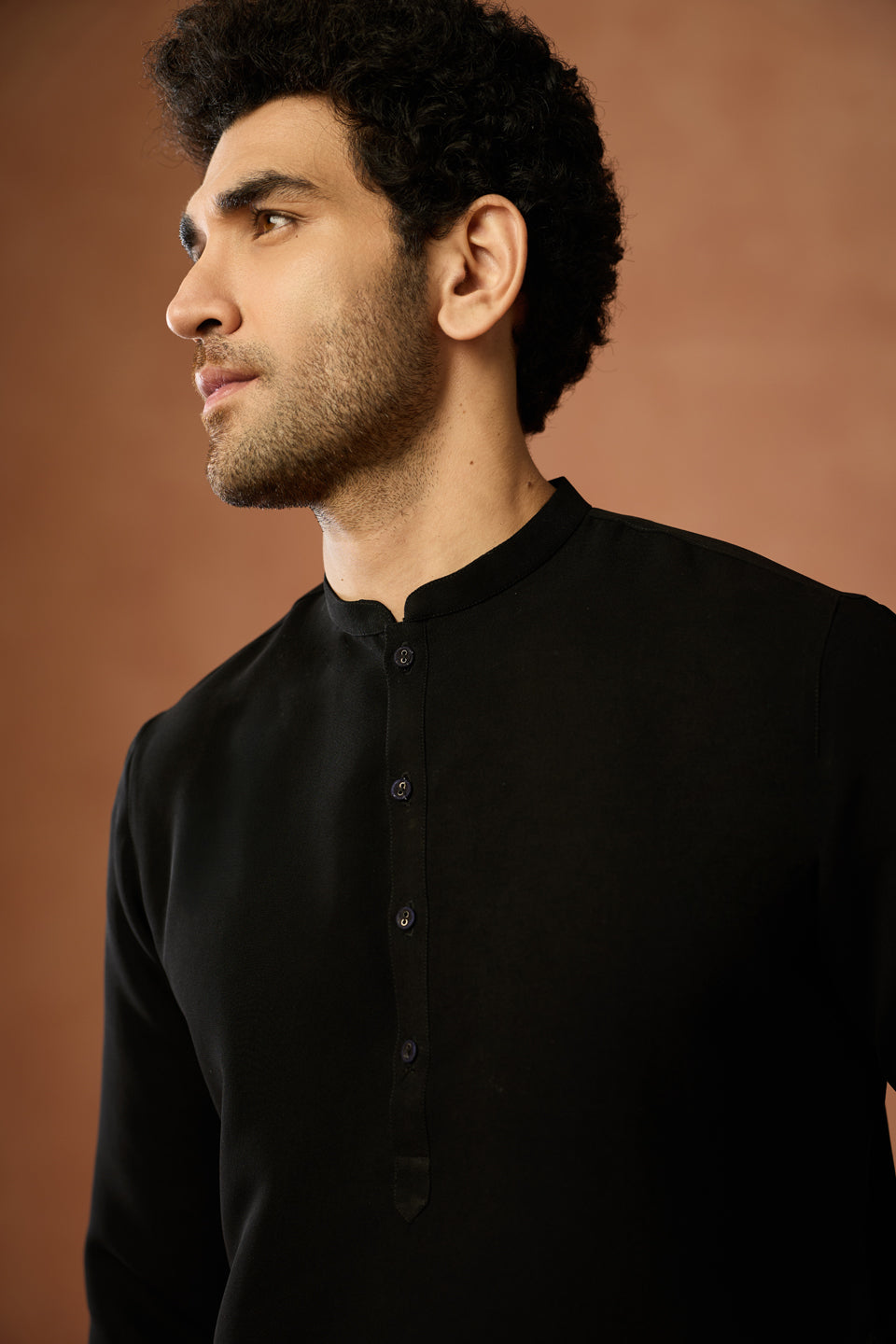 Kisah Black Silk Blend Mid Kurta Trouser Set in solid plain design versatile ethnic wear for weddings, festive events & formal occasions.
