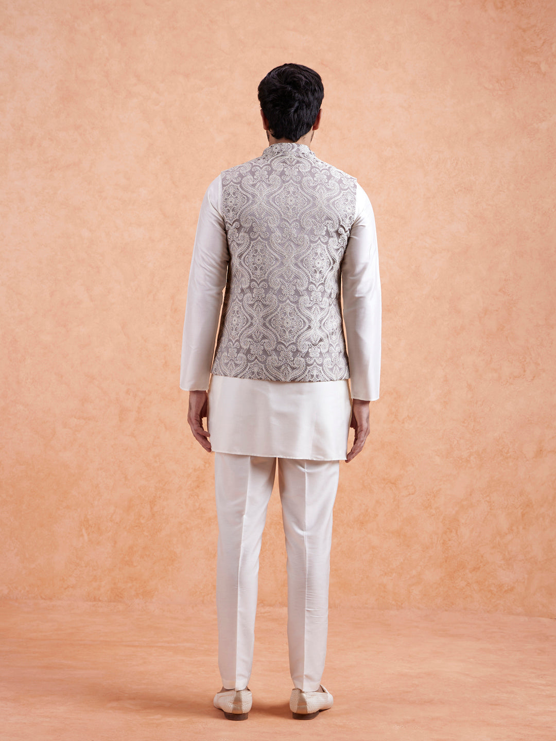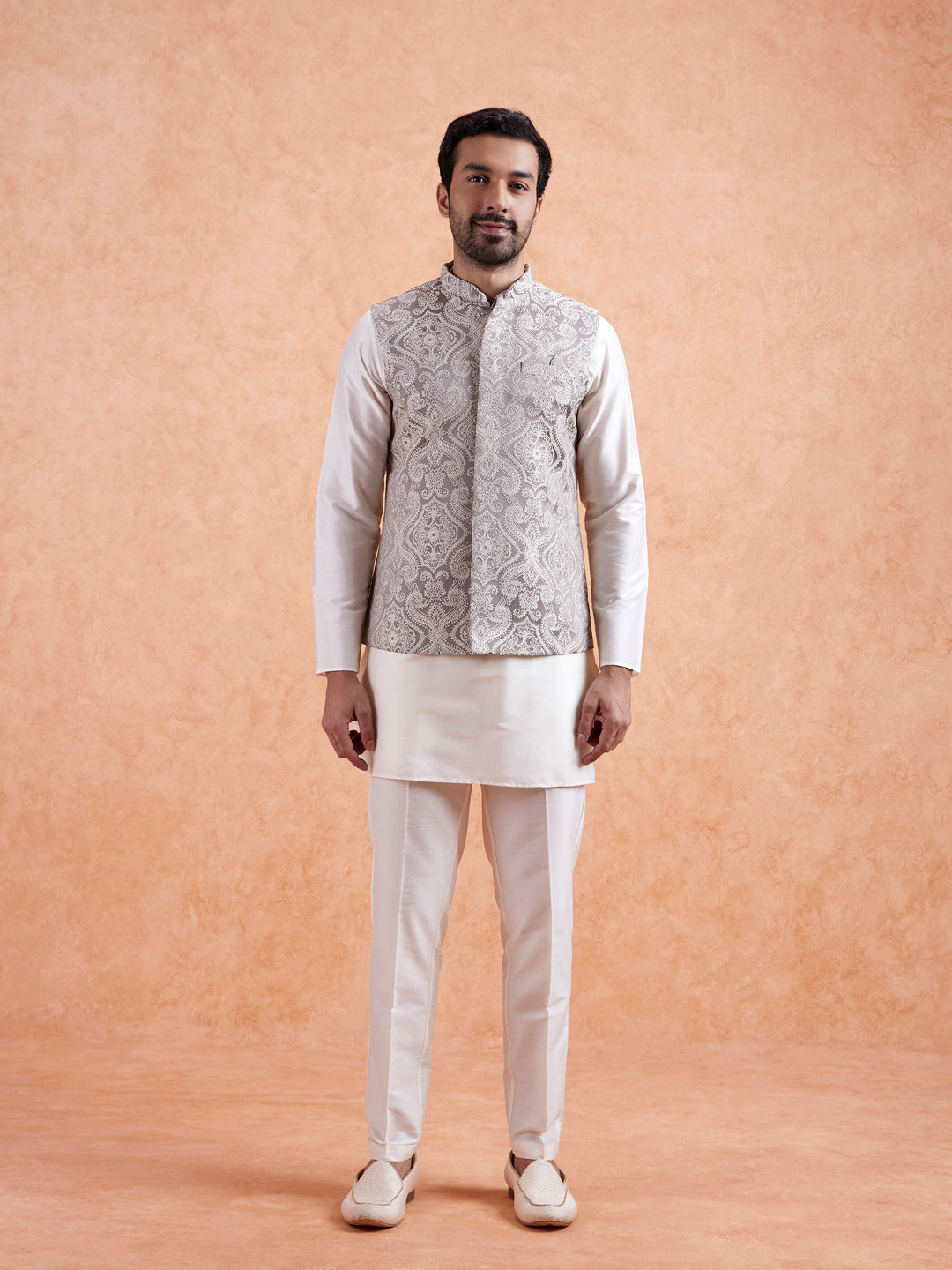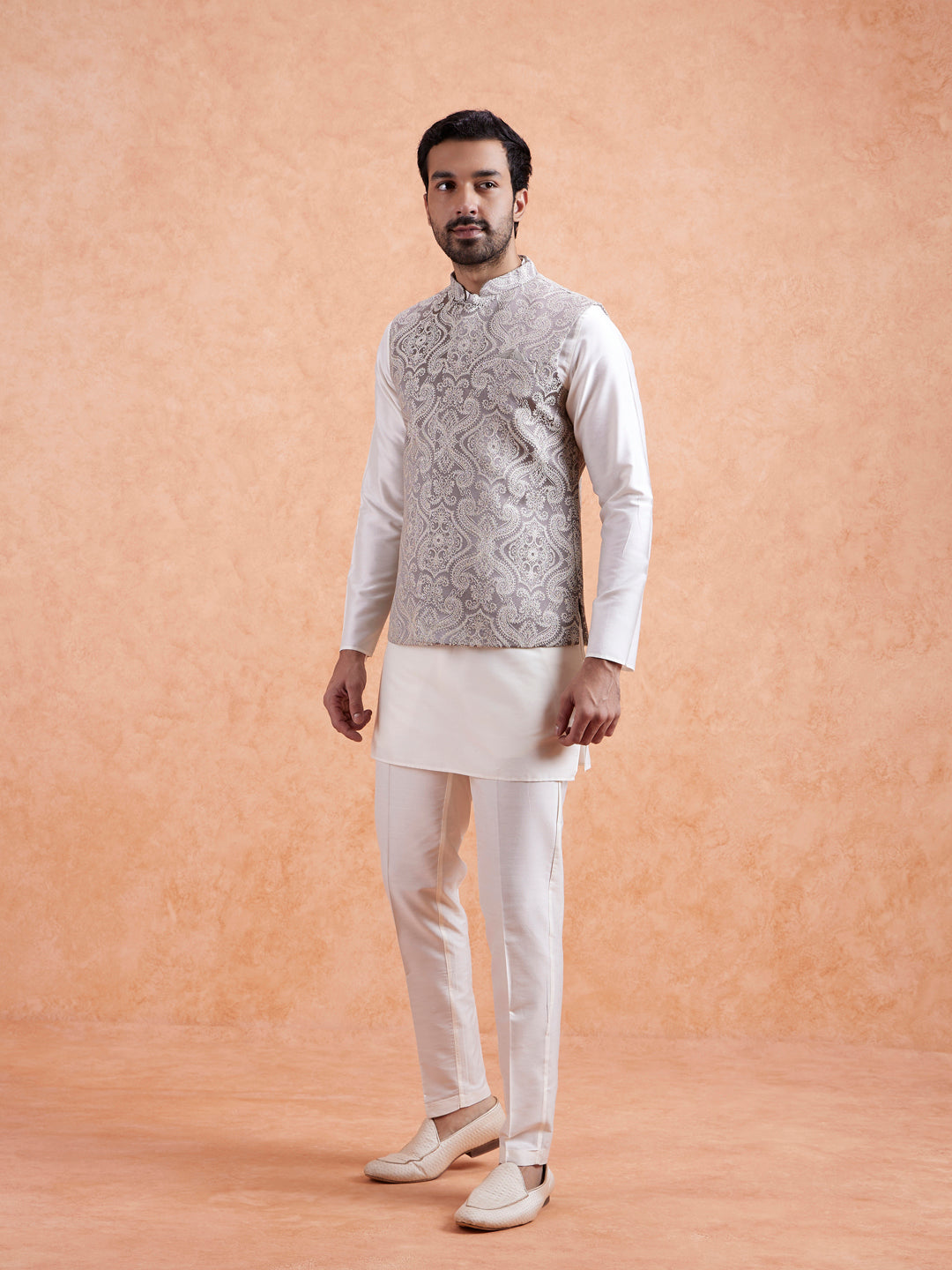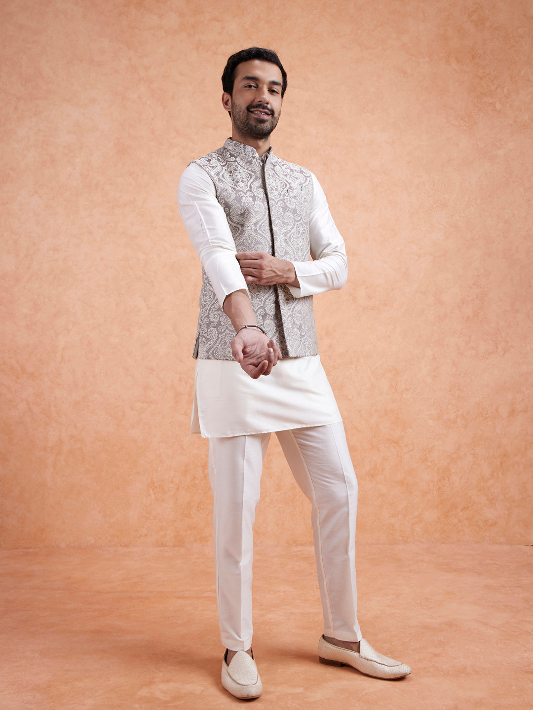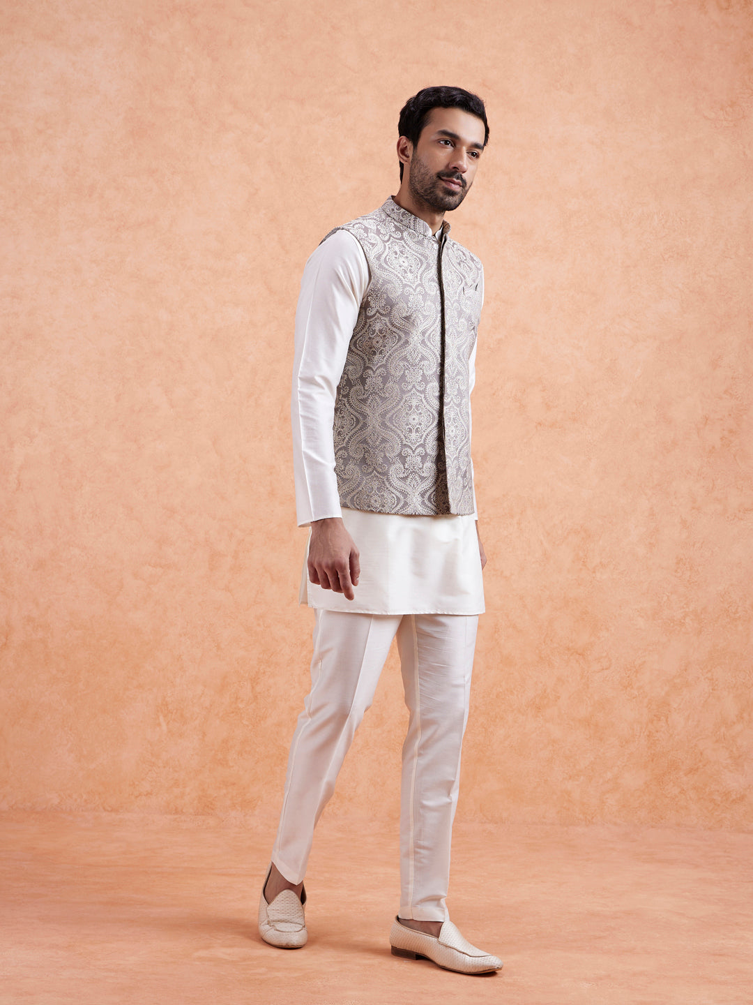 Grey Jacquard Woven Design Mid Kurta Jacket Trouser Set, Perfect festive ethnic wear for men, ideal festive and casual occasions.