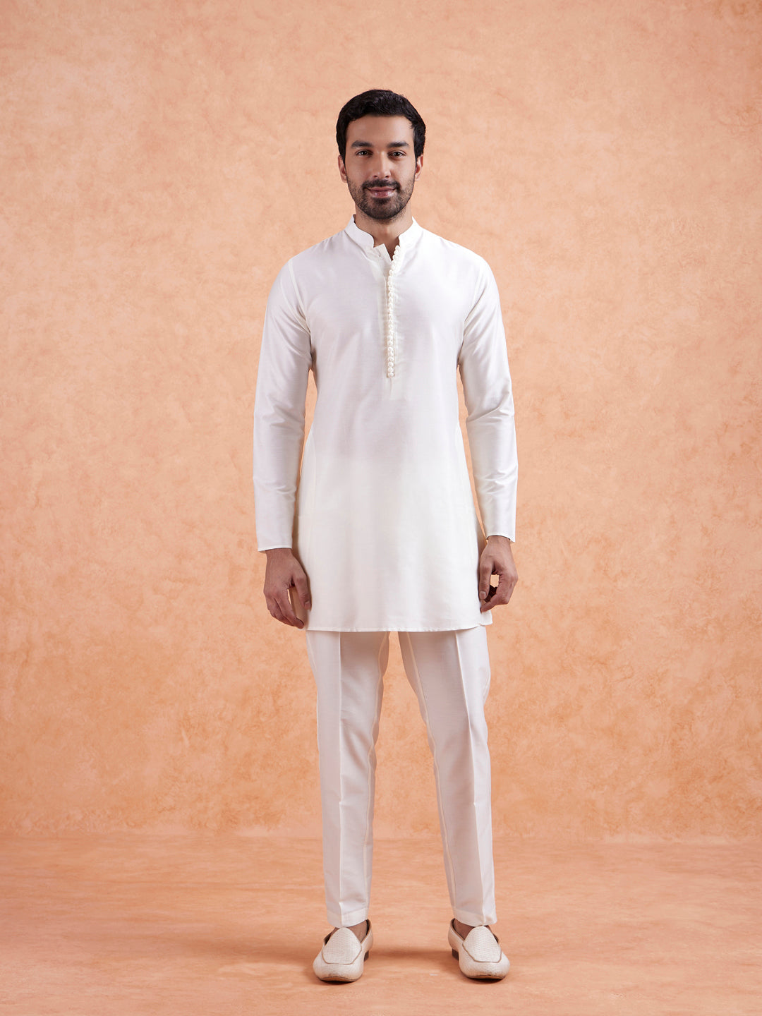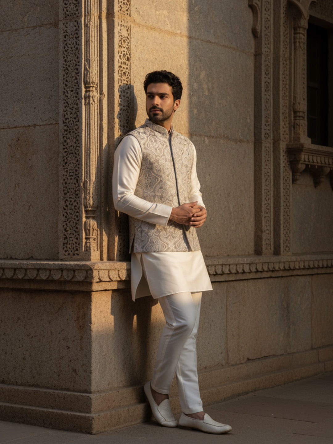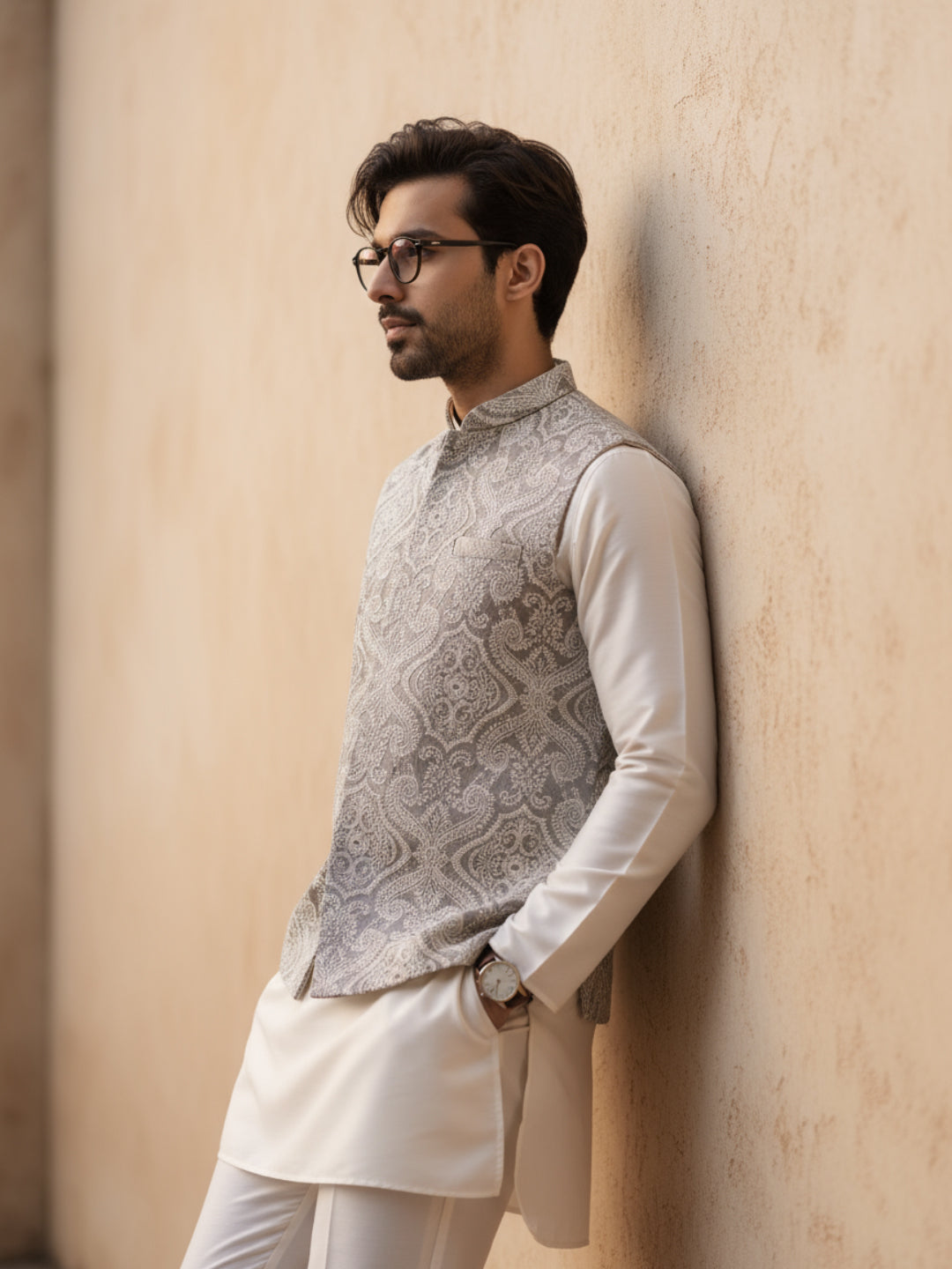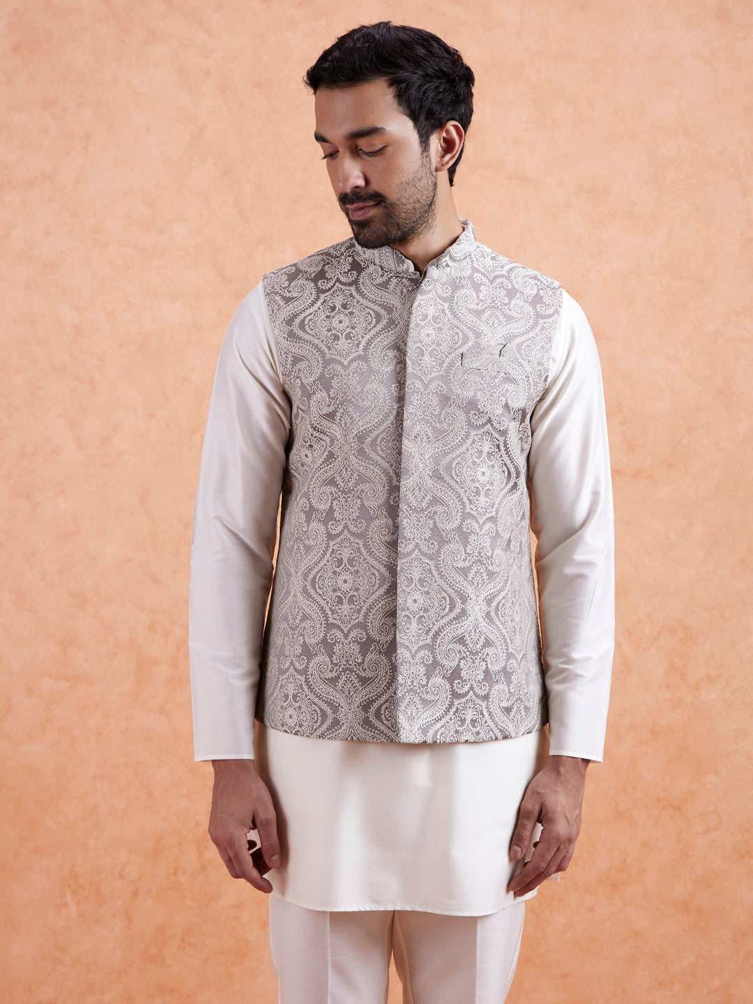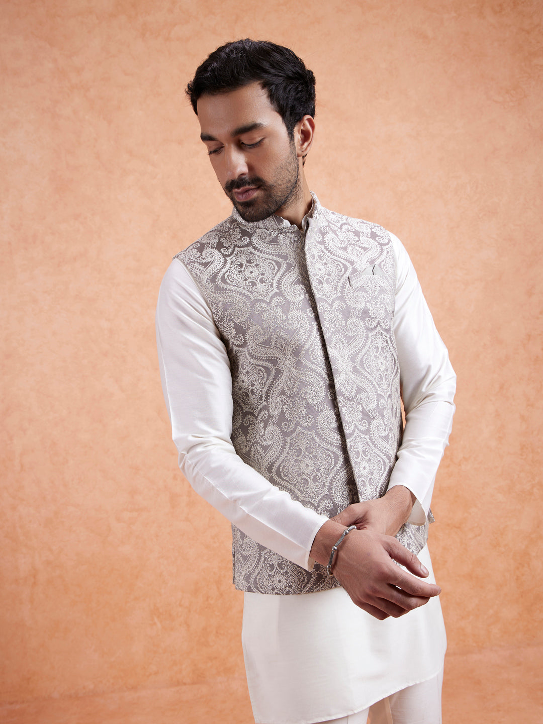 Grey Jacquard Woven Design Mid Kurta Jacket Trouser Set, Perfect festive ethnic wear for men, ideal festive and casual occasions.