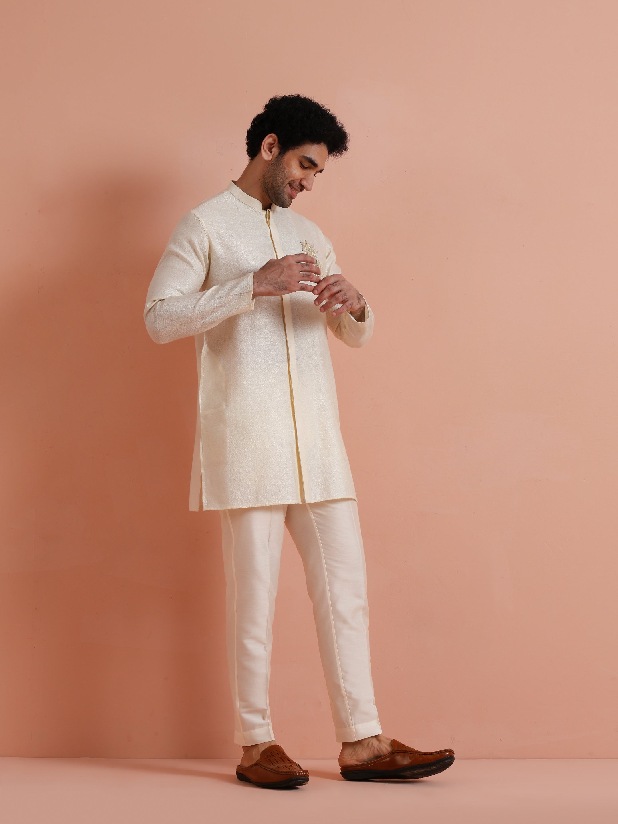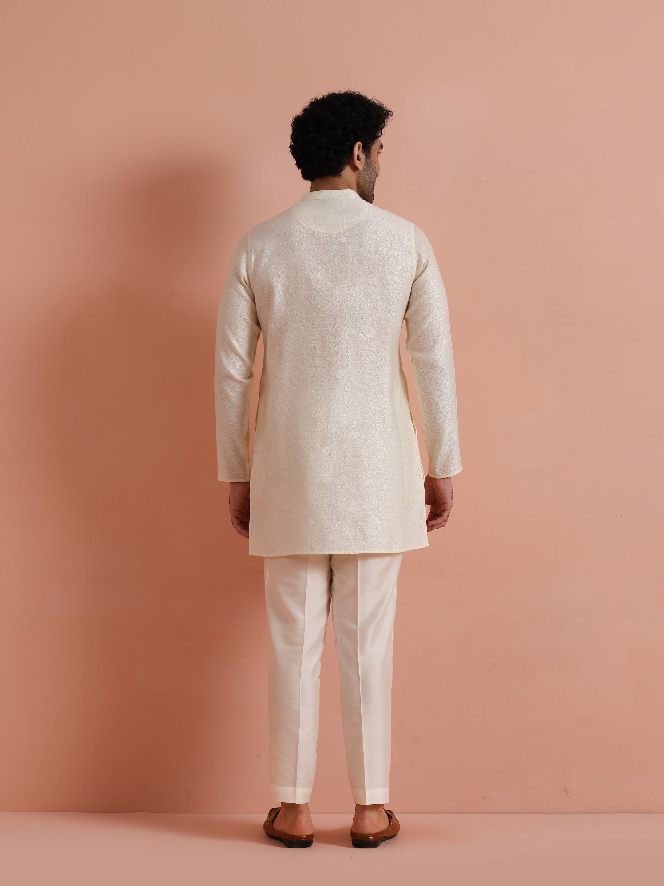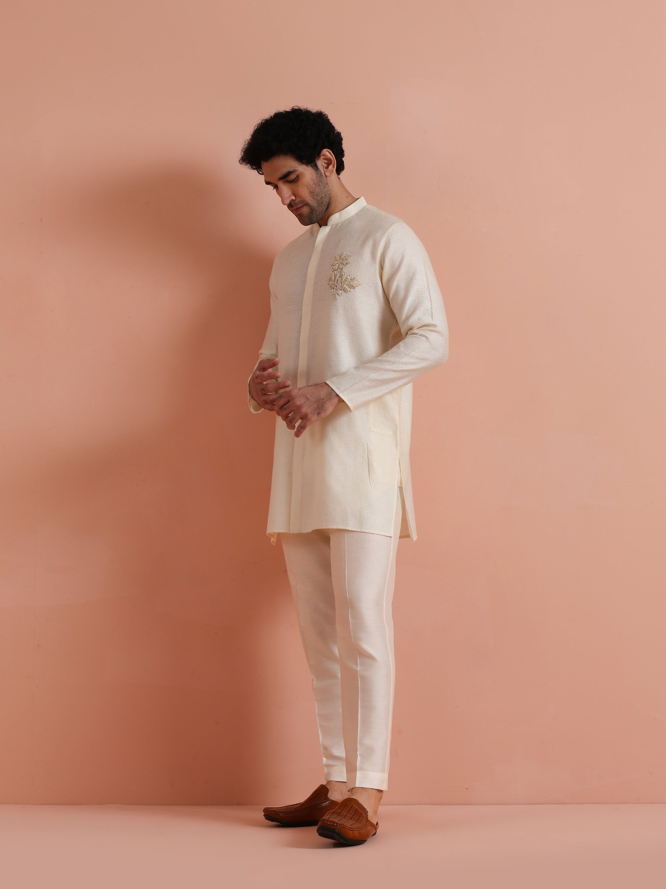Kisah Menss Ivory Embroidered Mid Kurta elegant festive kurta with golden motif embroidery. Perfect for weddings, receptions, and traditional occasions.