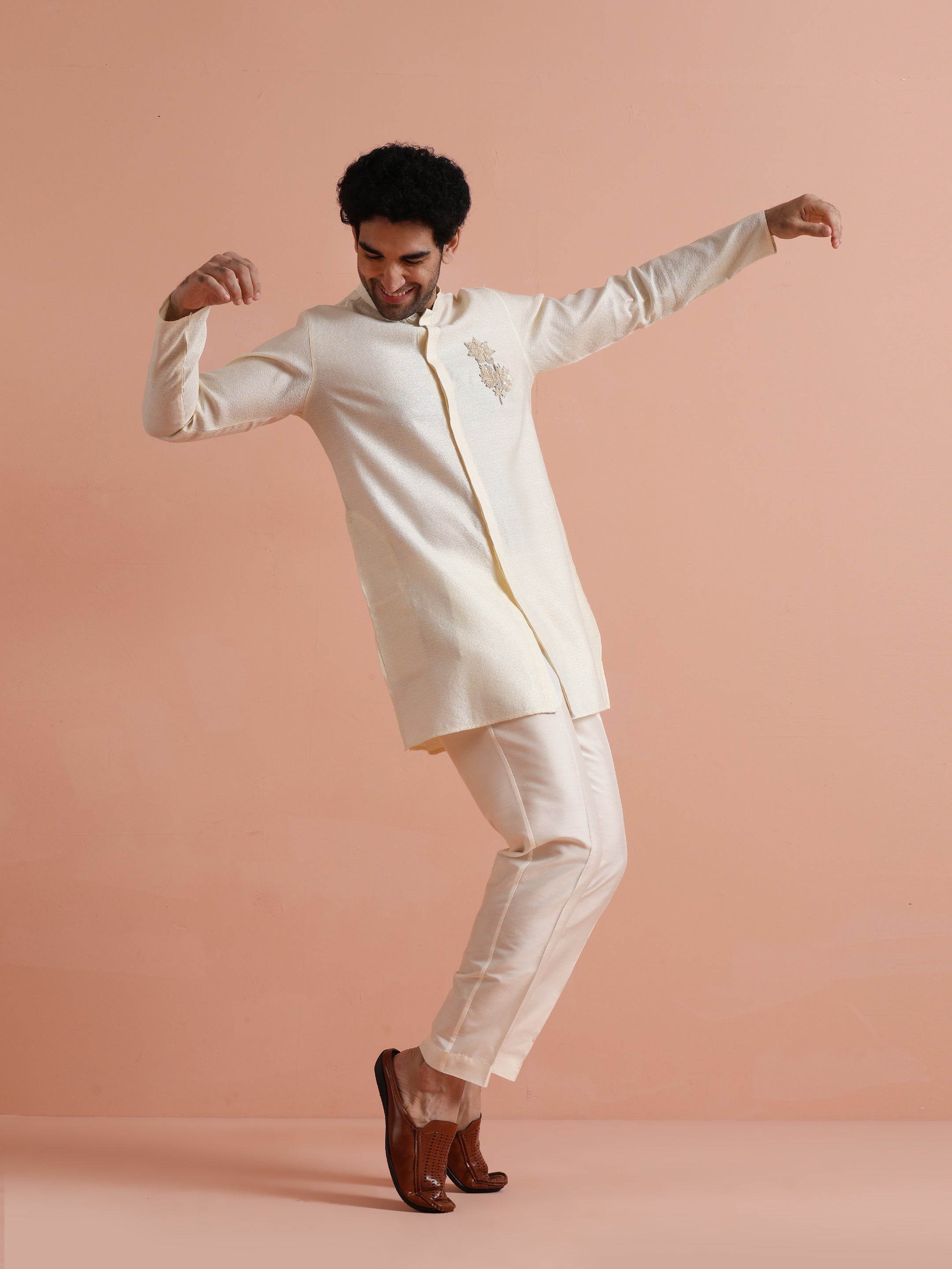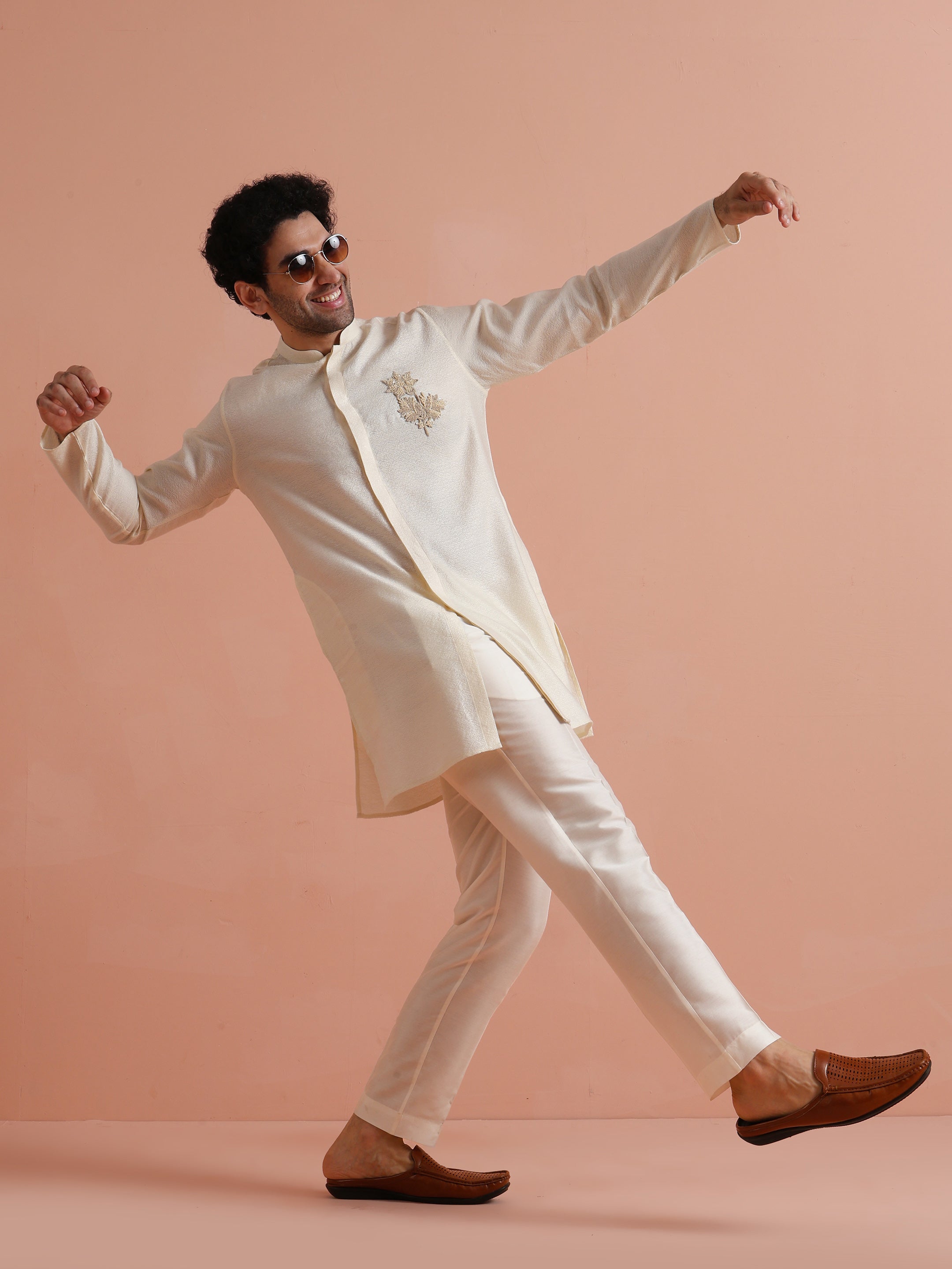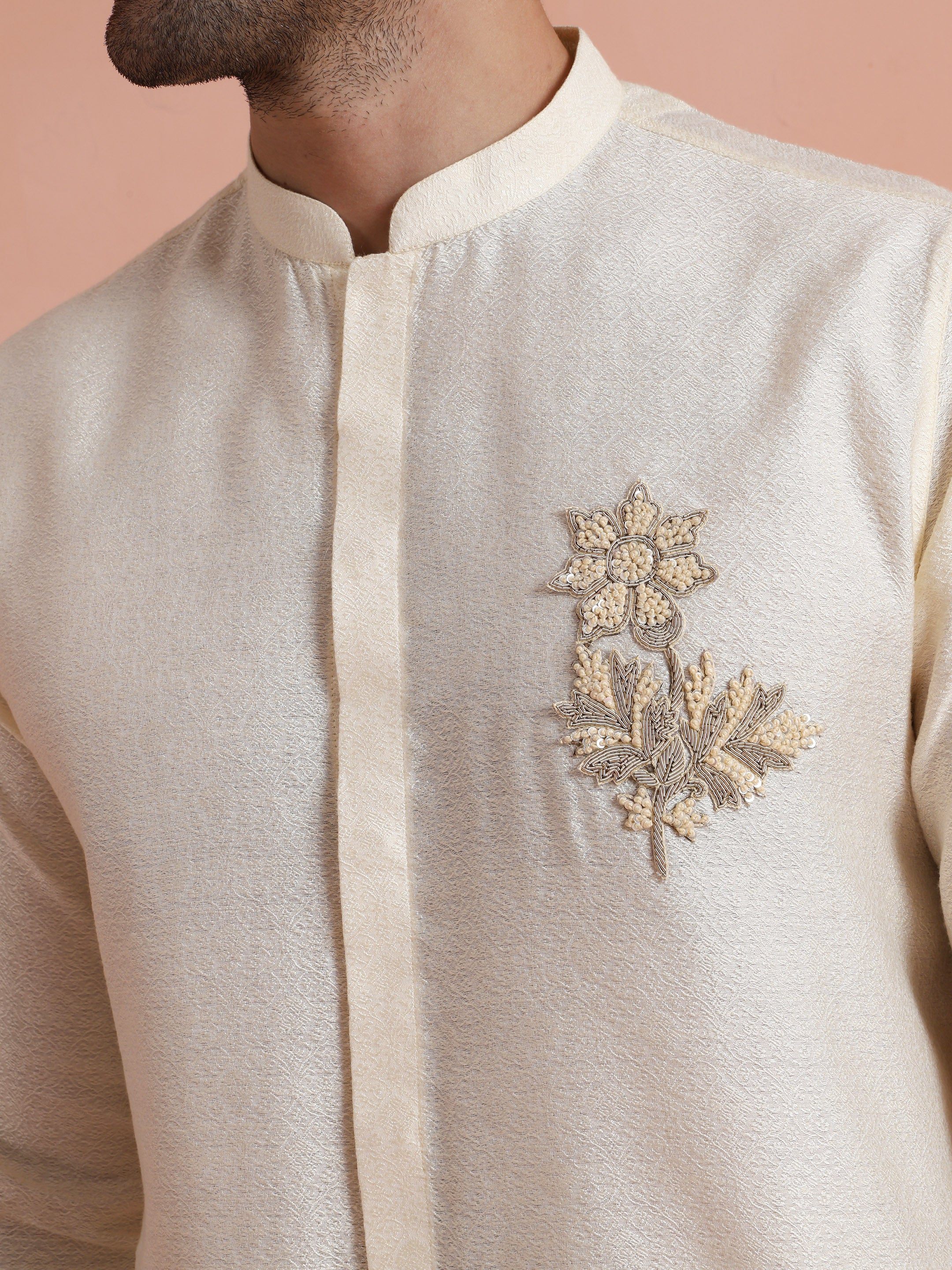 Kisah Menss Ivory Embroidered Mid Kurta elegant festive kurta with golden motif embroidery. Perfect for weddings, receptions, and traditional occasions.
