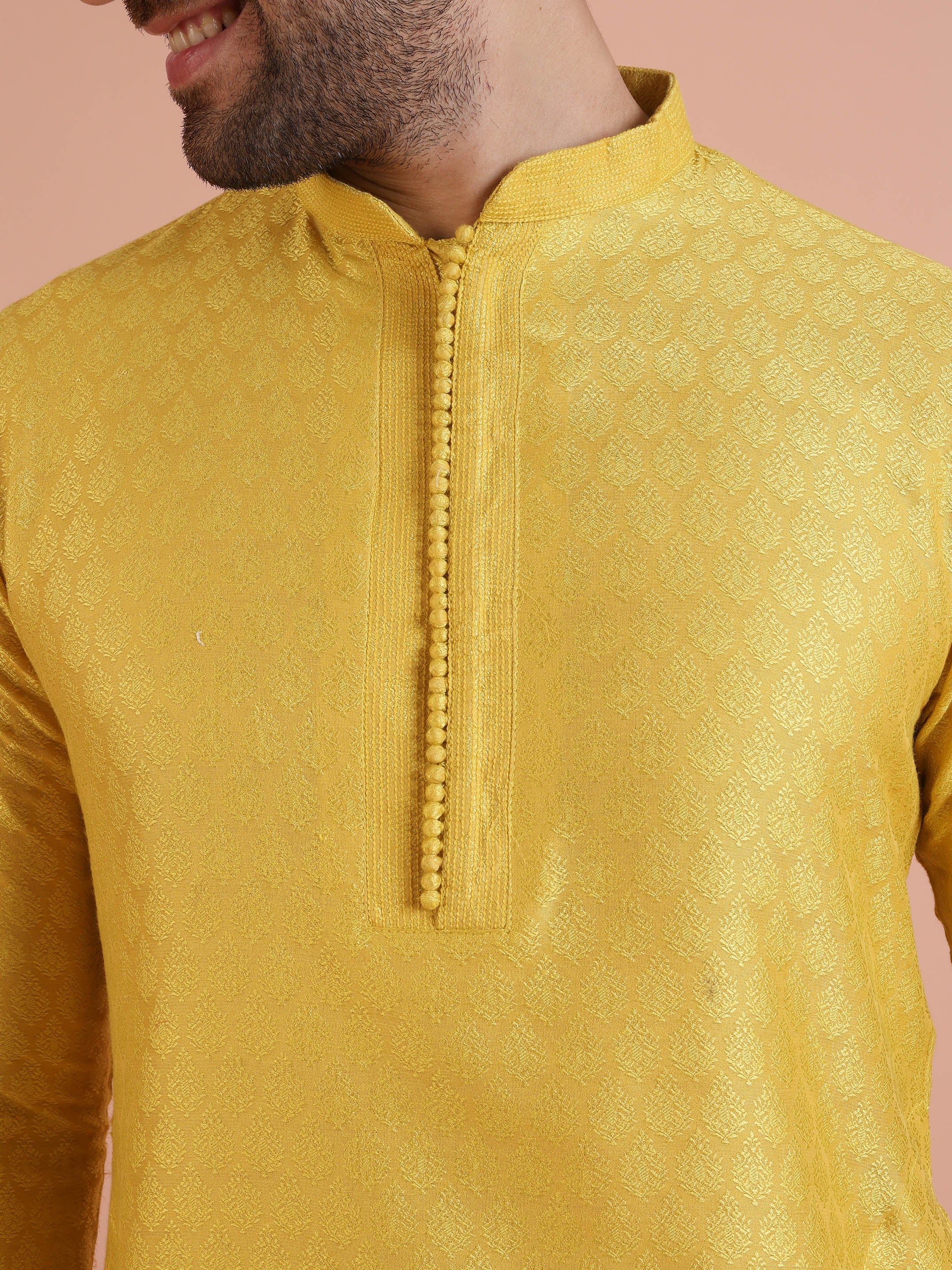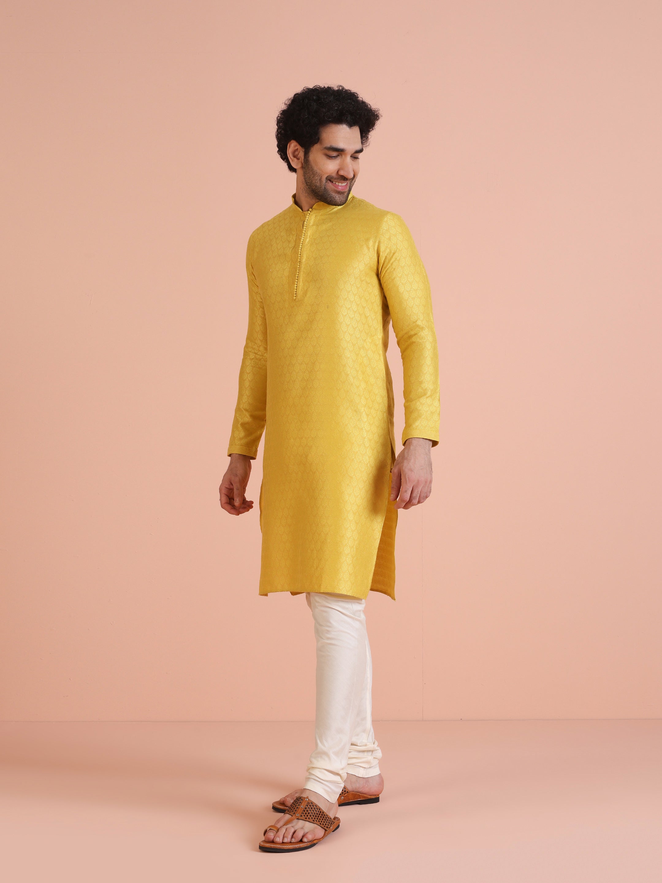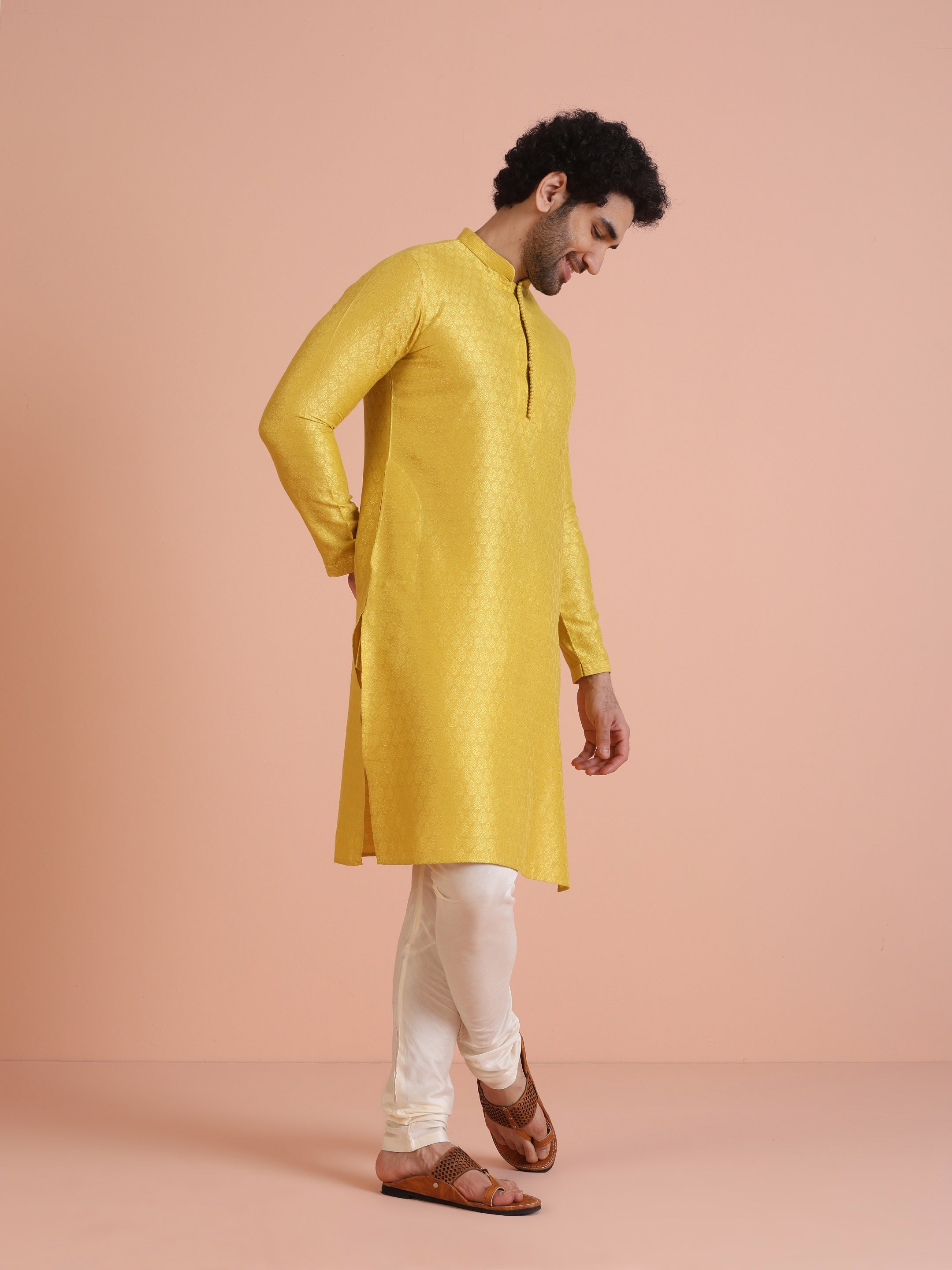 Step up your style game with our Yellow Kurta & Churidar set. Featuring woven jacquard details and a regular fit, this cotton blend outfit is perfect for any festive or casual occasion.