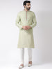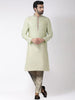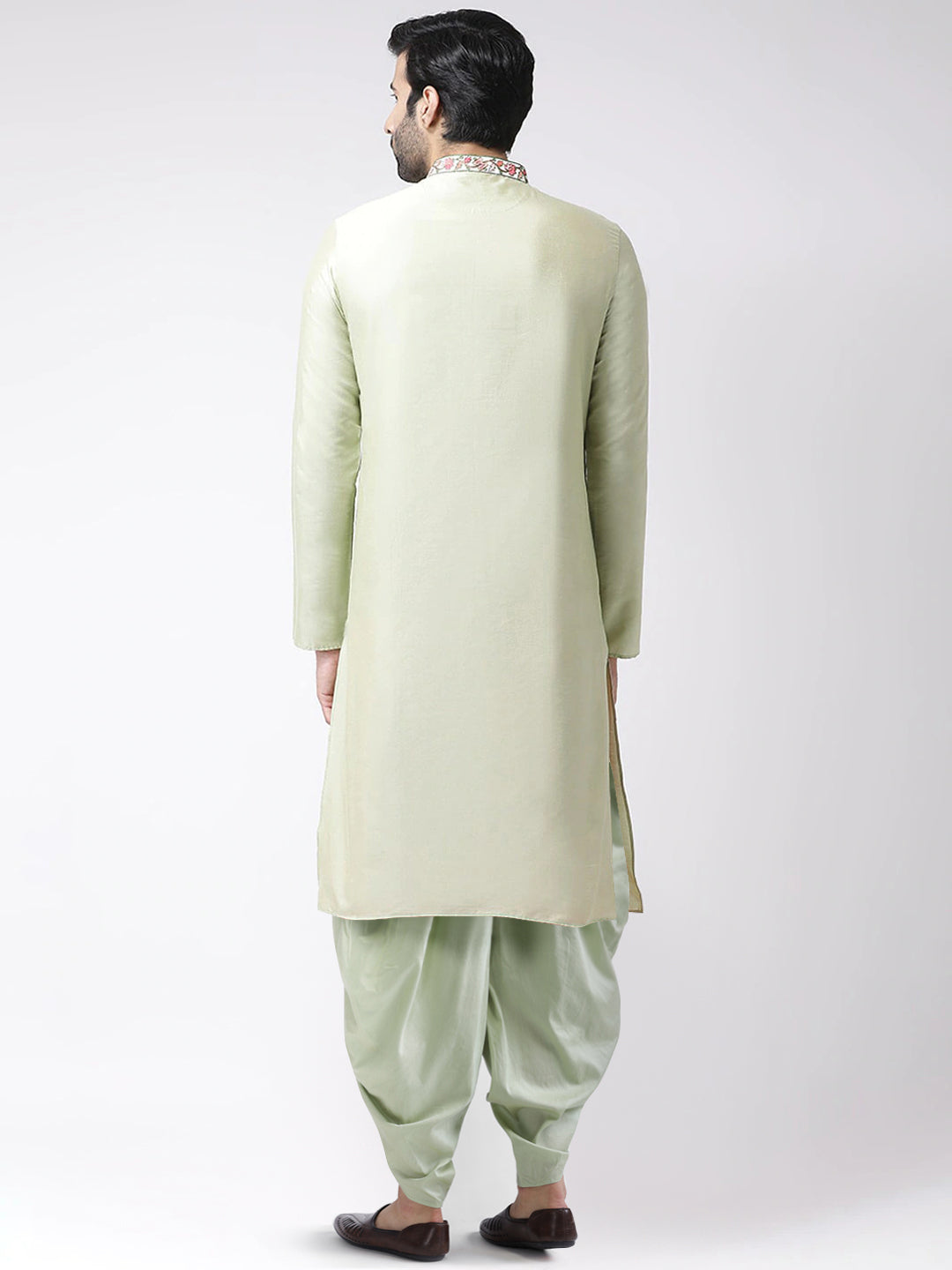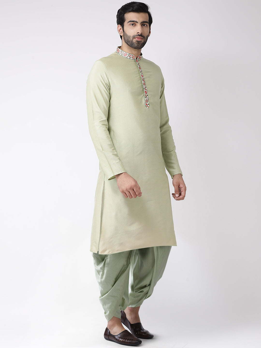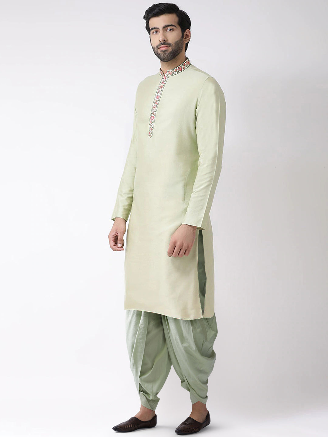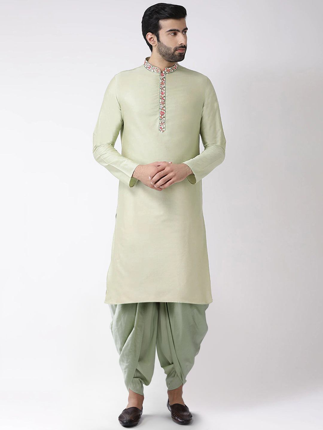 Enhance your festive style with our Green Kurta & Dhoti set. Made from a soft cotton blend and offering a regular fit, this solid-colored outfit is ideal for any occasion, blending comfort and tradition effortlessly.