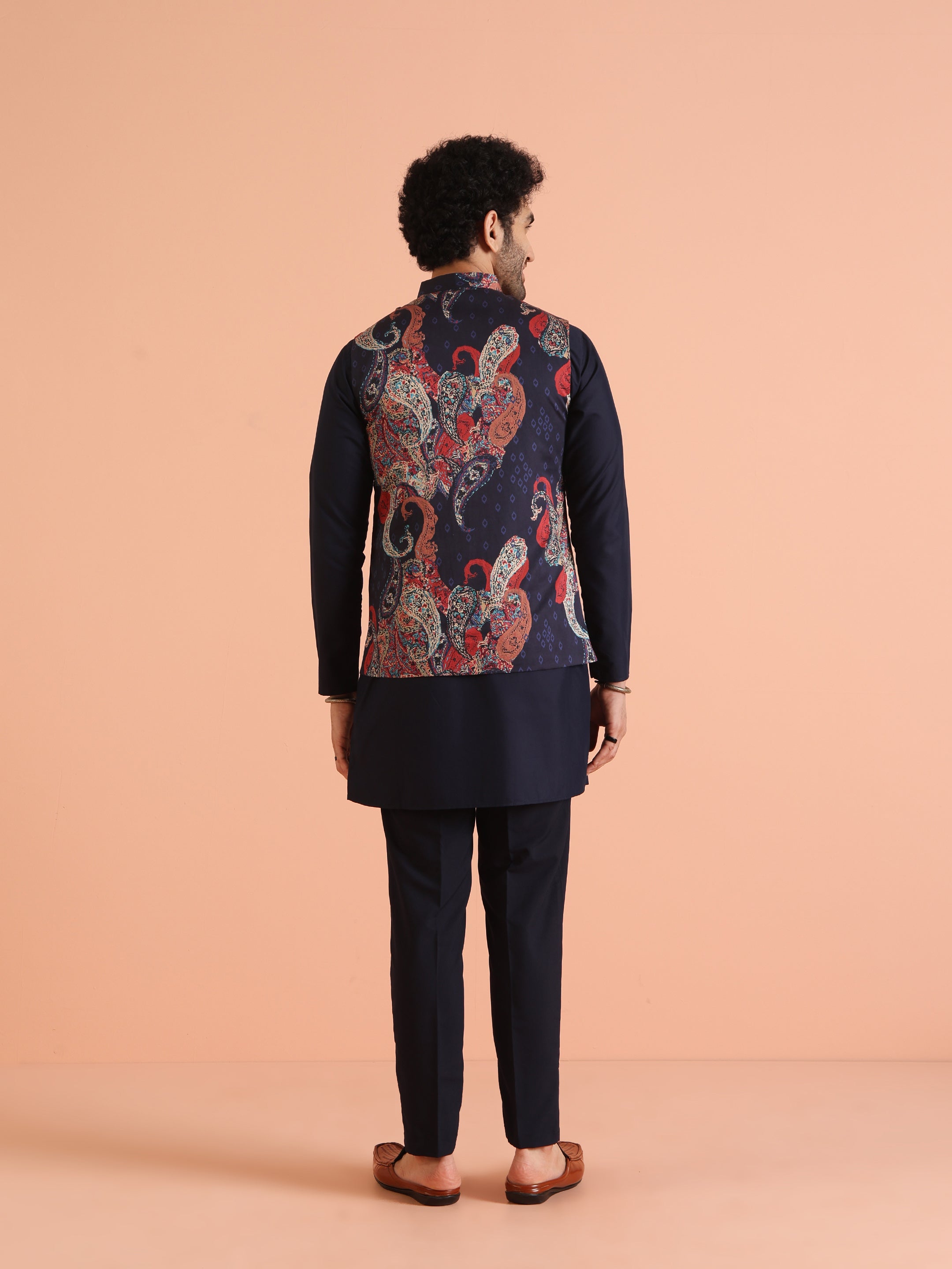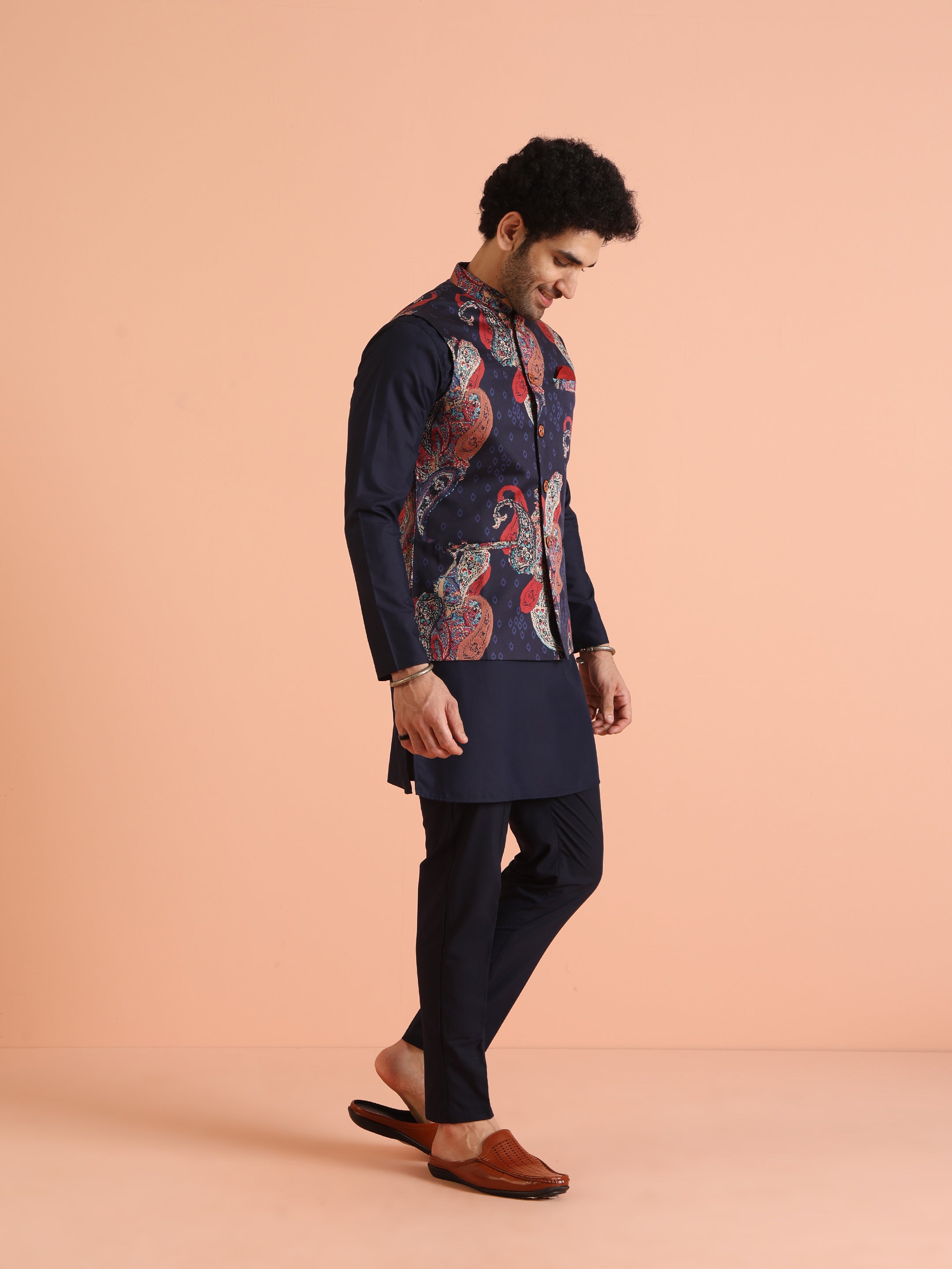 Experience classic elegance with this Men's Navy Blue Color Cotton Blend Kurta Jacket Trouser Set. The Printed Pattern adds a refined touch, while the breathable fabric ensures comfort throughout the day. Ideal for festive events or casual wear, this Set is a wardrobe essential.
