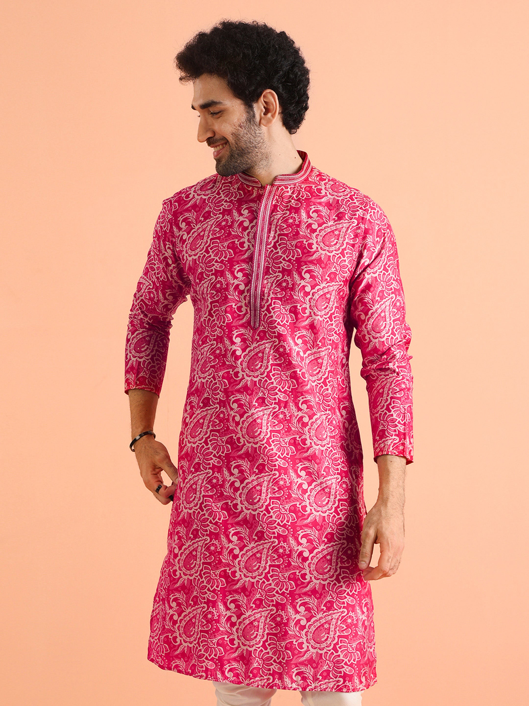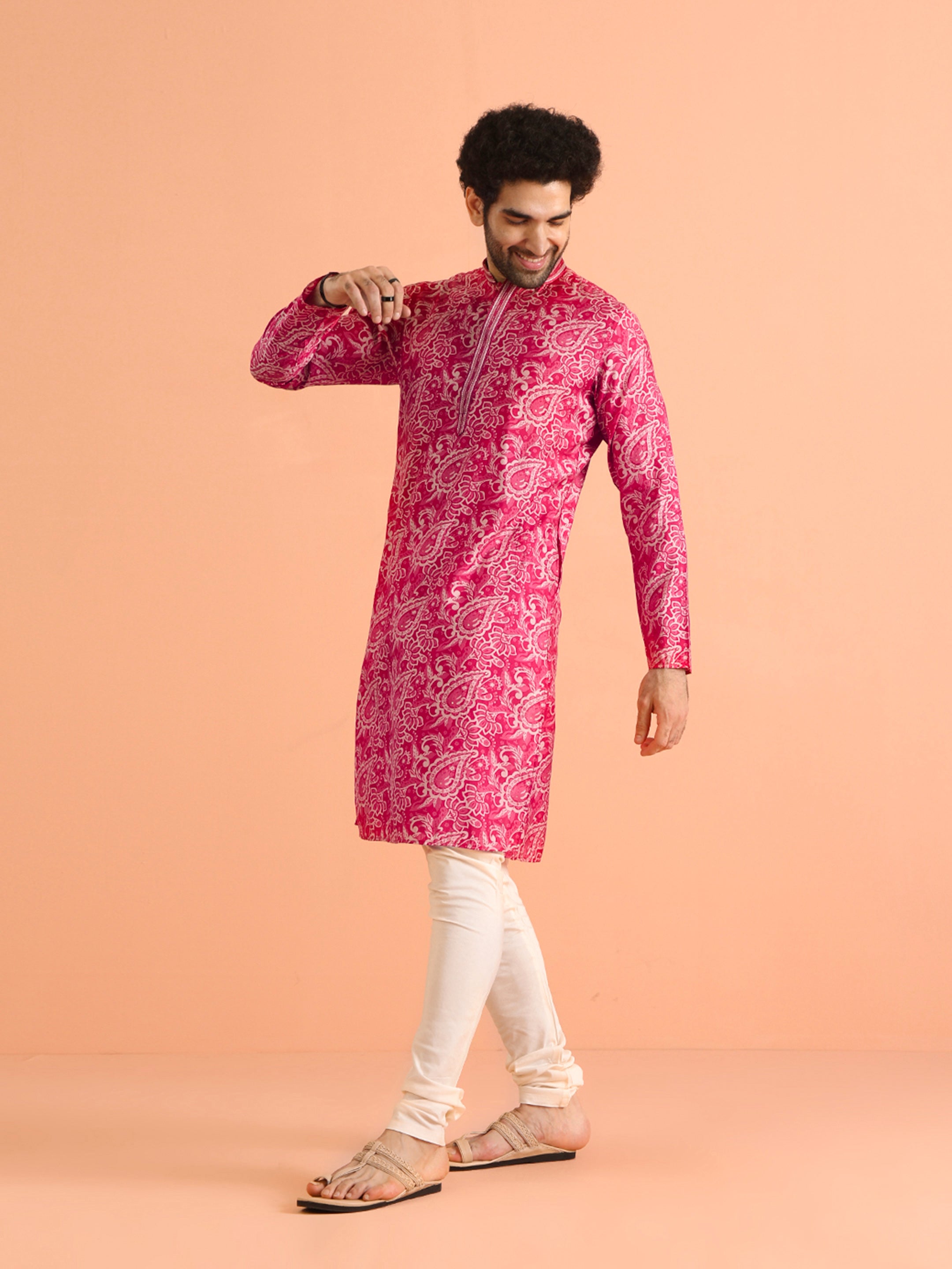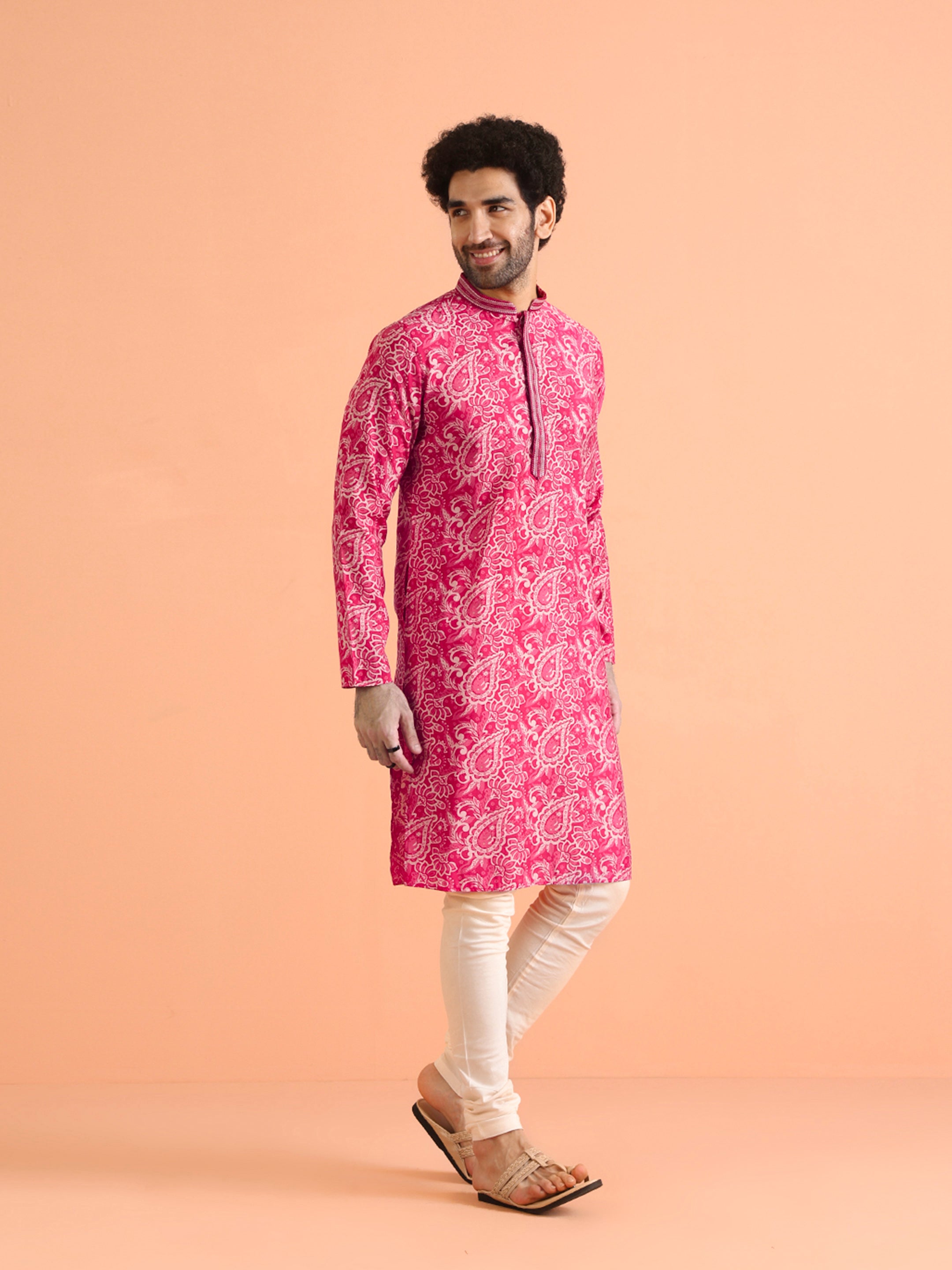 Experience classic elegance with this Men's Pink Color Cotton Blend Kurta Churidar Set. The Paisley Pattern adds a refined touch, while the breathable fabric ensures comfort throughout the day. Ideal for festive events or casual wear, this Kurta Trouser Set is a wardrobe essential.