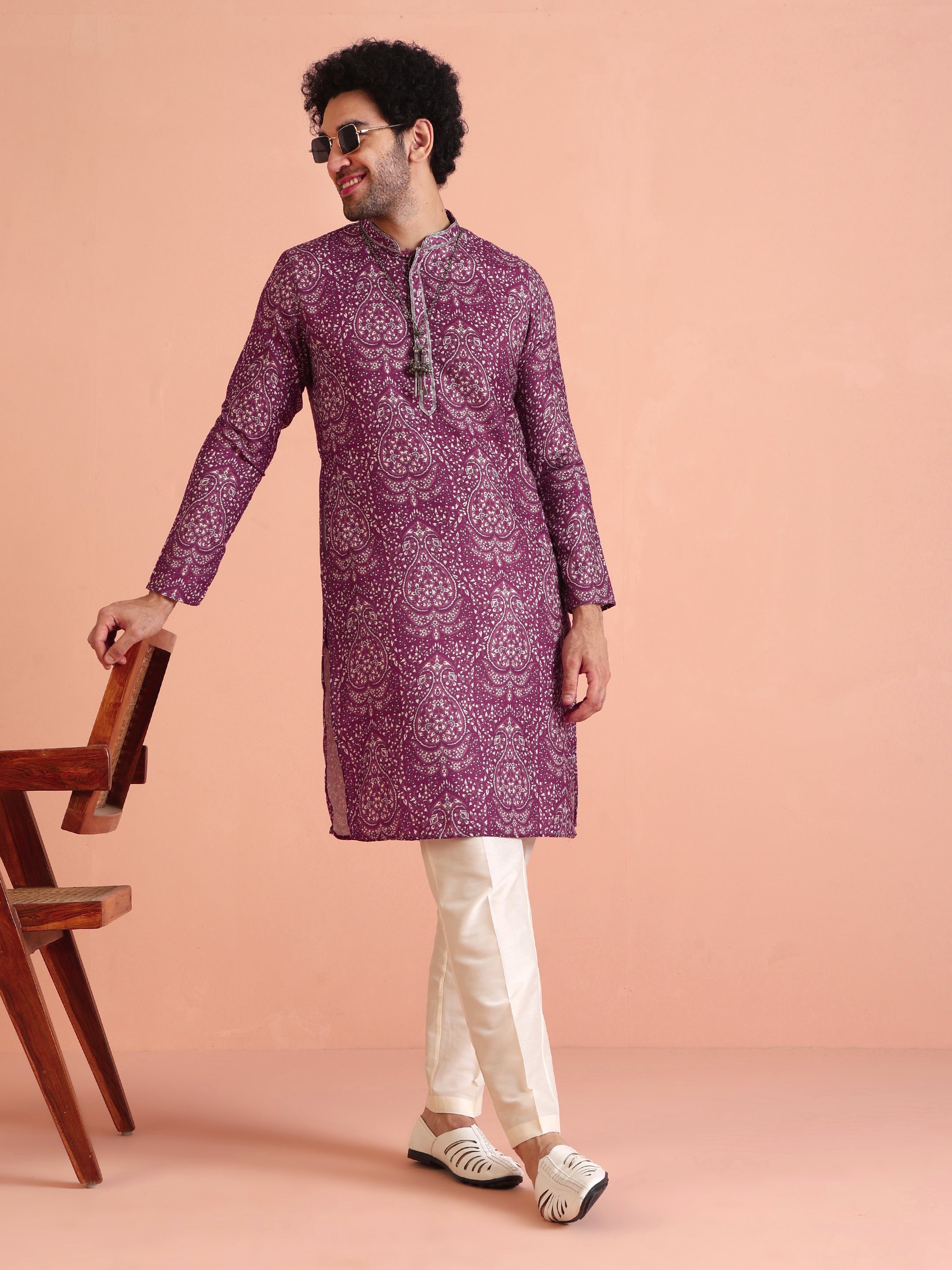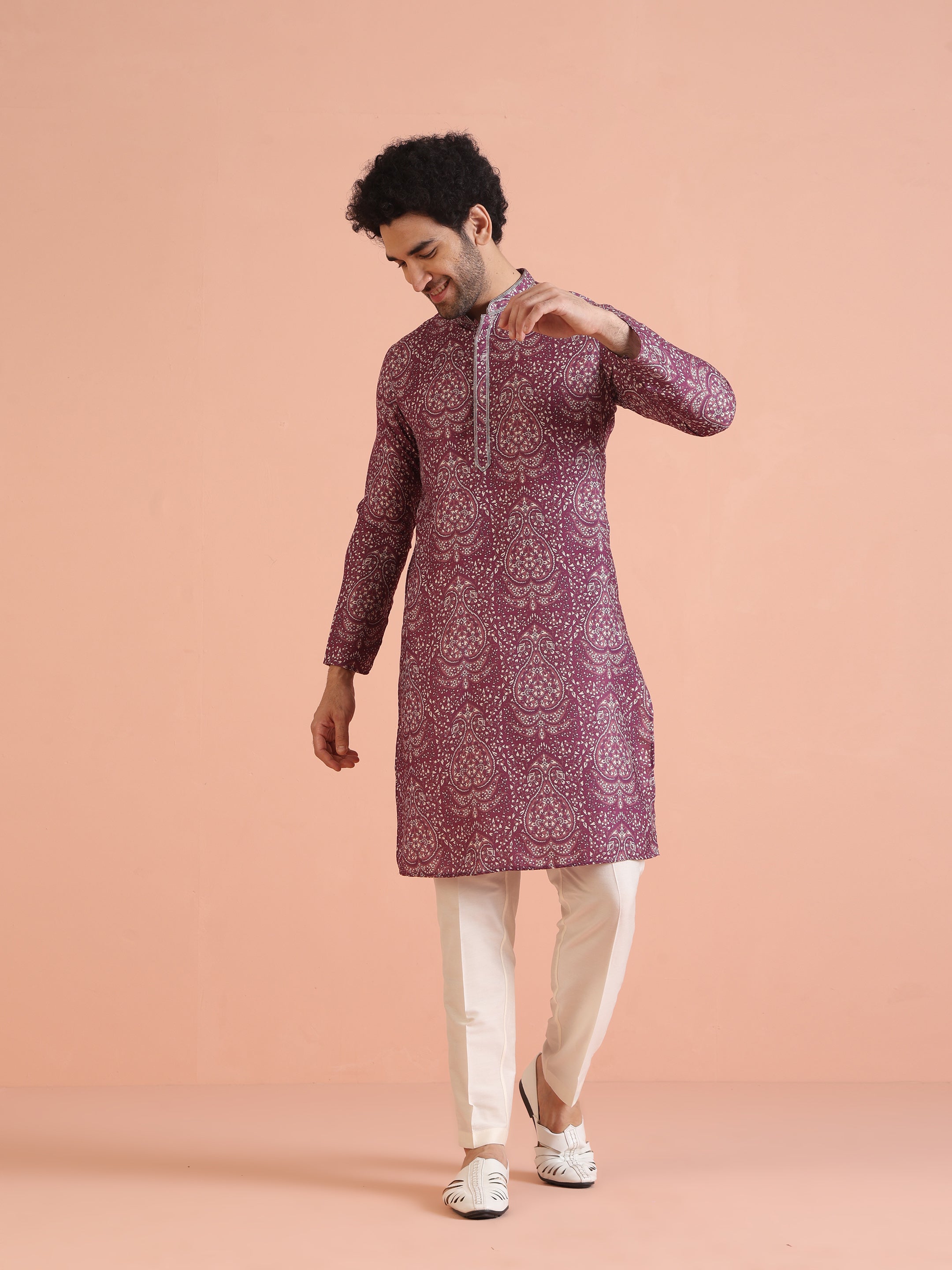 This Kurta Set with Maroon Color is an elegant mandarin collar style that is perfect for occasional wear. With a full sleeve Printed design and comfortable fabric, it will make you look stylish.