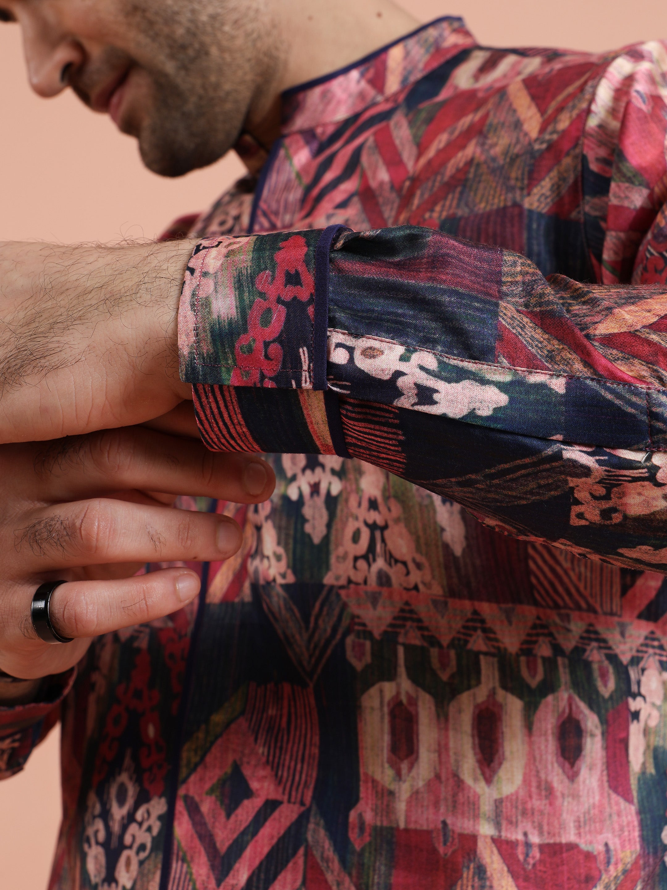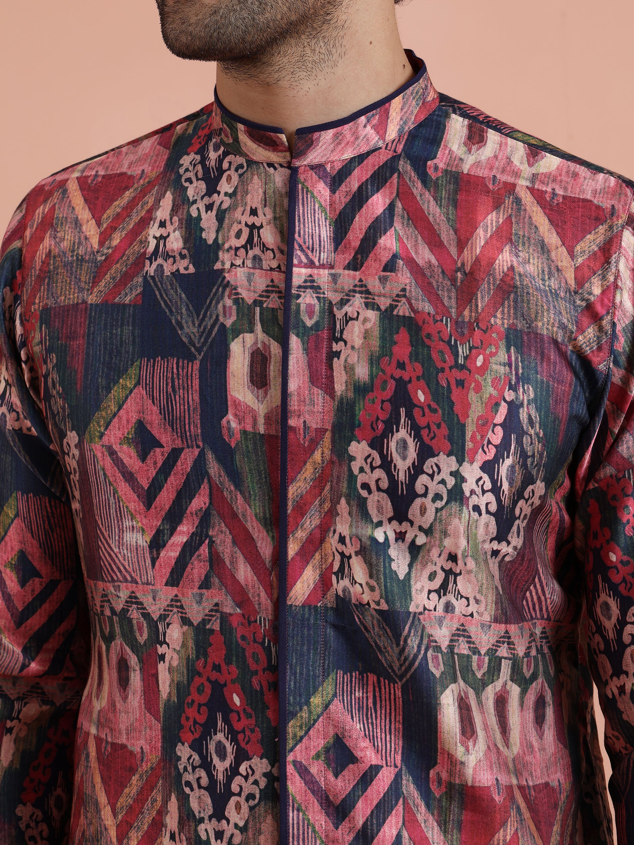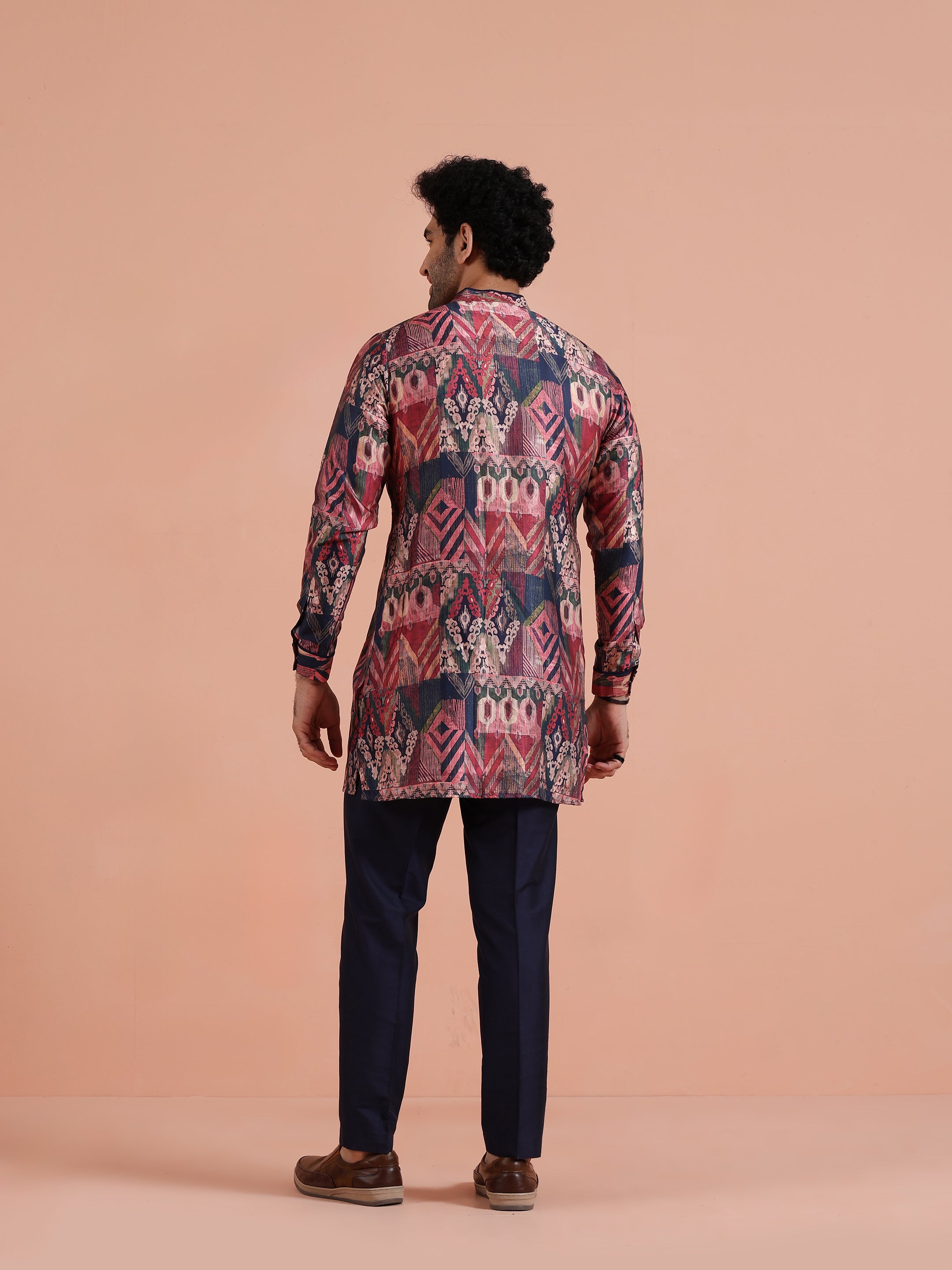 Kisah Menss Multicolor Printed Mid Kurta bold ikat-inspired motifs in vibrant tones. Perfect festive kurta for parties, weddings, and modern ethnic celebrations.