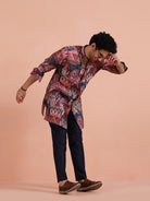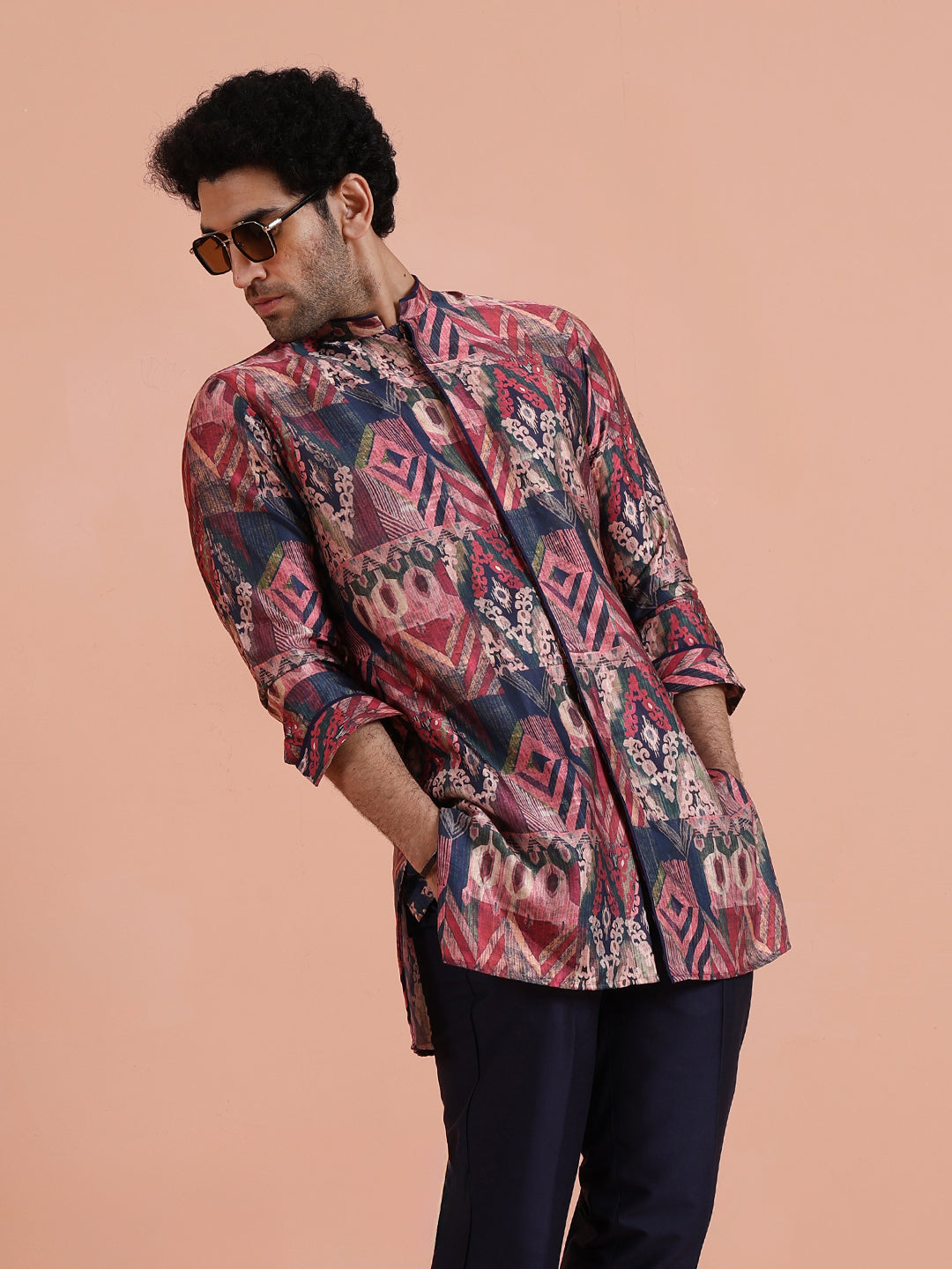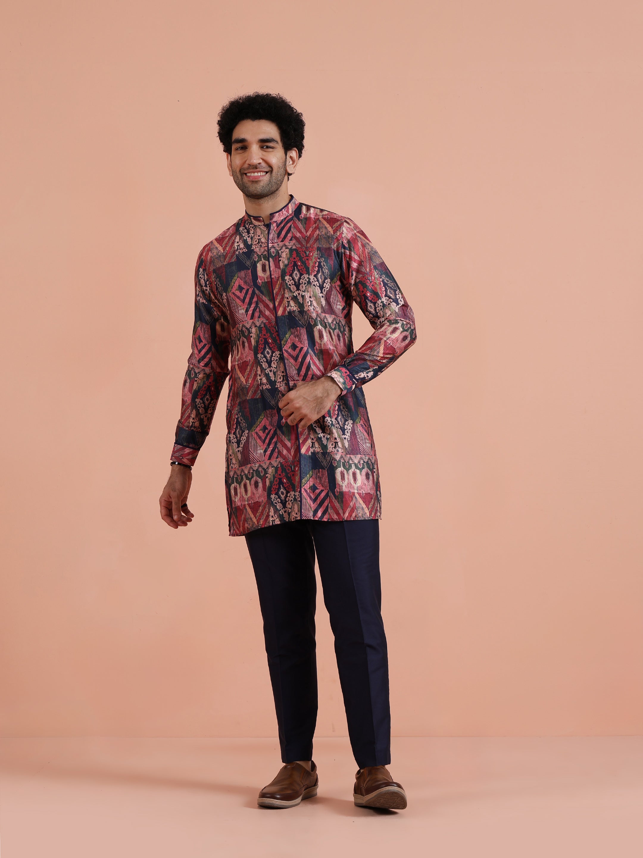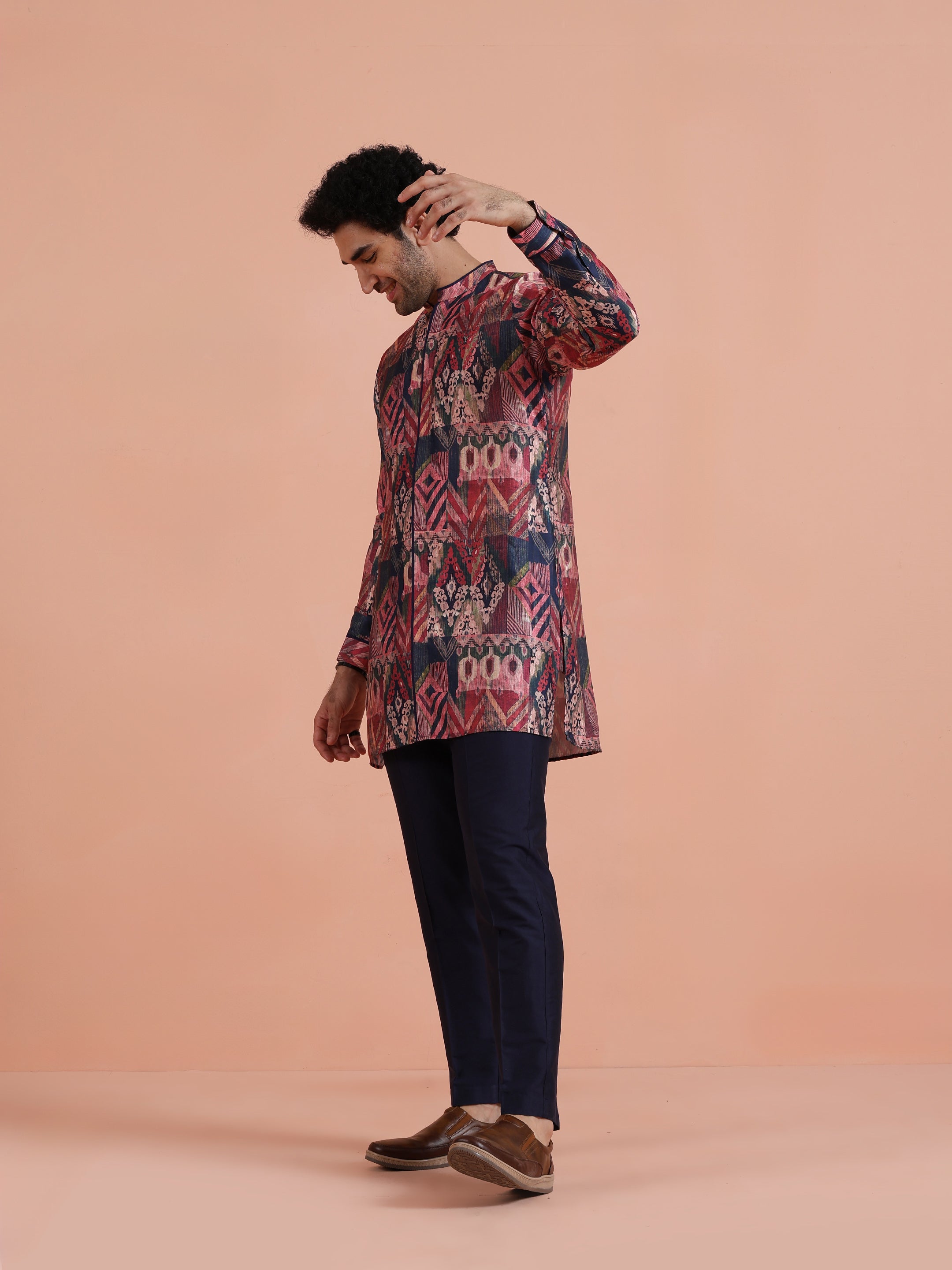 Kisah Menss Multicolor Printed Mid Kurta bold ikat-inspired motifs in vibrant tones. Perfect festive kurta for parties, weddings, and modern ethnic celebrations.