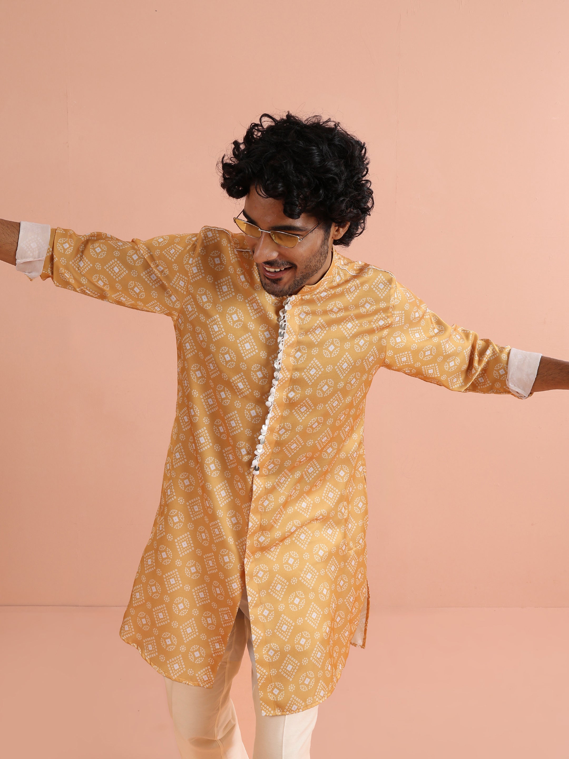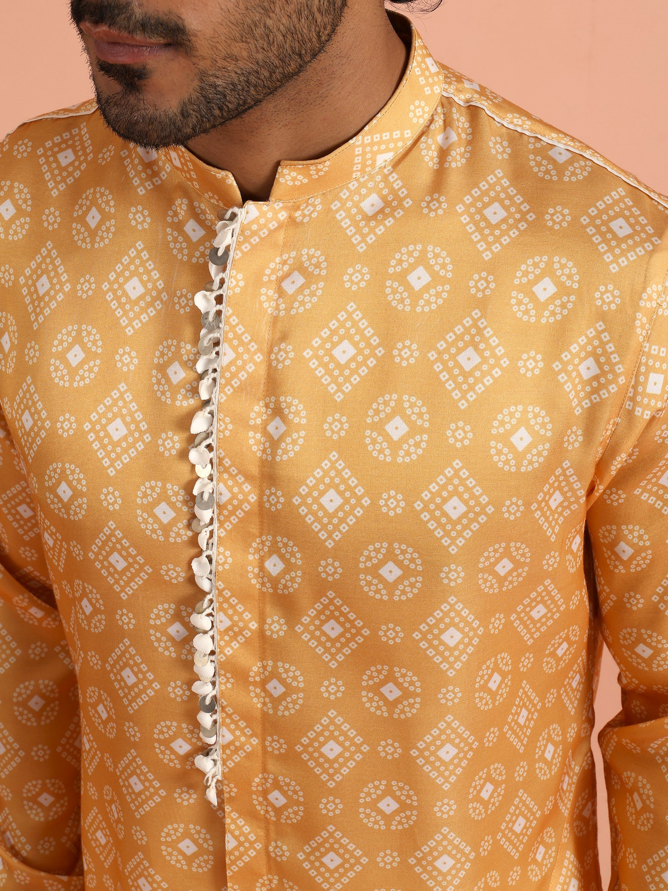 Kisah Menss Mustard Bandhani Printed Mid Kurta festive printed kurta with a modern cut. Perfect for haldi, weddings, and celebratory gatherings.