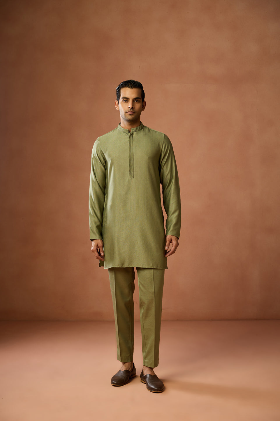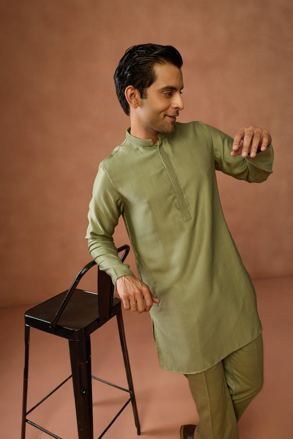 Kisah Menss olive green silk blend mid kurta with mandarin collar and placket closure. Perfect for festive, wedding and puja occasions.