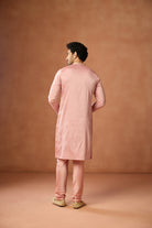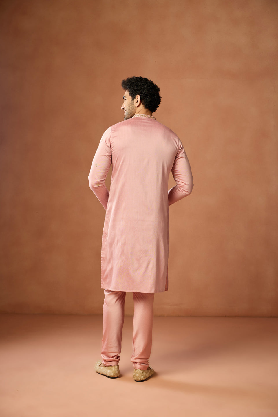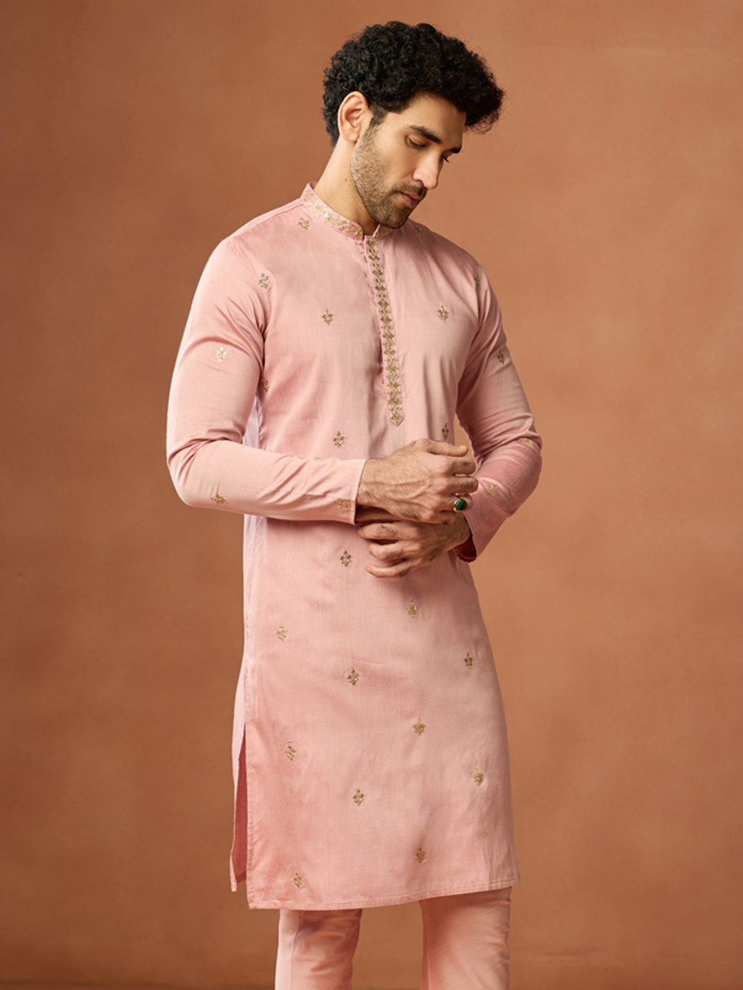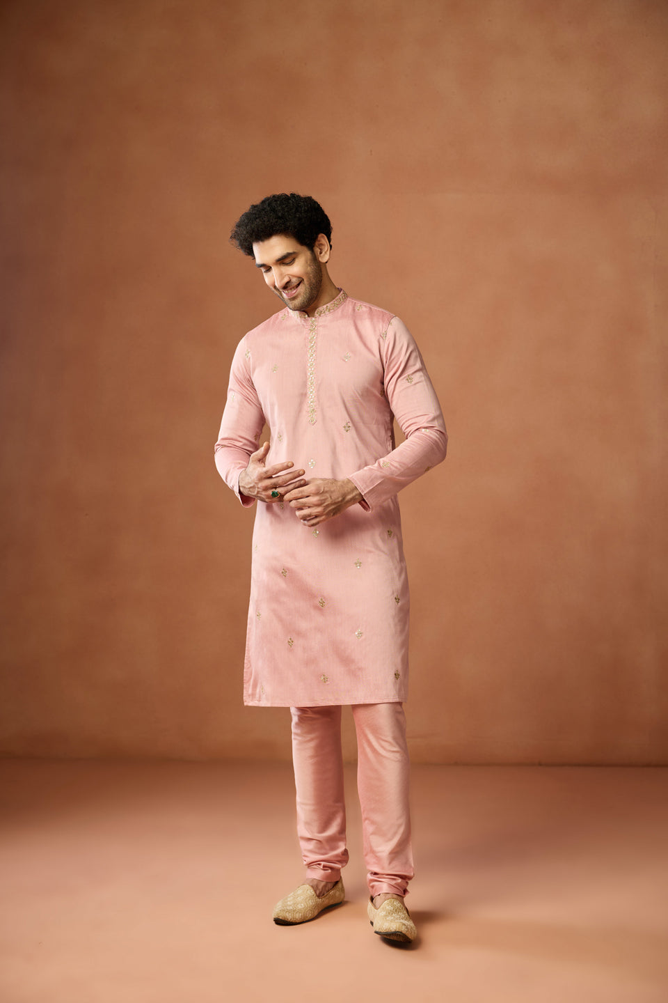 Kisah Menss pastel pink silk blend embroidered kurta with gold zari motifs, mandarin collar and full sleeves. Ideal festive wear for weddings, sangeet and receptions.