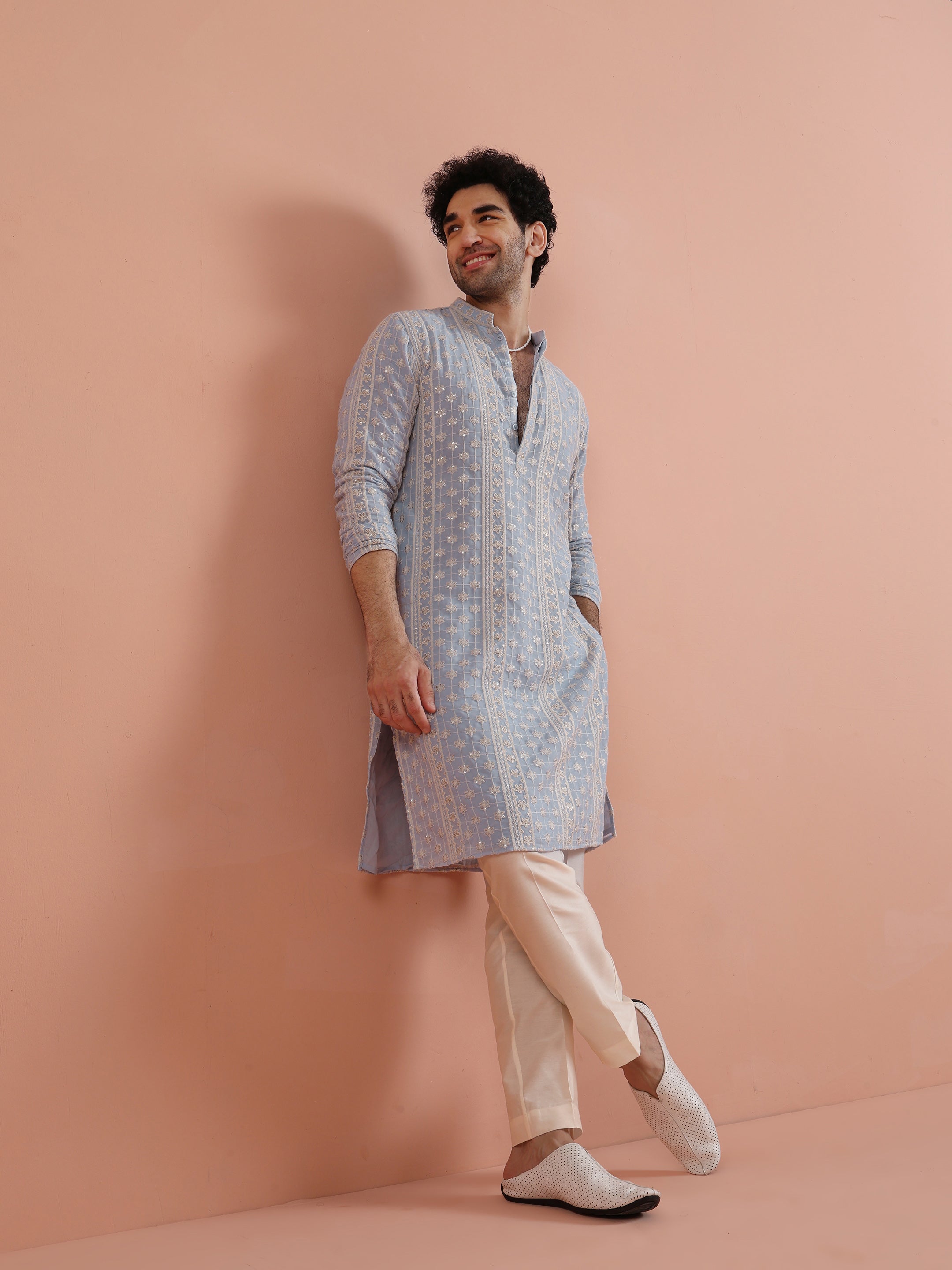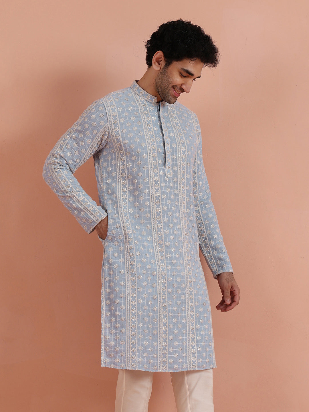 Sky blue embroidered georgette long kurta with floral sequin work, mandarin collar & side slits an elegant festive & wedding wear choice.