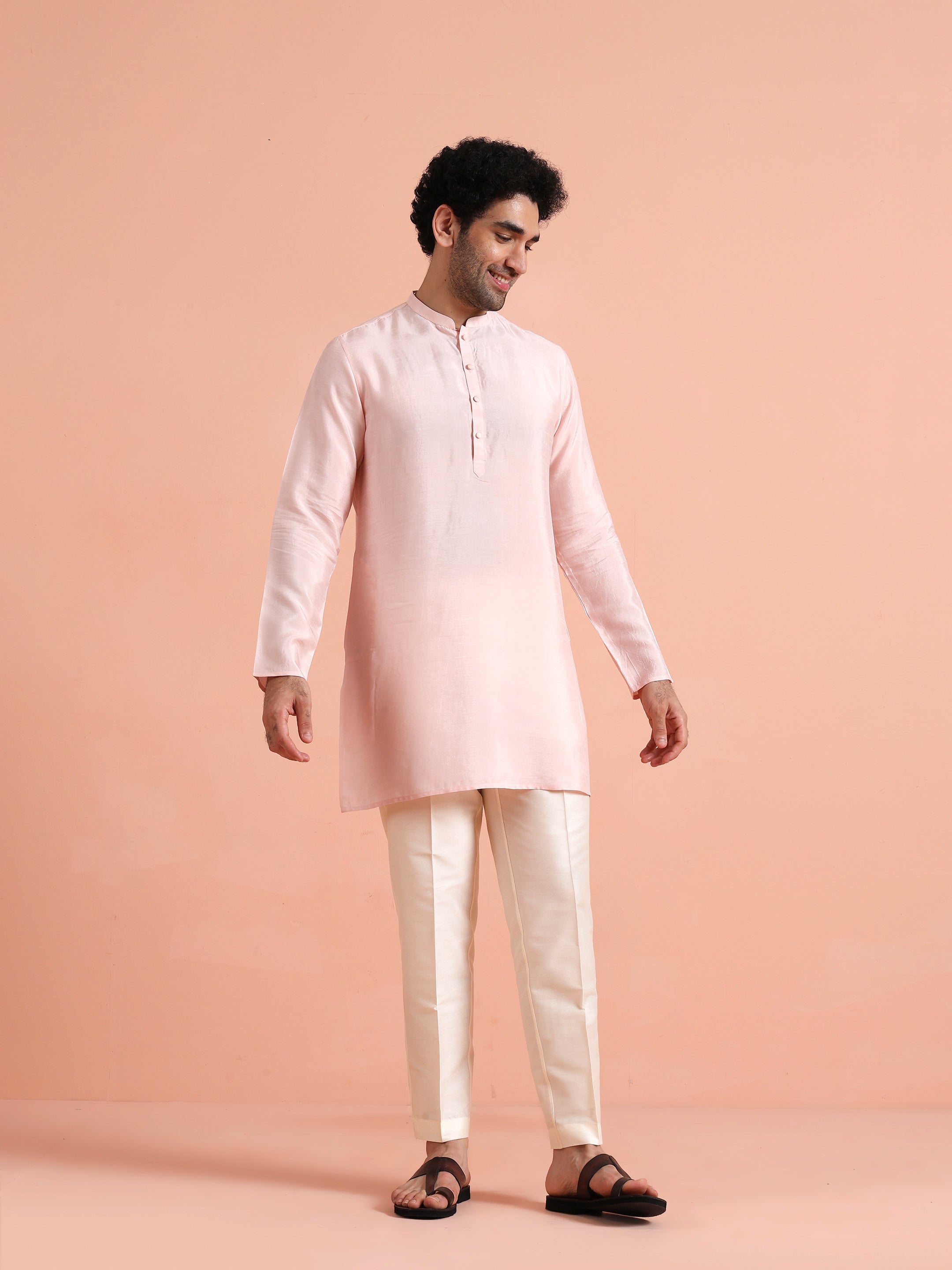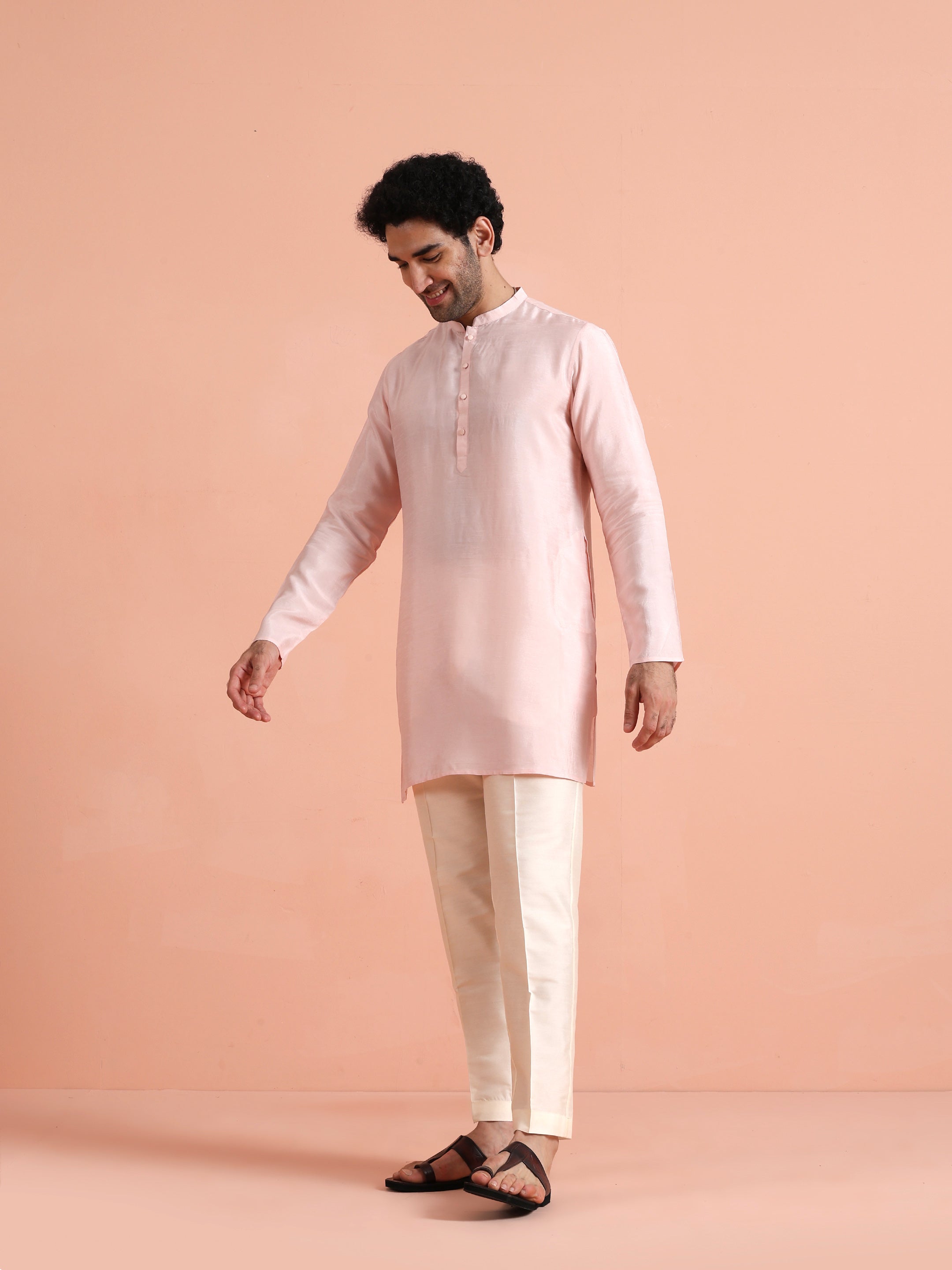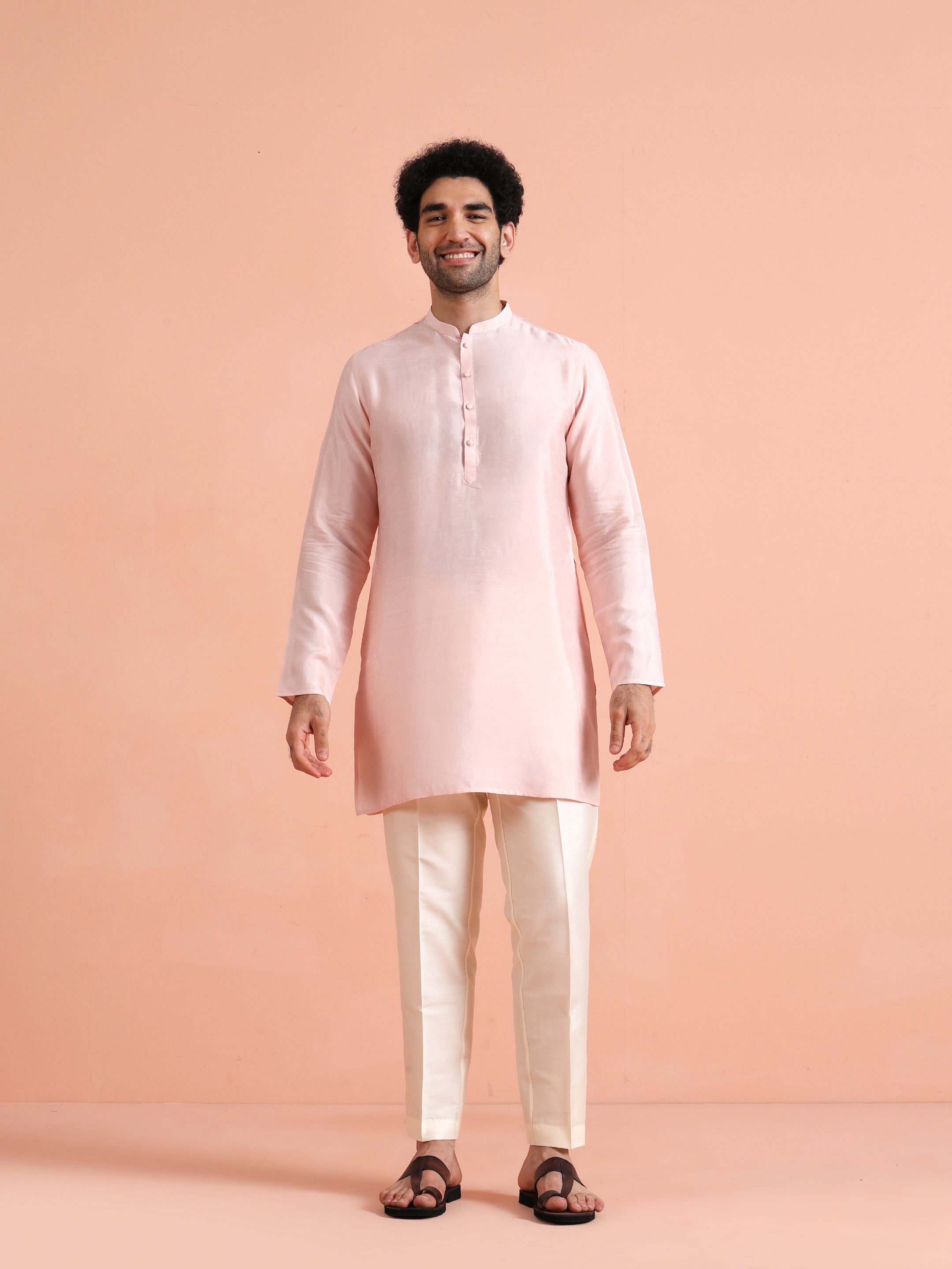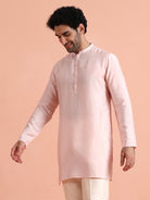 Kisah Menss Pink Mid Kurta pastel festive kurta in cotton-silk blend with subtle sheen. Perfect for haldi, weddings, and daytime occasions.