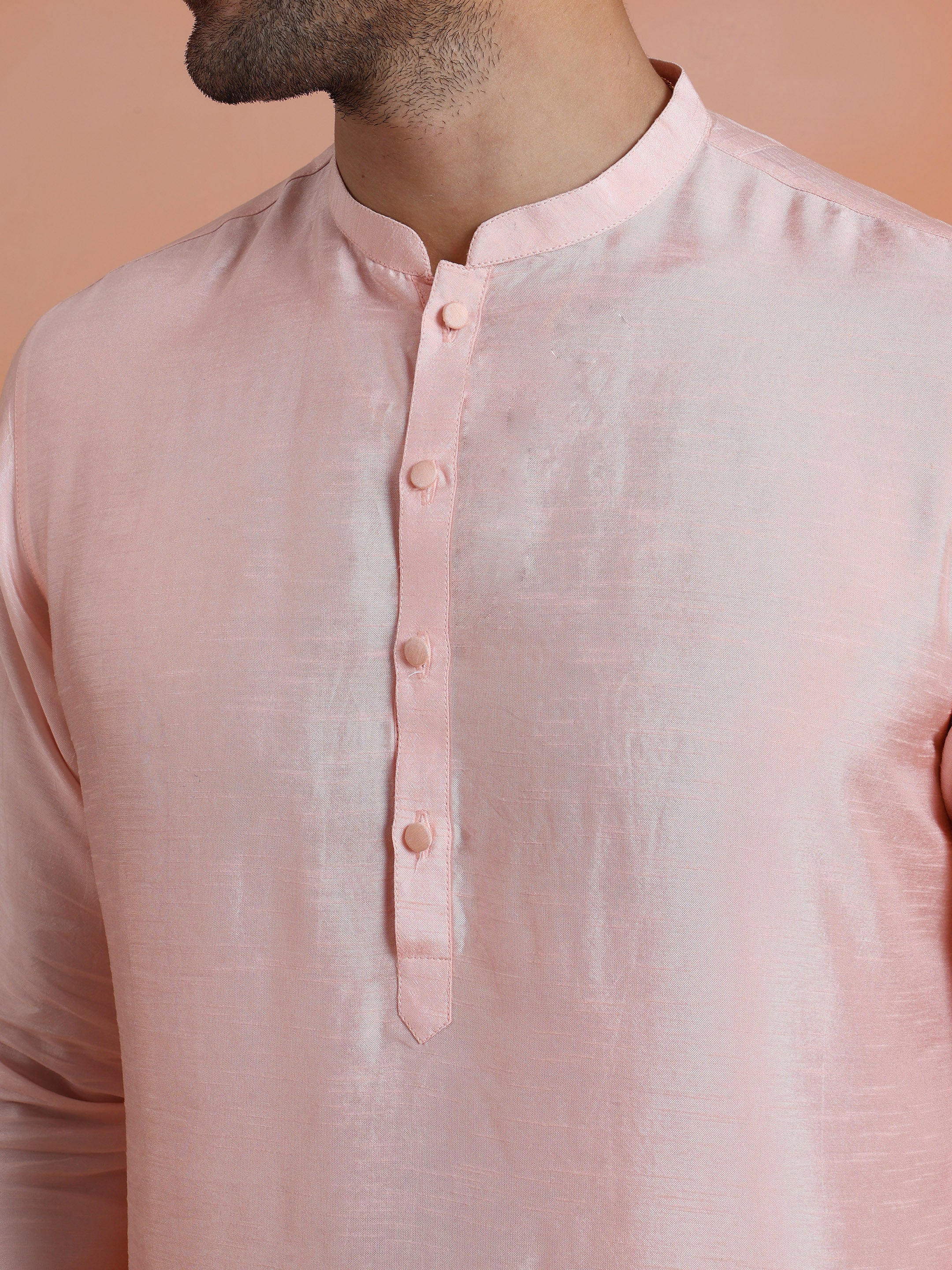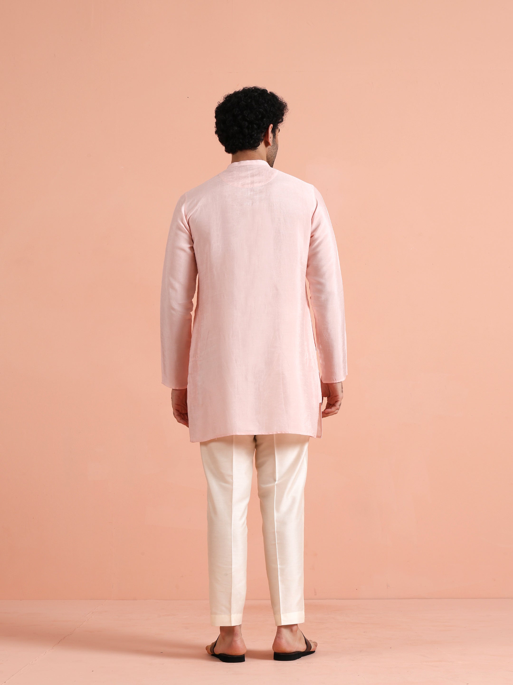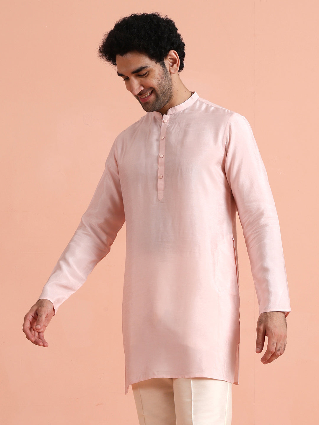 Kisah Menss Pink Mid Kurta pastel festive kurta in cotton-silk blend with subtle sheen. Perfect for haldi, weddings, and daytime occasions.