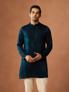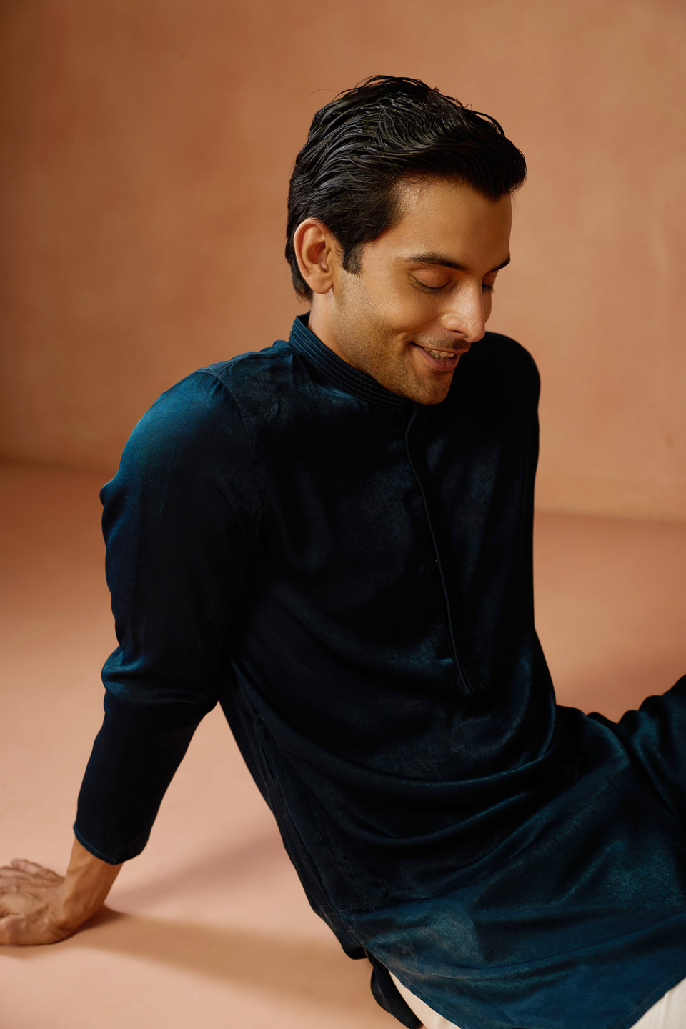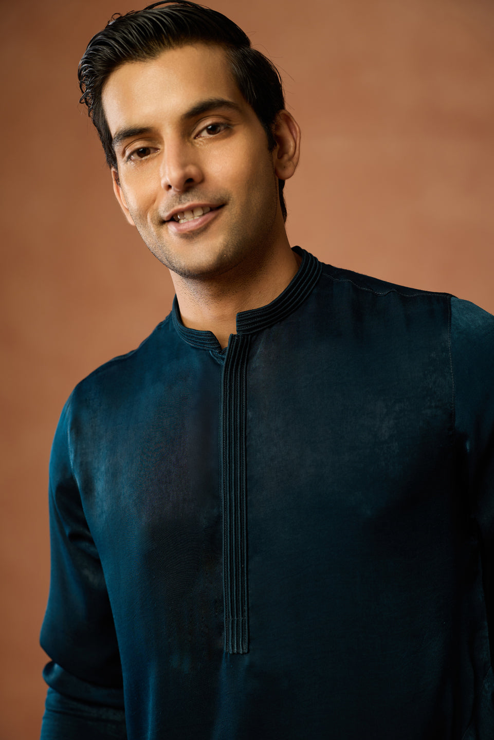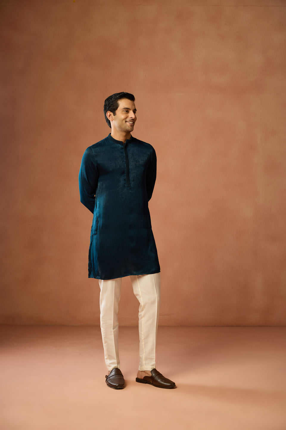 Kisah Teal Blue Silk Blend Mid Kurta Trouser Set in textured solid fabric elegant festive ethnic wear for weddings, receptions & pujas.
