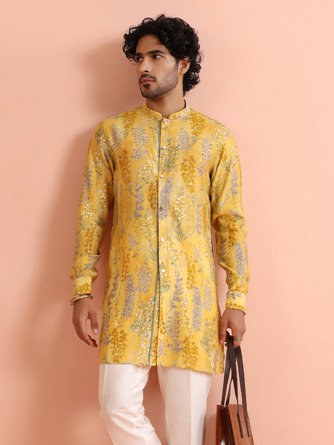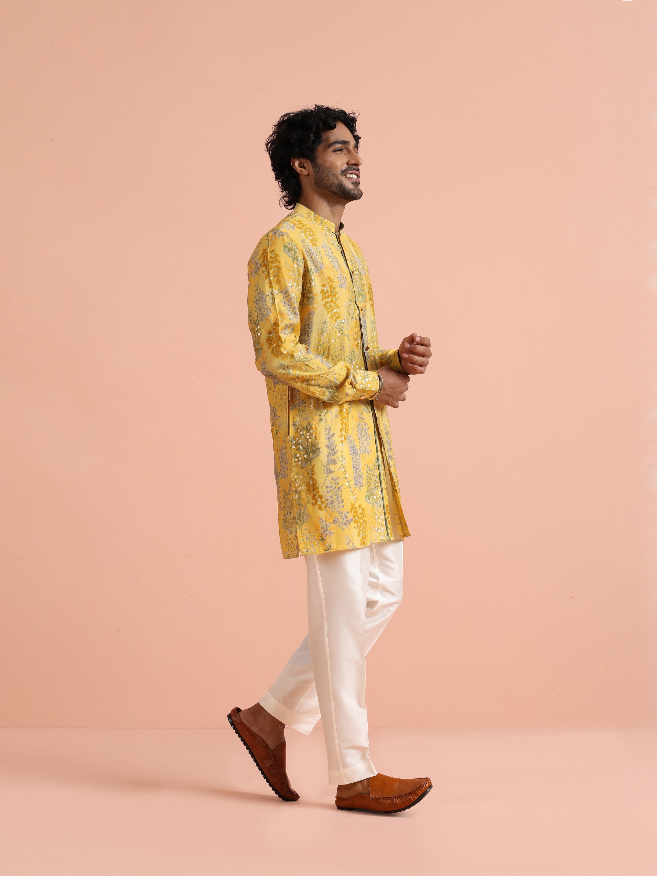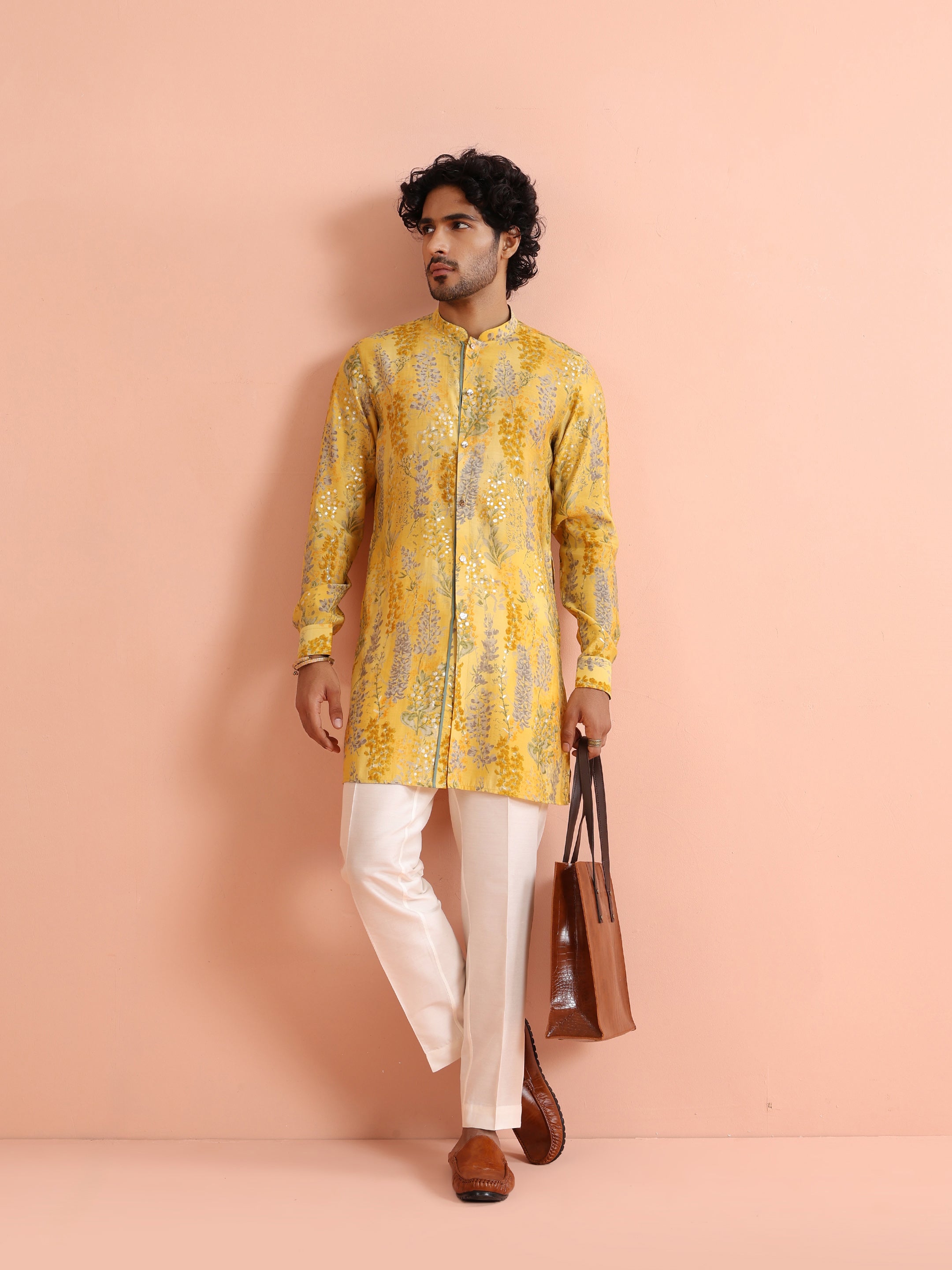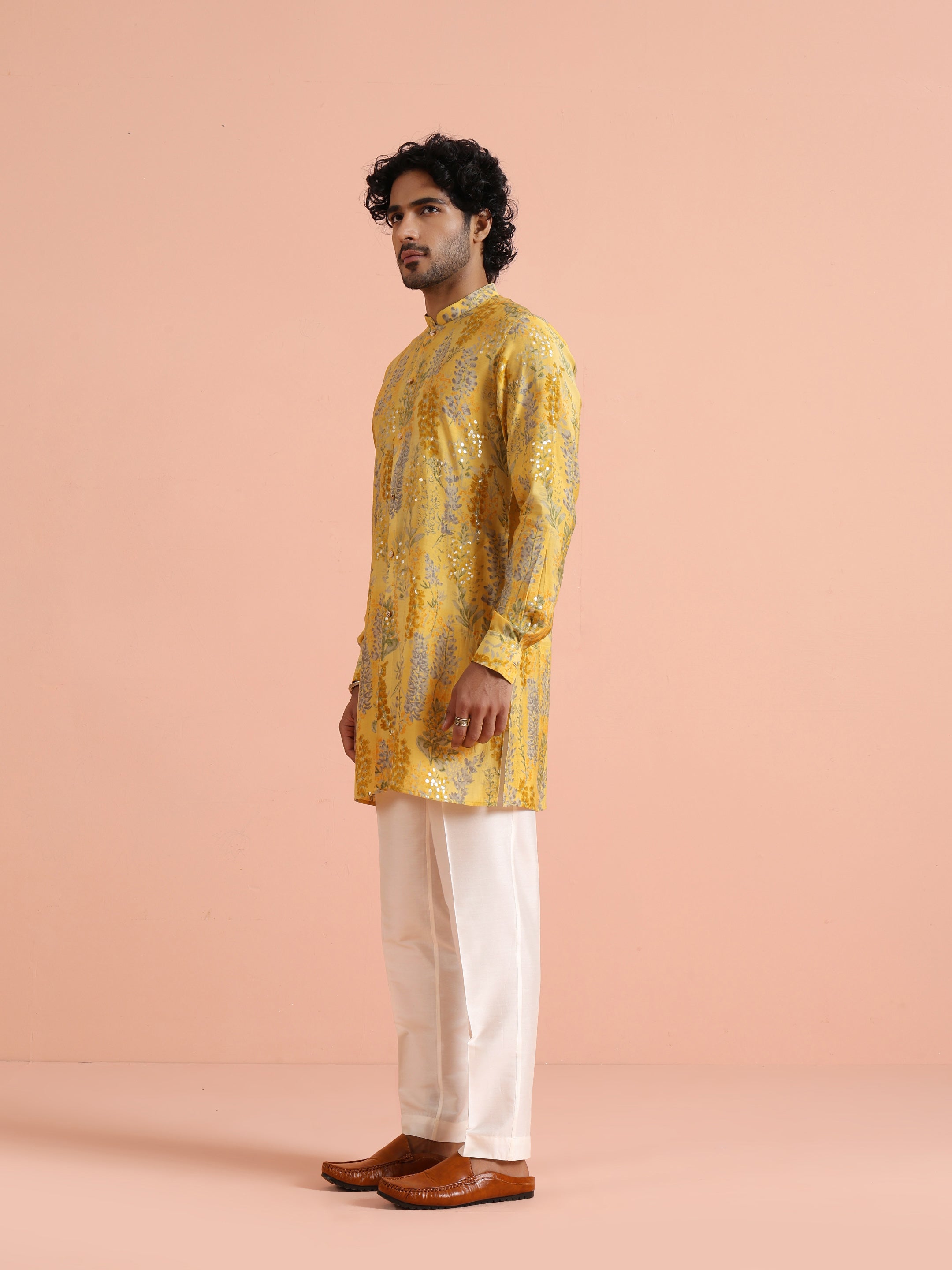 Kisah Menss Yellow Sequinned Mid Kurta festive floral kurta with sequins for haldi, weddings, and celebrations. Bright, elegant, and stylish.