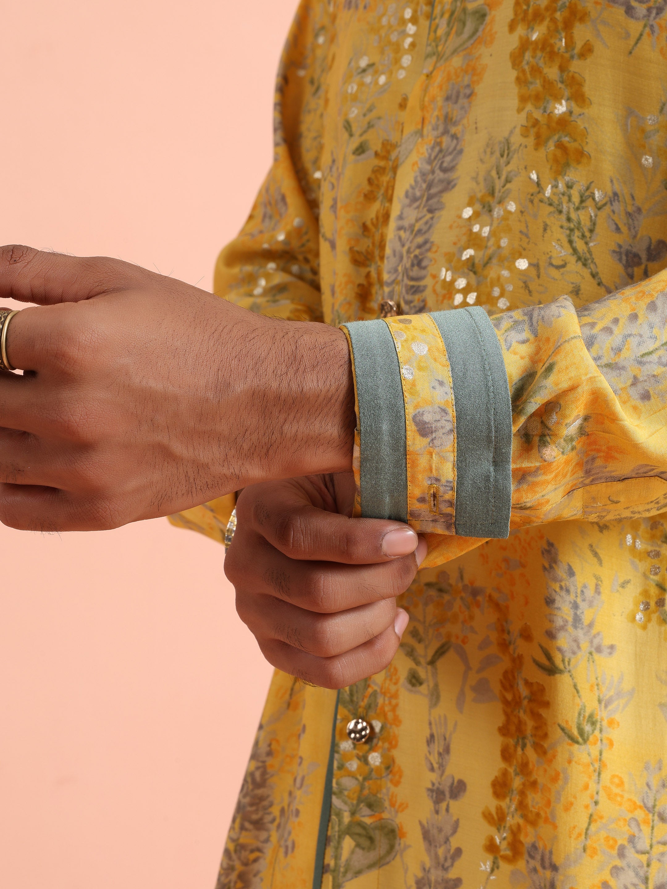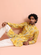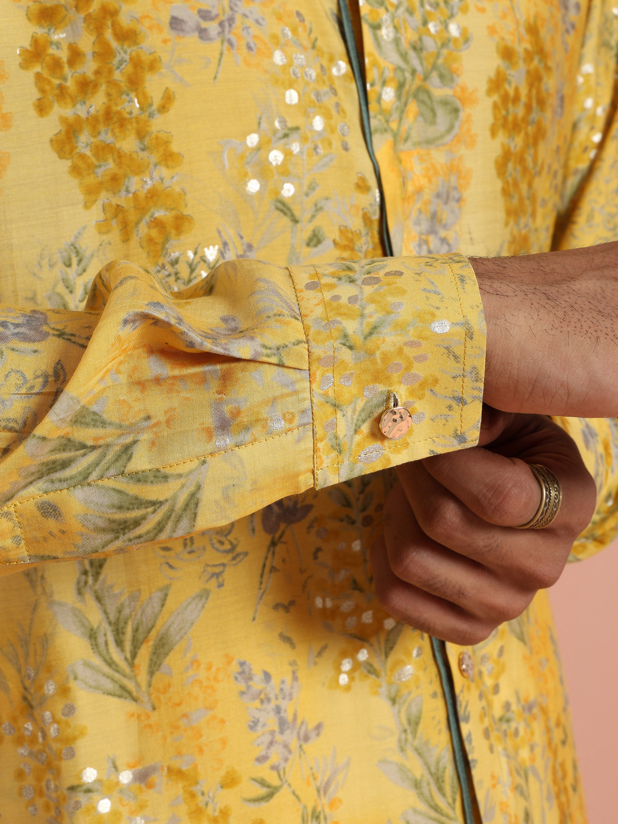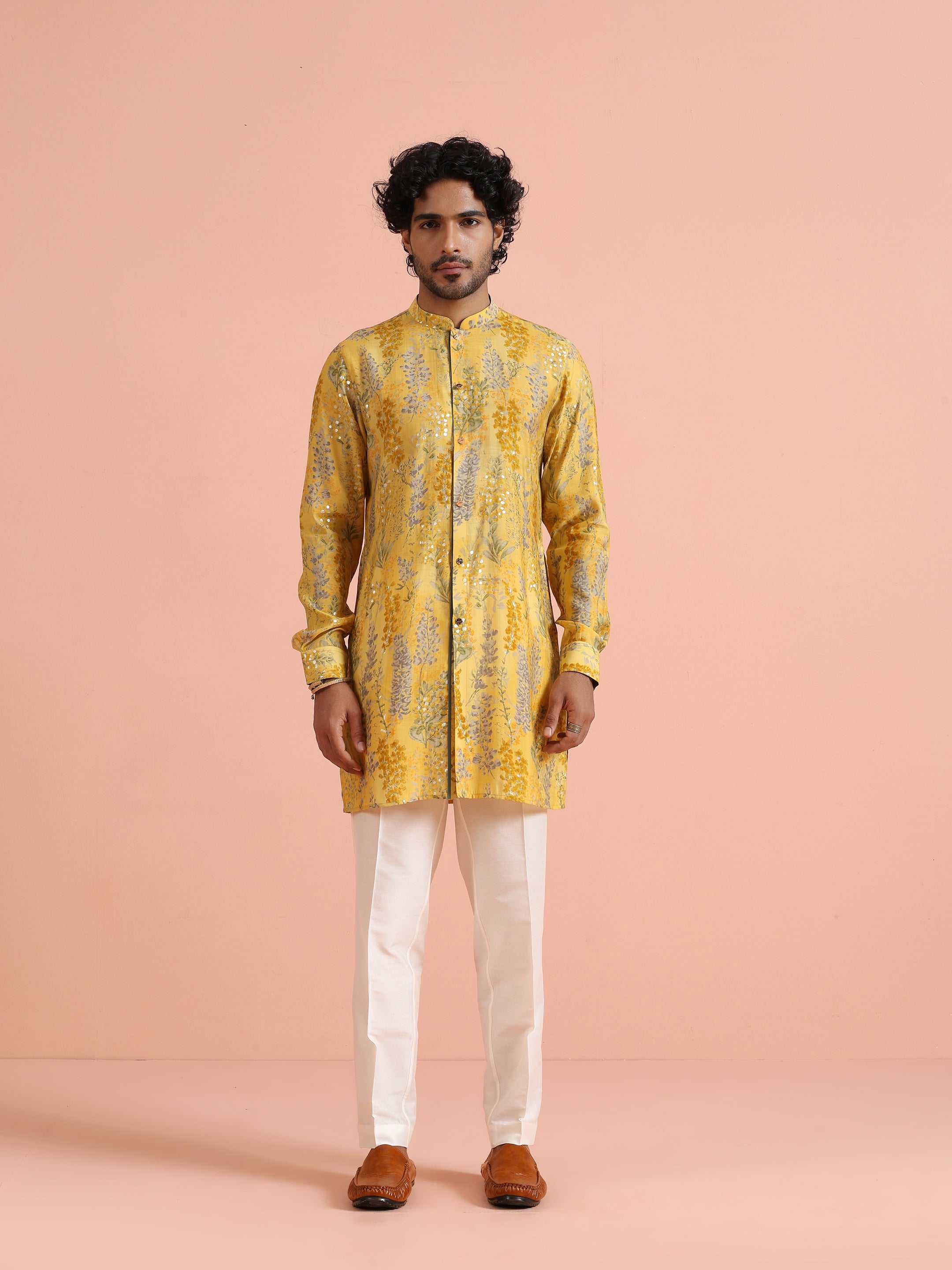 Kisah Menss Yellow Sequinned Mid Kurta festive floral kurta with sequins for haldi, weddings, and celebrations. Bright, elegant, and stylish.