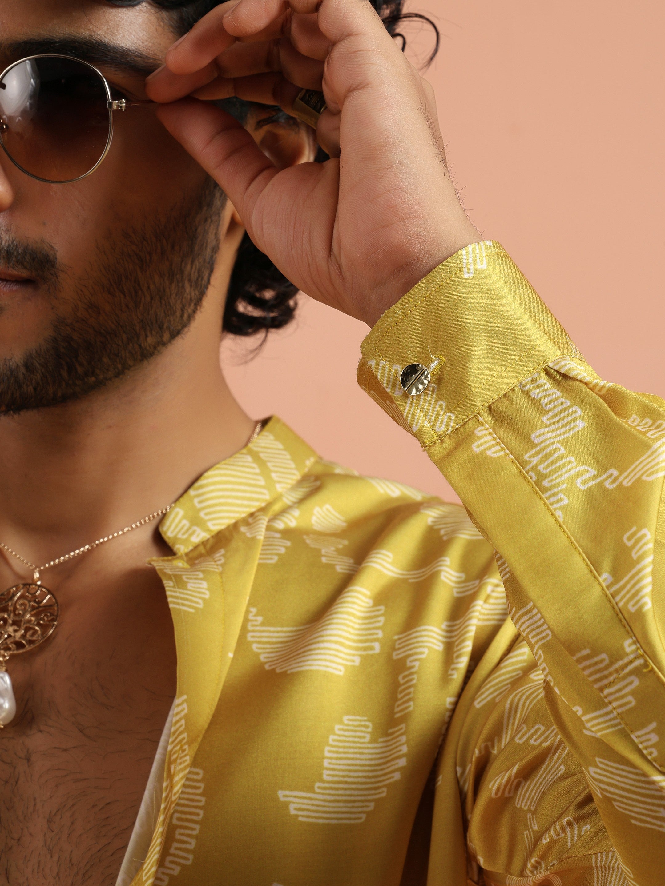 This yellow silk blend textured kurta with woven motifs, perfect for Haldi, puja, festive and wedding functions. Classic mandarin collar design with modern appeal.