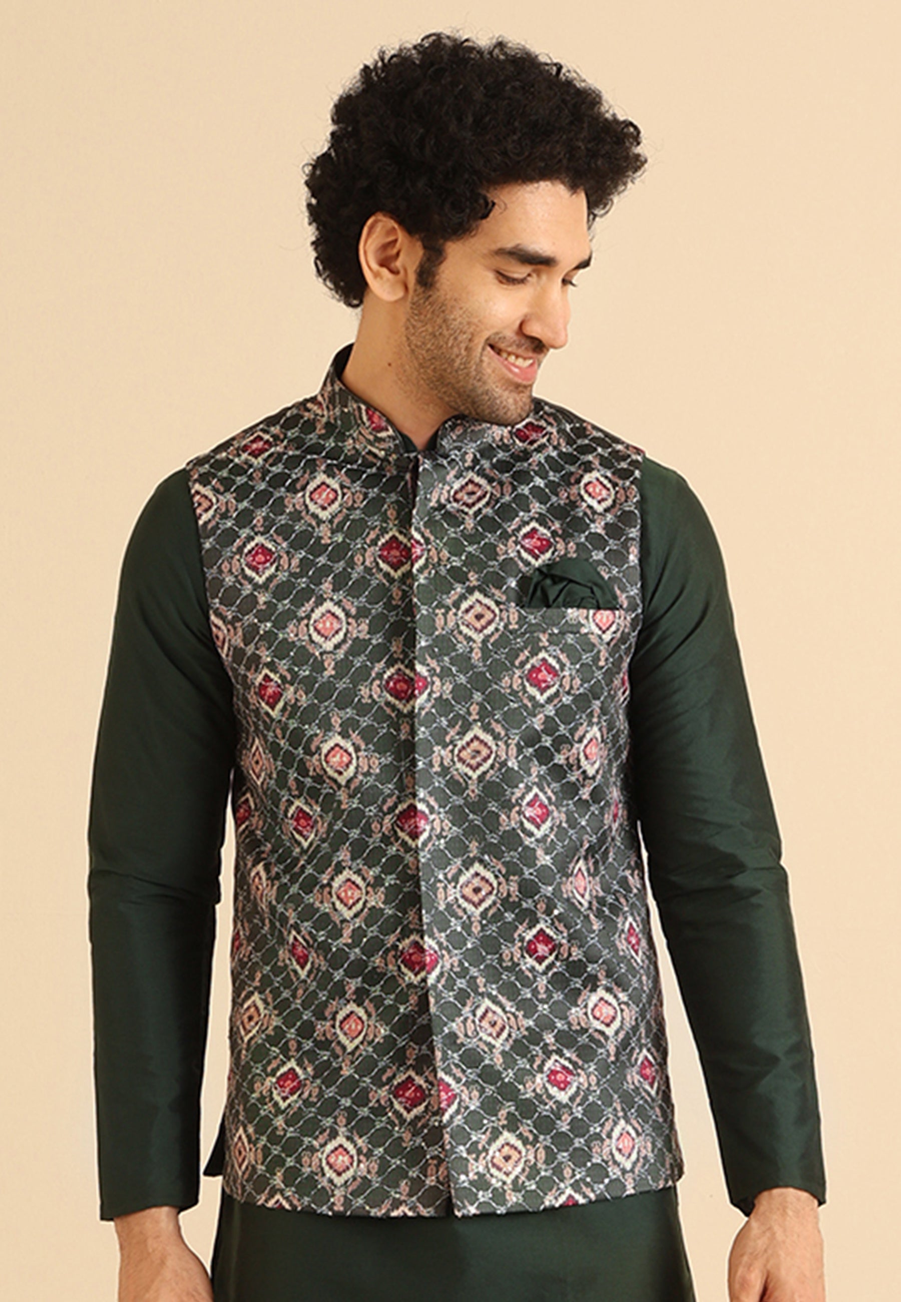 This Bottle green Nehru Jacket is a yes for all your casual occasions. The Jacket is of Silk Blend which adds on to the defined and modern look. This Jacket will complete your look