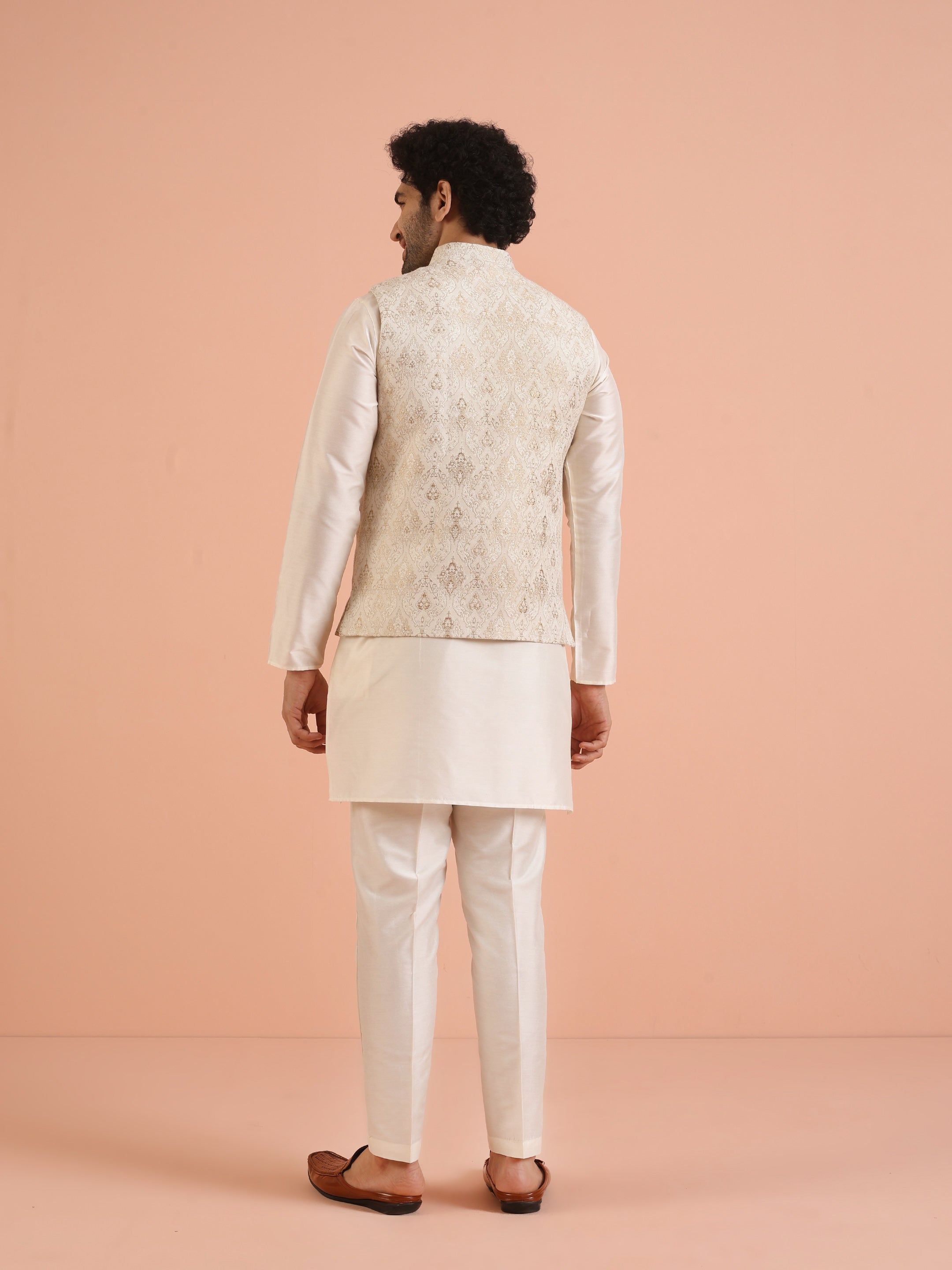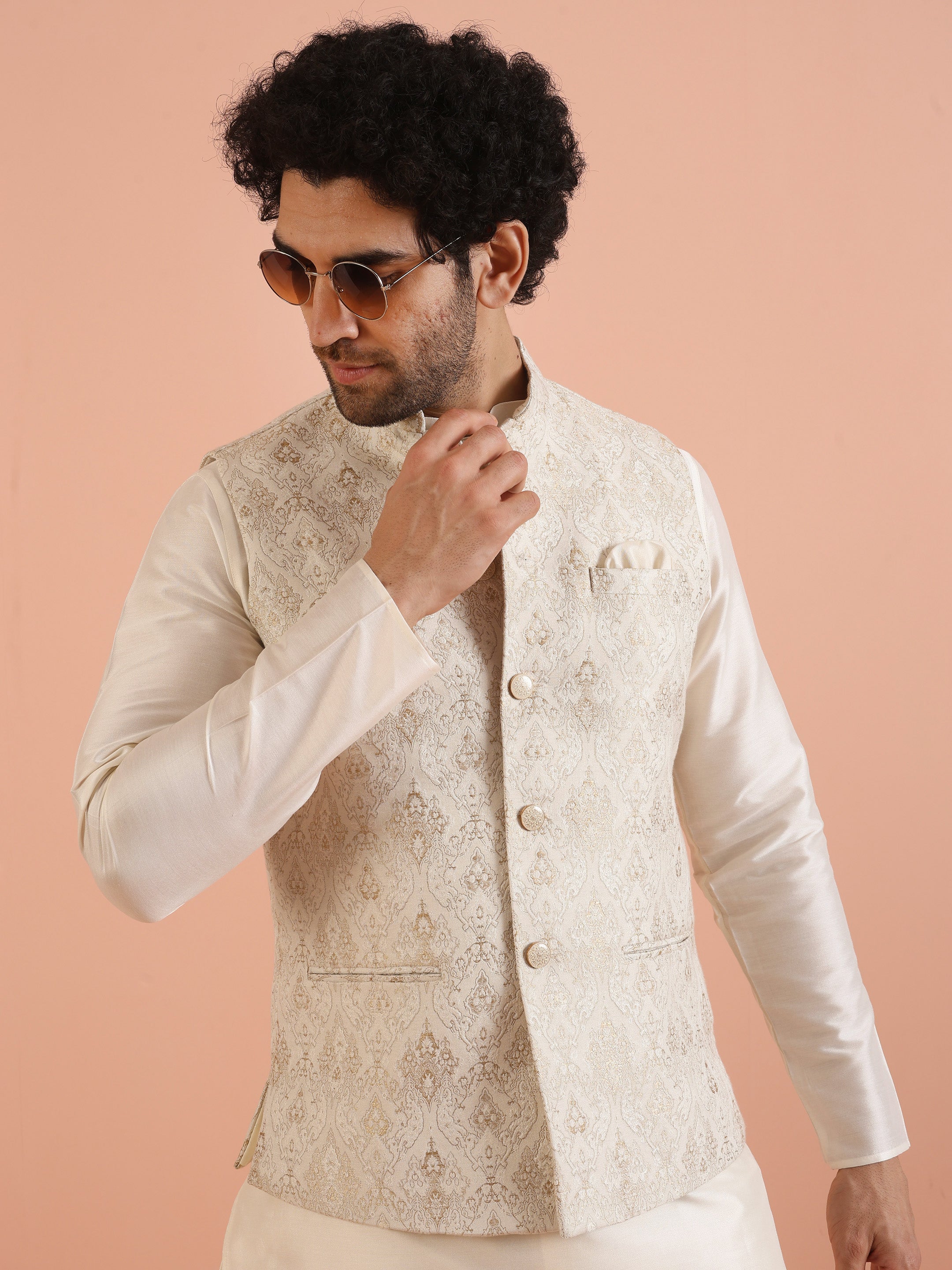 Experience classic elegance with this Men Off White Jacquard Ethnic Motifs Nehru Jacket. The Jacquard Pattern adds a refined touch, while the breathable Silk Blend fabric ensures comfort throughout the day. Ideal for festive events or casual wear, this Nehru Jacket is a wardrobe essential..