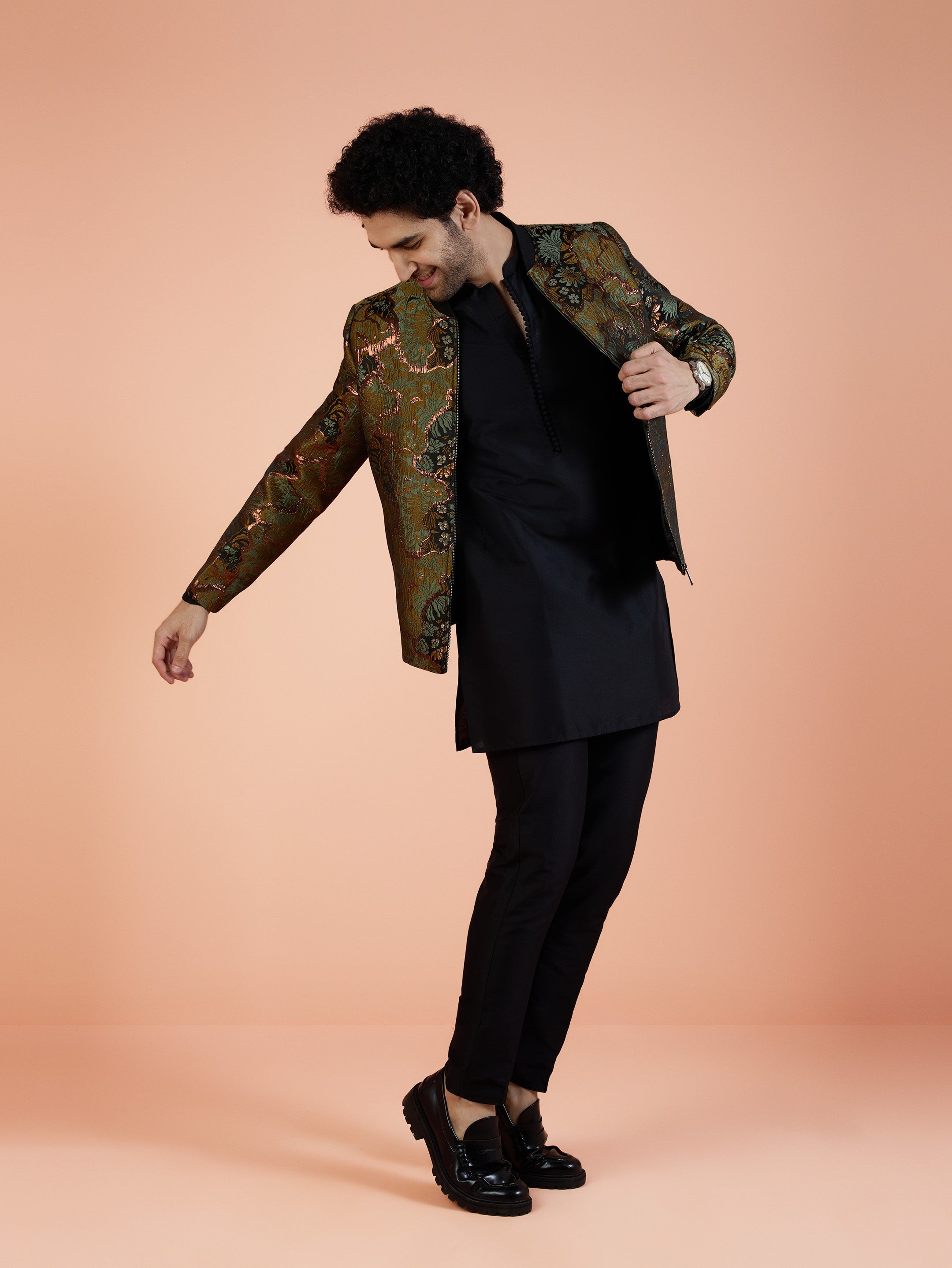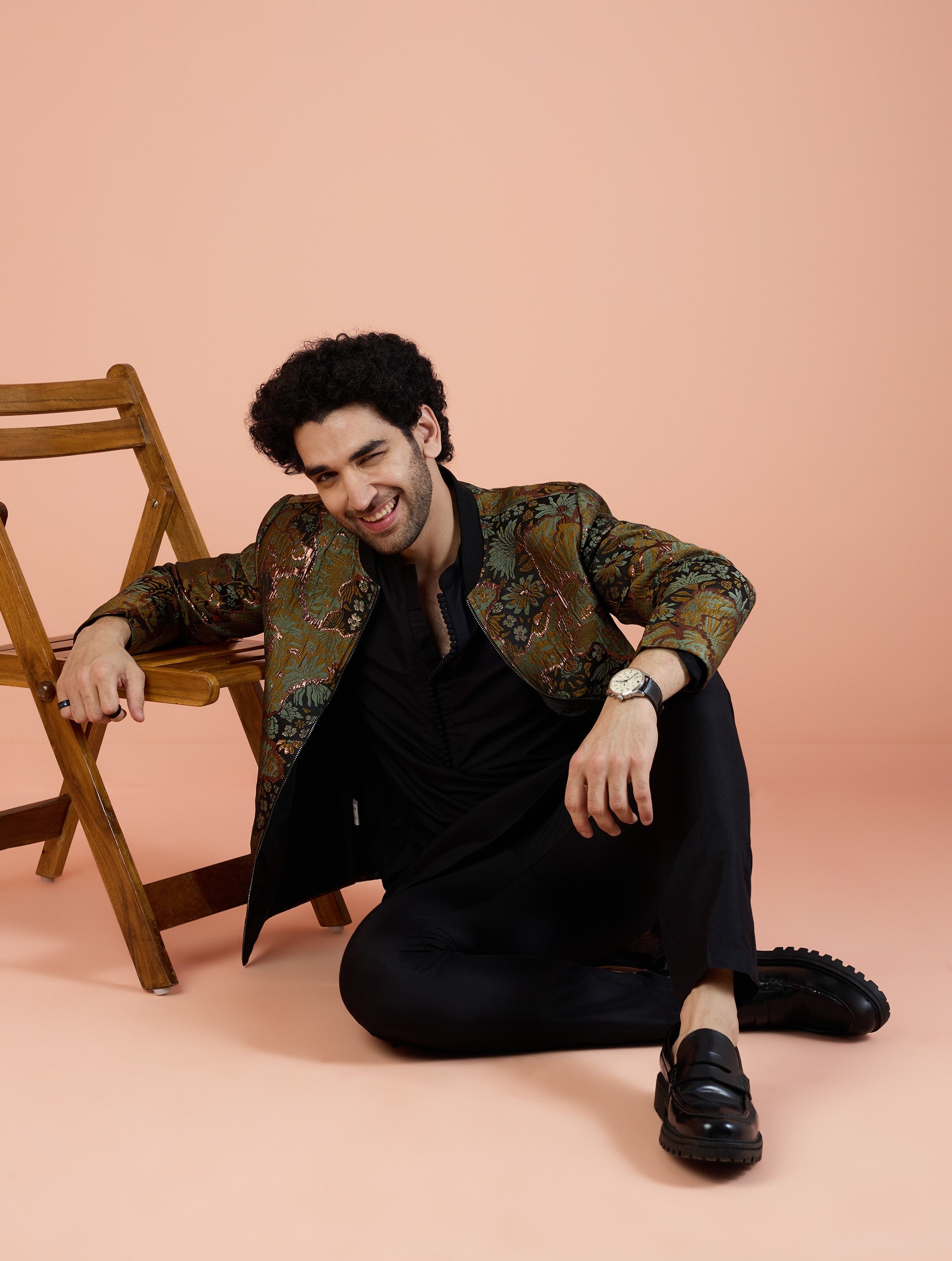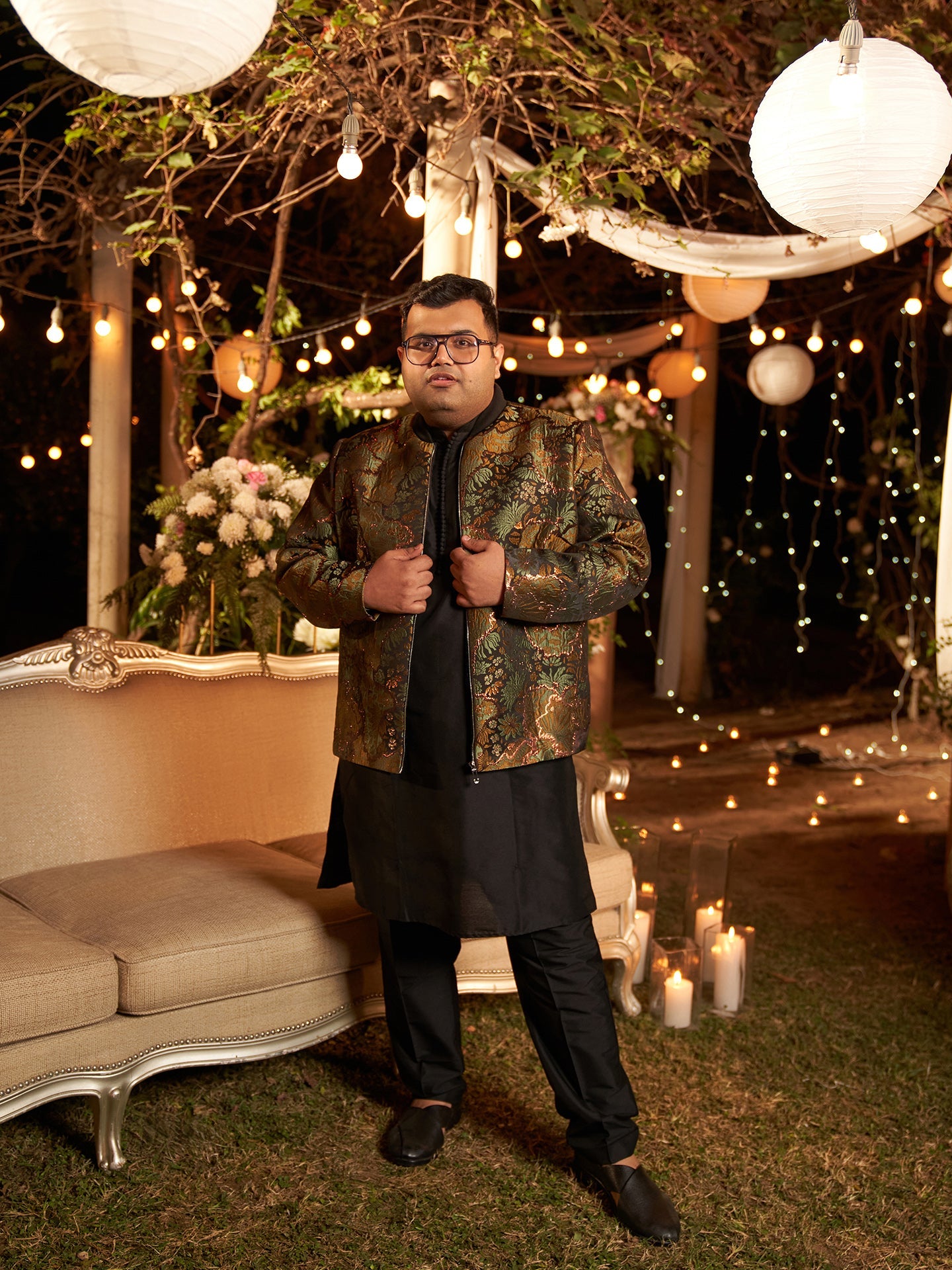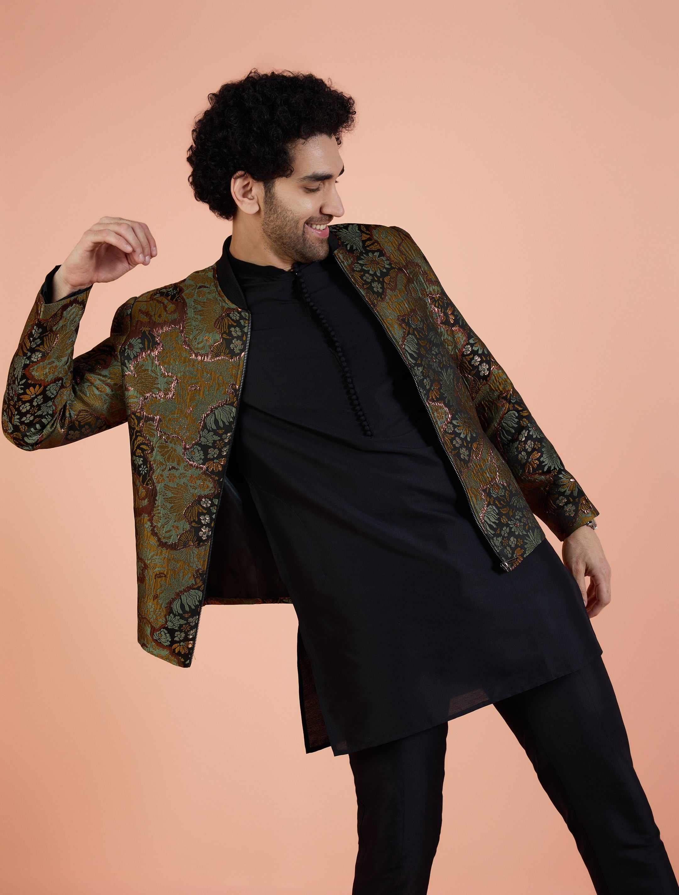 Experience classic elegance with this Kurta Bomber Jacket Trouser Set with Abstract Pattern. The breathable Silk Blend fabric ensures comfort throughout the day. Ideal for festive events or casual wear.