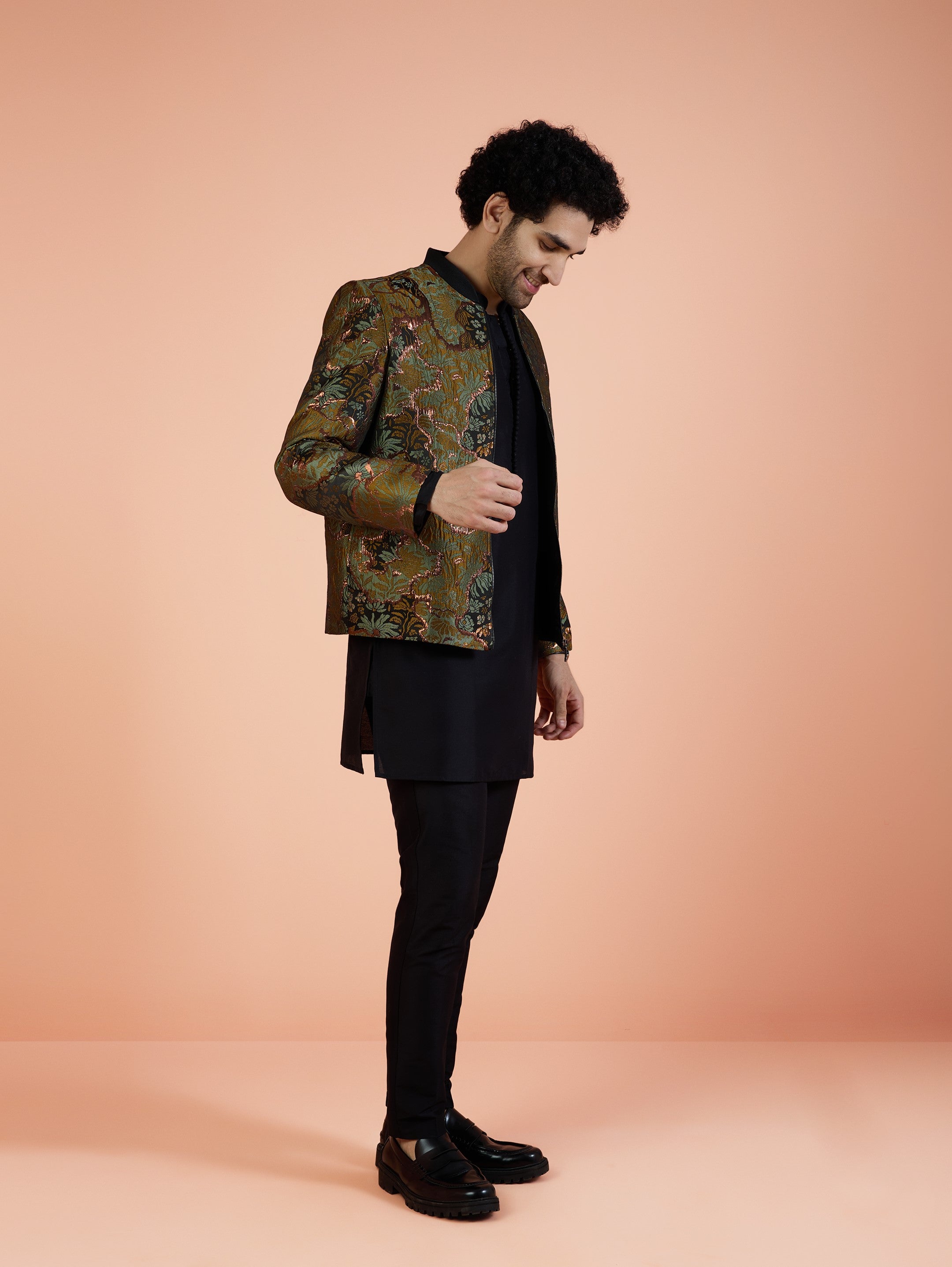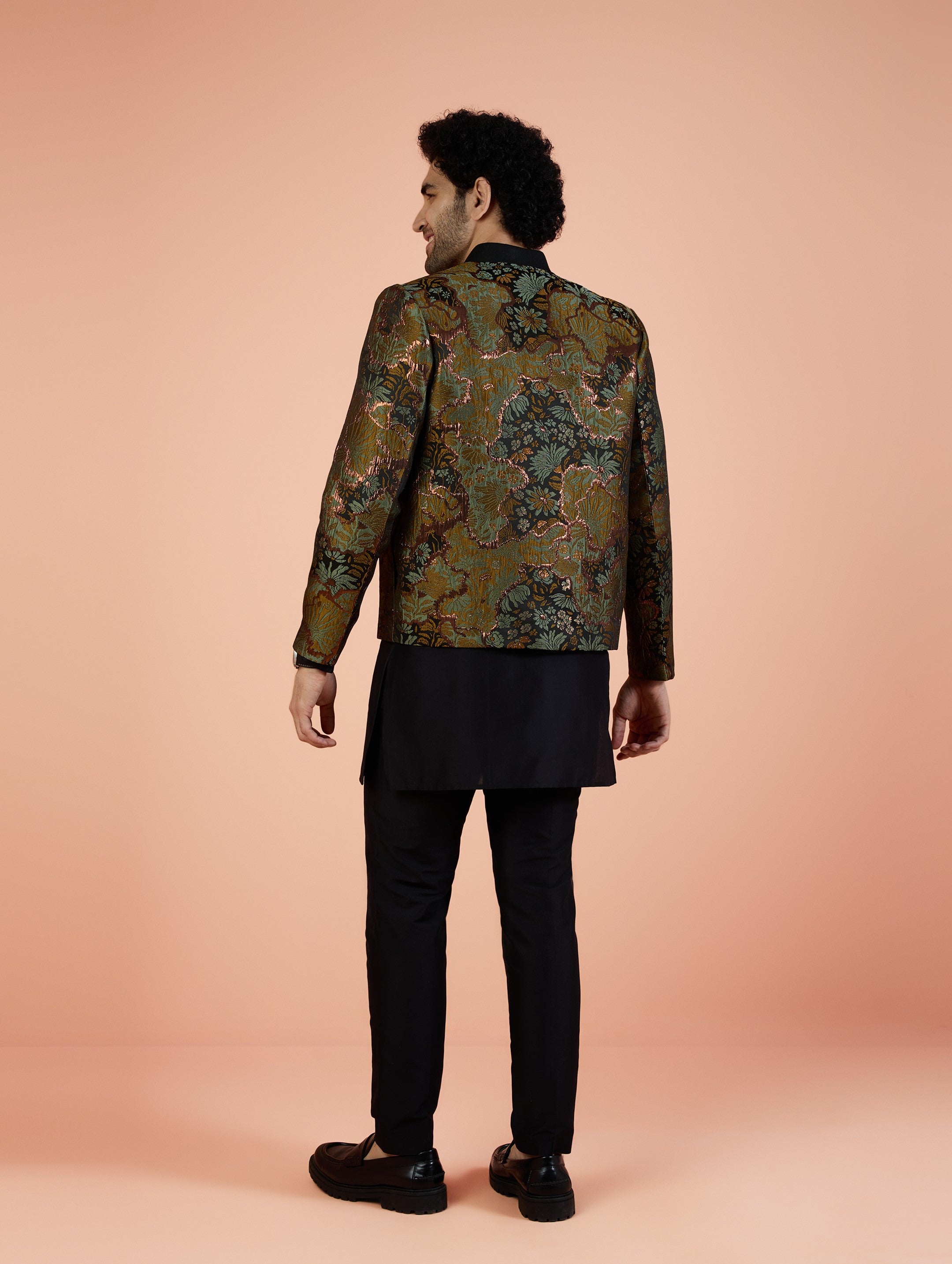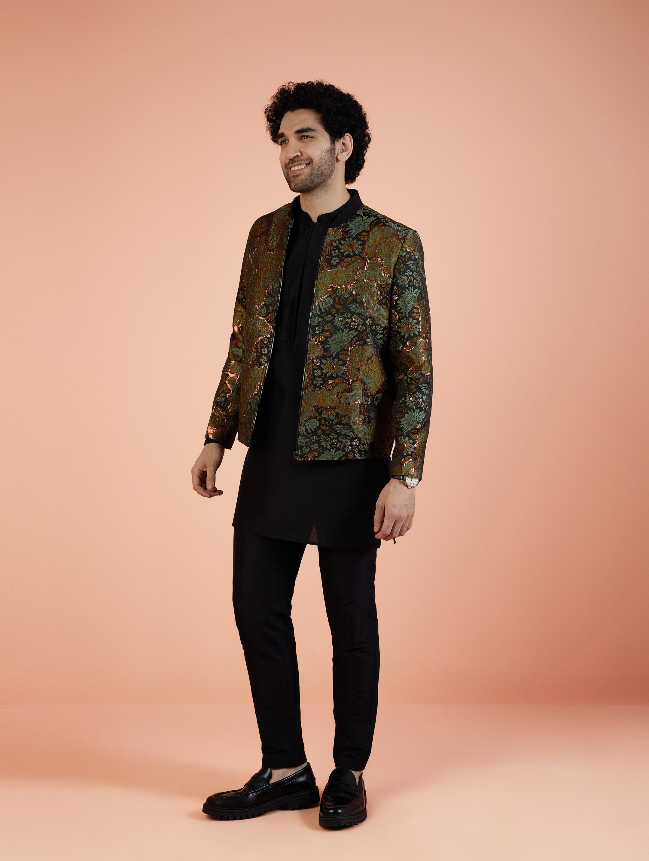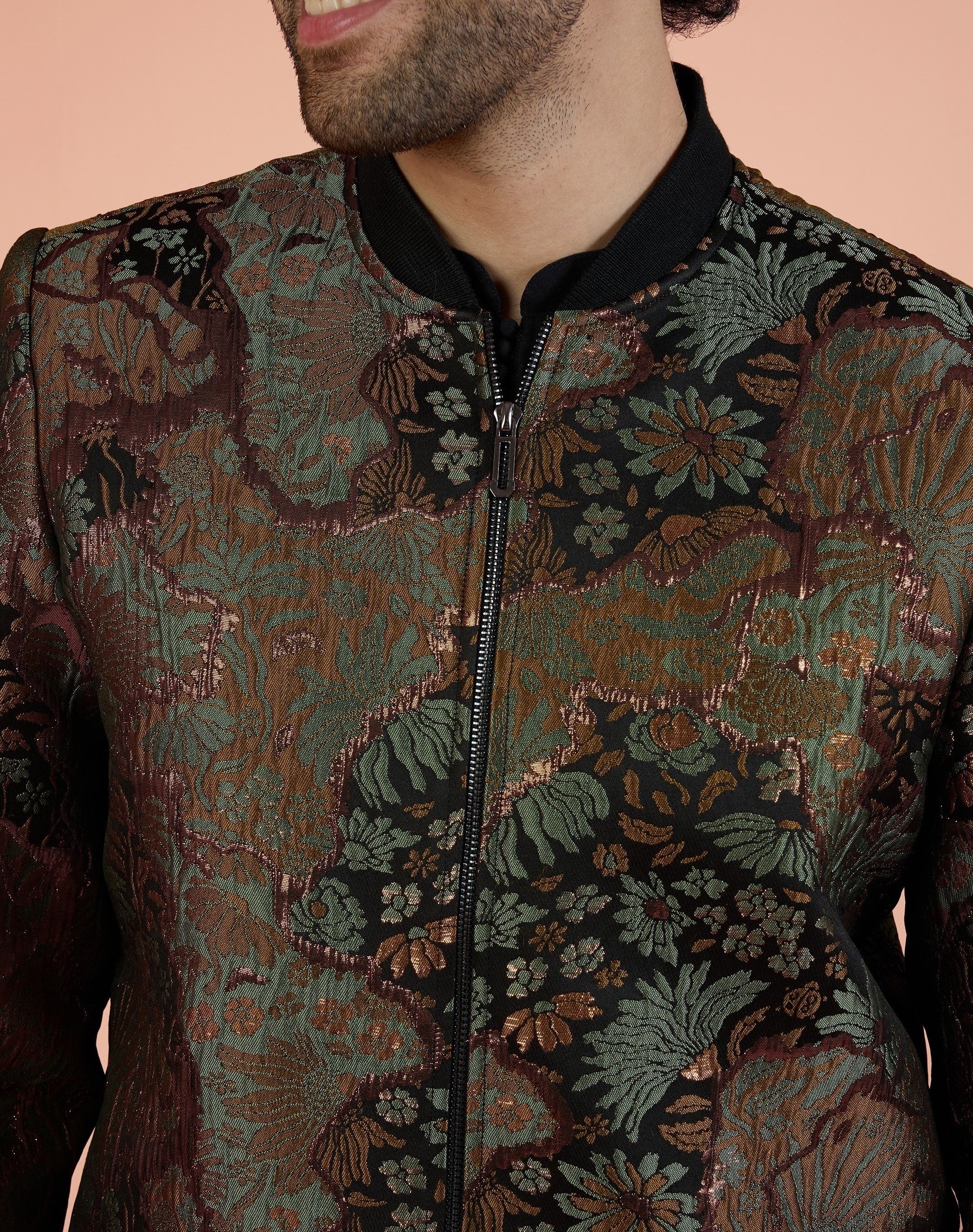 Experience classic elegance with this Kurta Bomber Jacket Trouser Set with Abstract Pattern. The breathable Silk Blend fabric ensures comfort throughout the day. Ideal for festive events or casual wear.