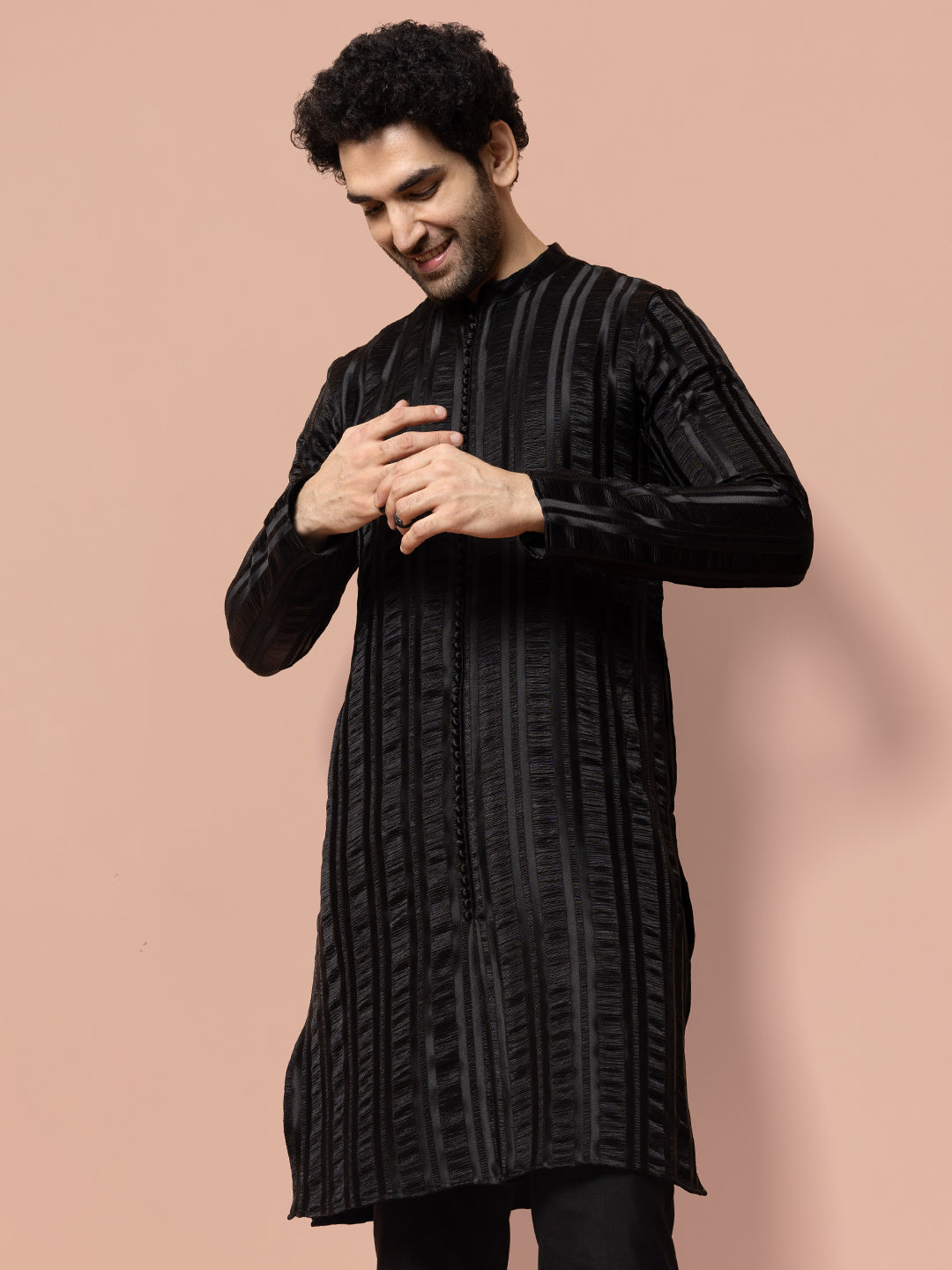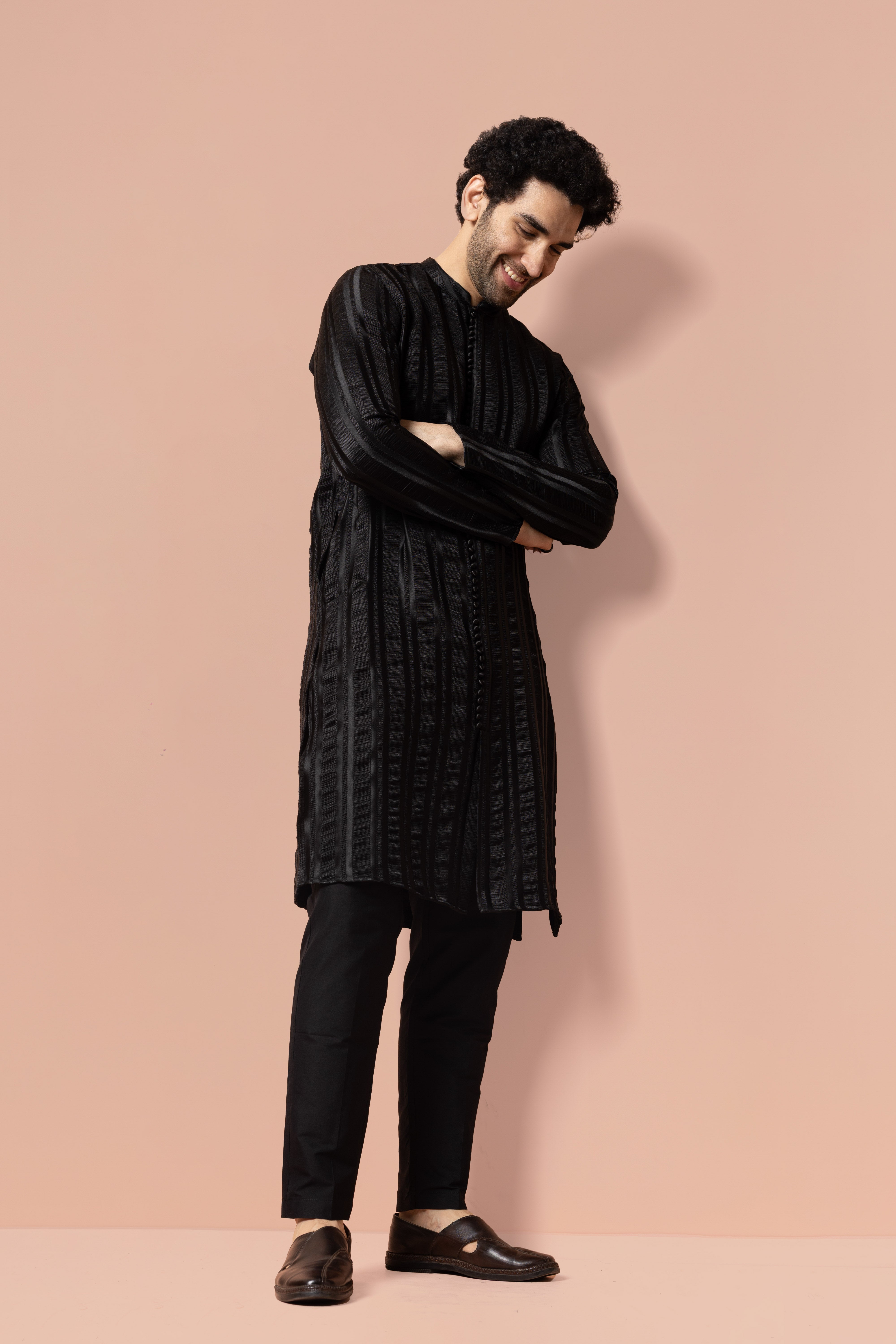 Make an unforgettable moment with this Black Woven Design Front Open Kurta, designed to bring elegance and charm to every celebration. The rich Cotton Blend fabric adds Self Design and depth, while the expertly tailored fit ensures a sharp, comfortable look. Whether it’s a wedding, festive gathering, or cultural event, this ensemble blends tradition with a modern edge, refined yet effortlessly stylish.