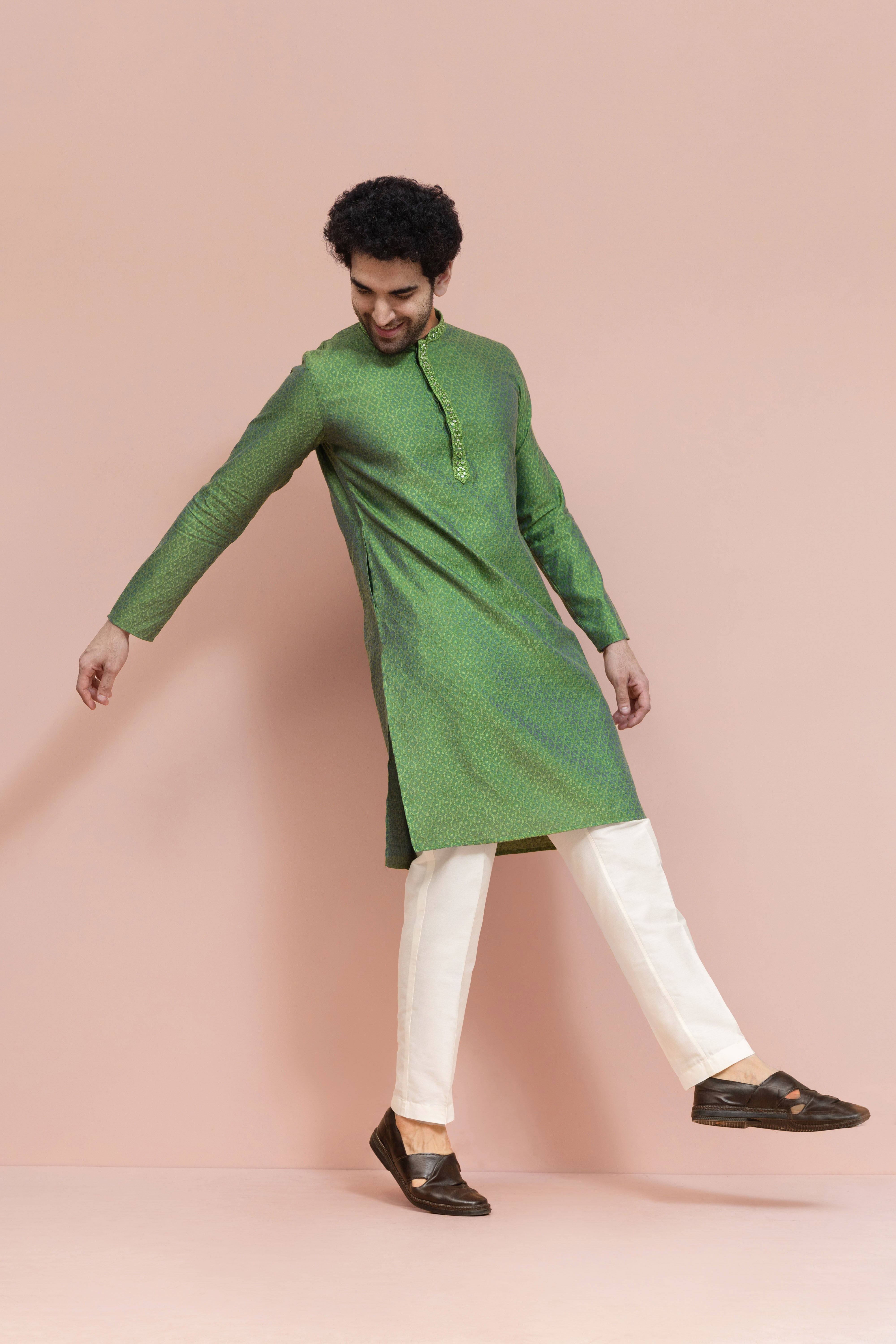 Make an unforgettable moment with this Green Mirror work Kurta, designed to bring elegance and charm to every celebration. The rich Silk Blend fabric adds Ethnic Motifs and depth, while the expertly tailored fit ensures a sharp, comfortable look. Whether it’s a wedding, festive gathering, or cultural event, this ensemble blends tradition with a modern edge, refined yet effortlessly stylish.