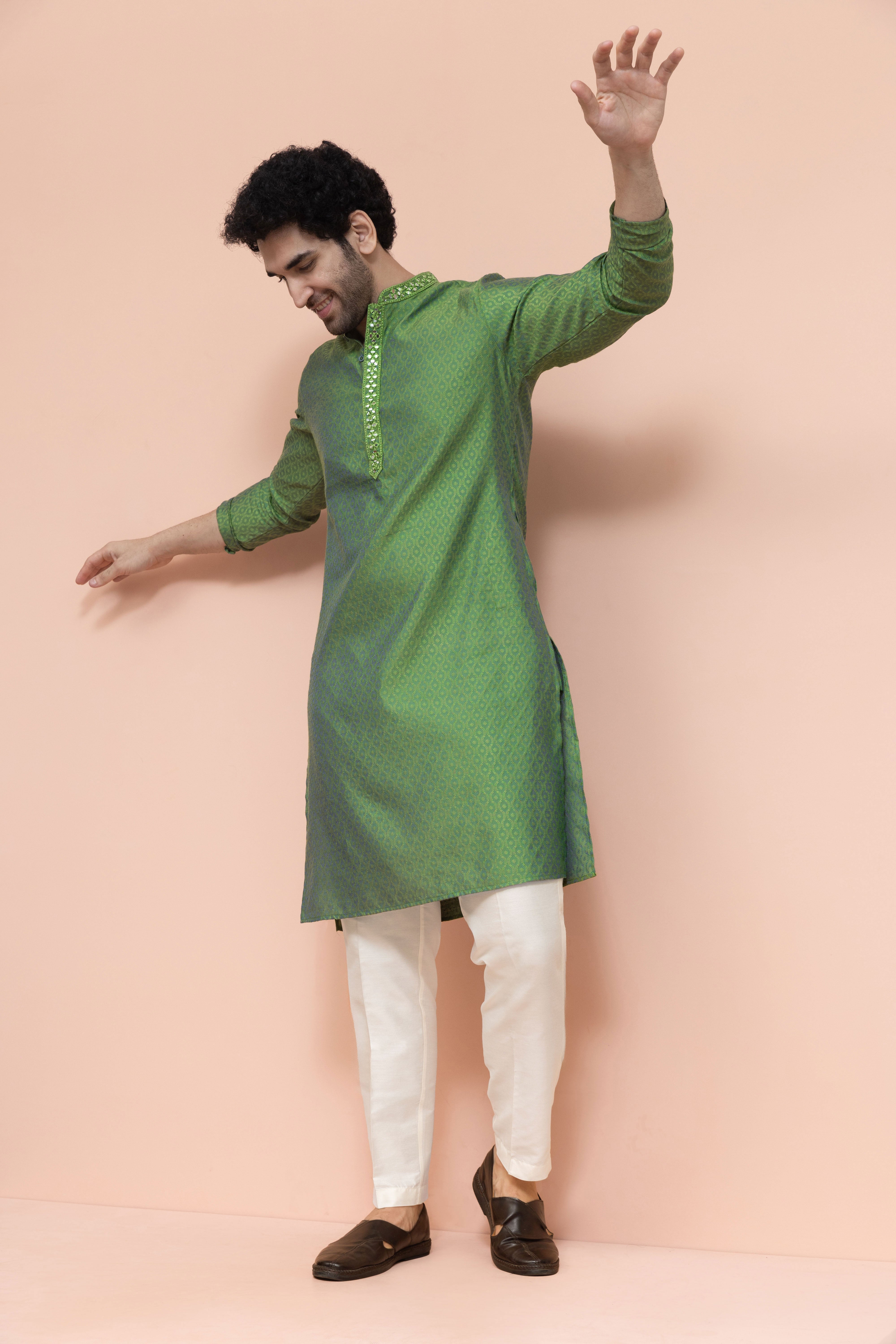 Make an unforgettable moment with this Green Mirror work Kurta Trouser Set, designed to bring elegance and charm to every celebration. The rich Silk Blend fabric adds Ethnic Motifs and depth, while the expertly tailored fit ensures a sharp, comfortable look. Whether it’s a wedding, festive gathering, or cultural event, this ensemble blends tradition with a modern edge, refined yet effortlessly stylish.