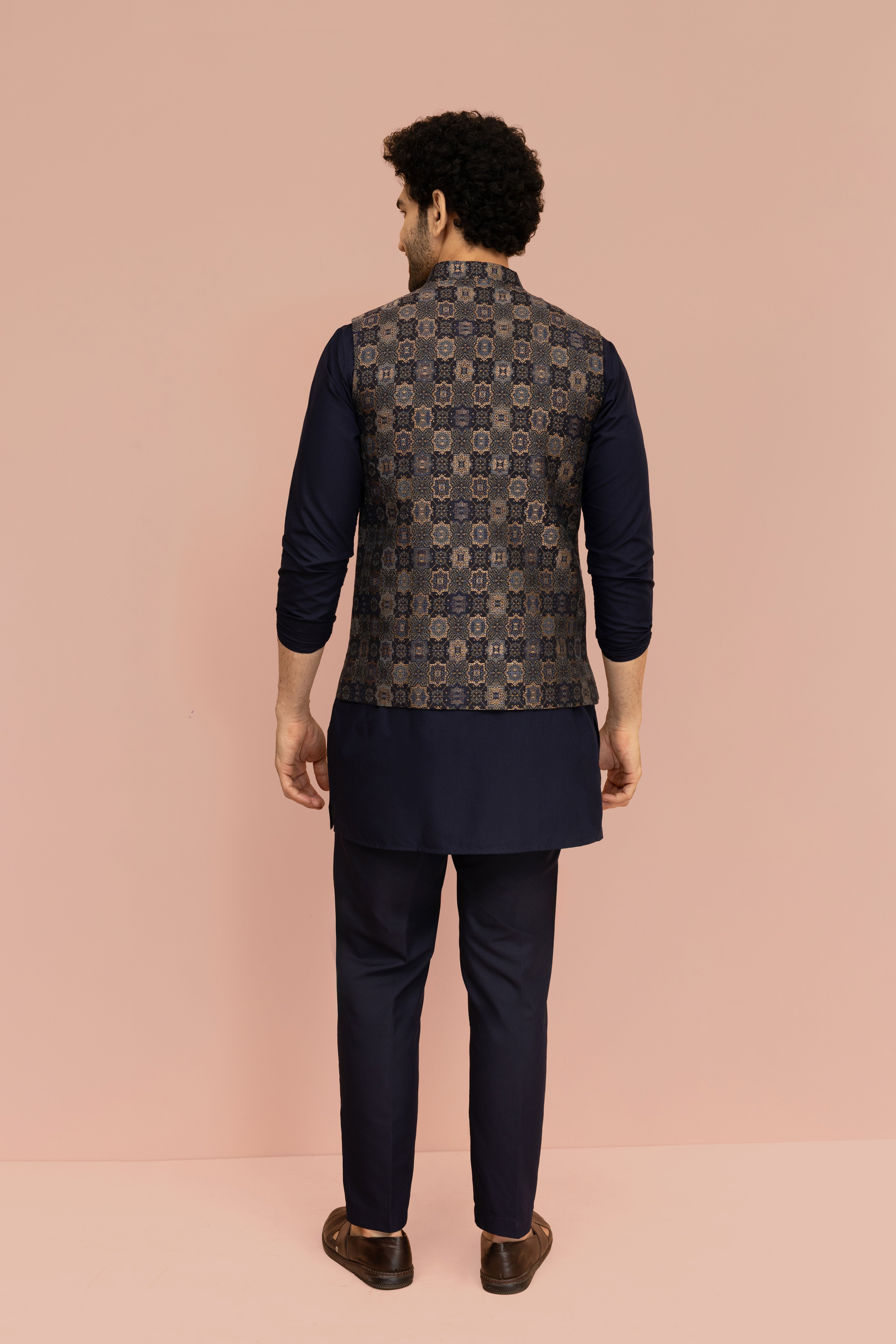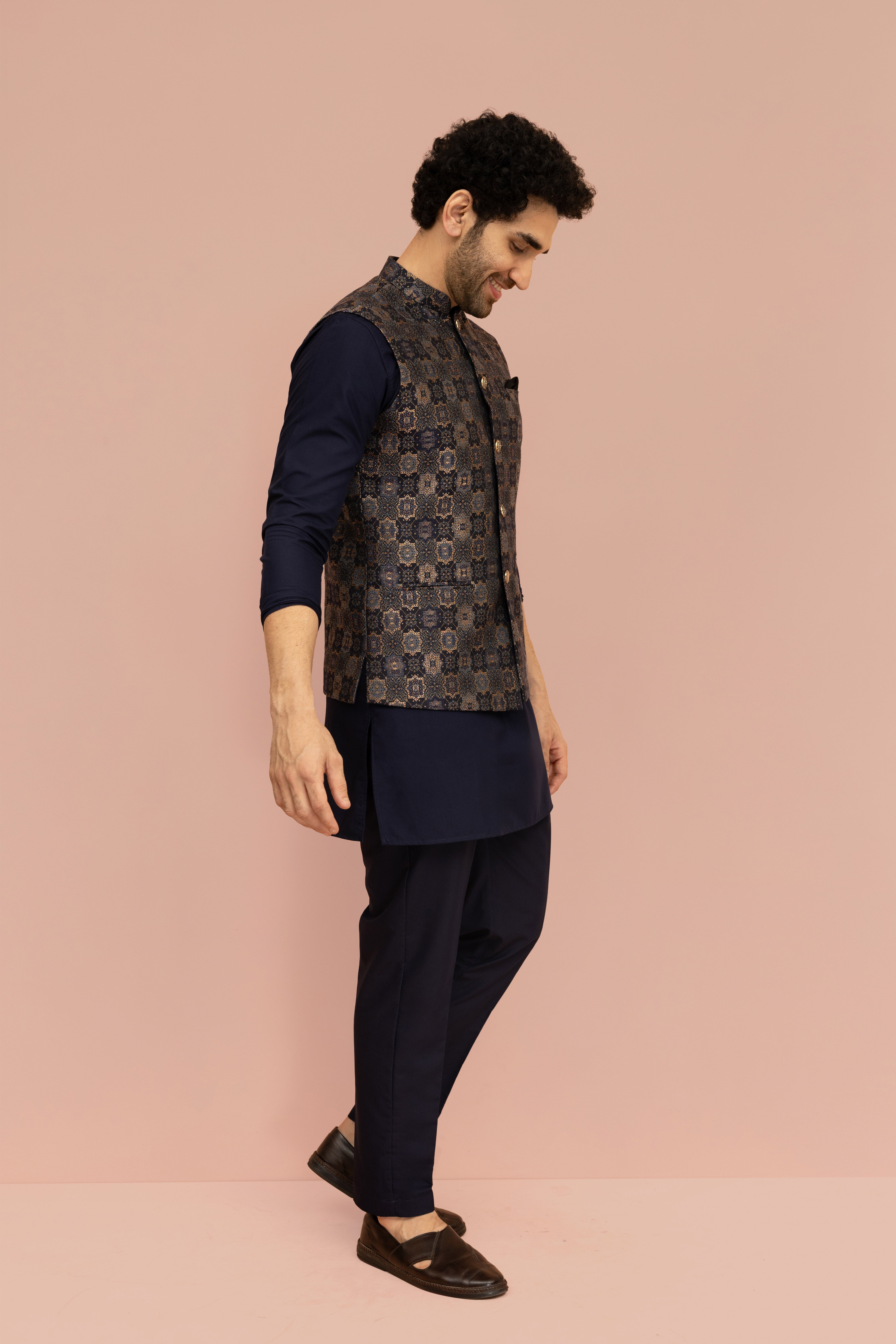 Make an unforgettable moment with this Navy Blue Geometric Jacket, designed to bring elegance and charm to every celebration. The rich Silk Blend fabric adds Jacquard and depth, while the expertly tailored fit ensures a sharp, comfortable look. Whether it’s a wedding, festive gathering, or cultural event, this ensemble blends tradition with a modern edge, refined yet effortlessly stylish.