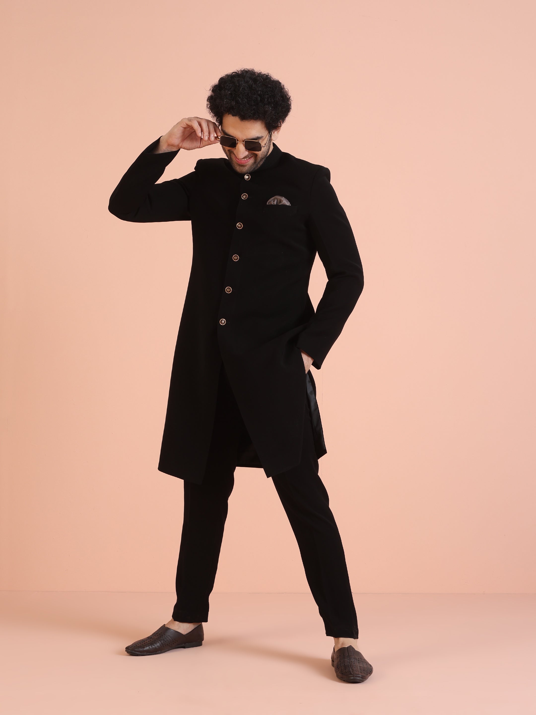 Experience classic elegance with this Men Black Solid Indowestern Sherwani Trouser Set. The Solid Pattern adds a refined touch, while the breathable fabric ensures comfort throughout the day. Ideal for festive events or casual wear.