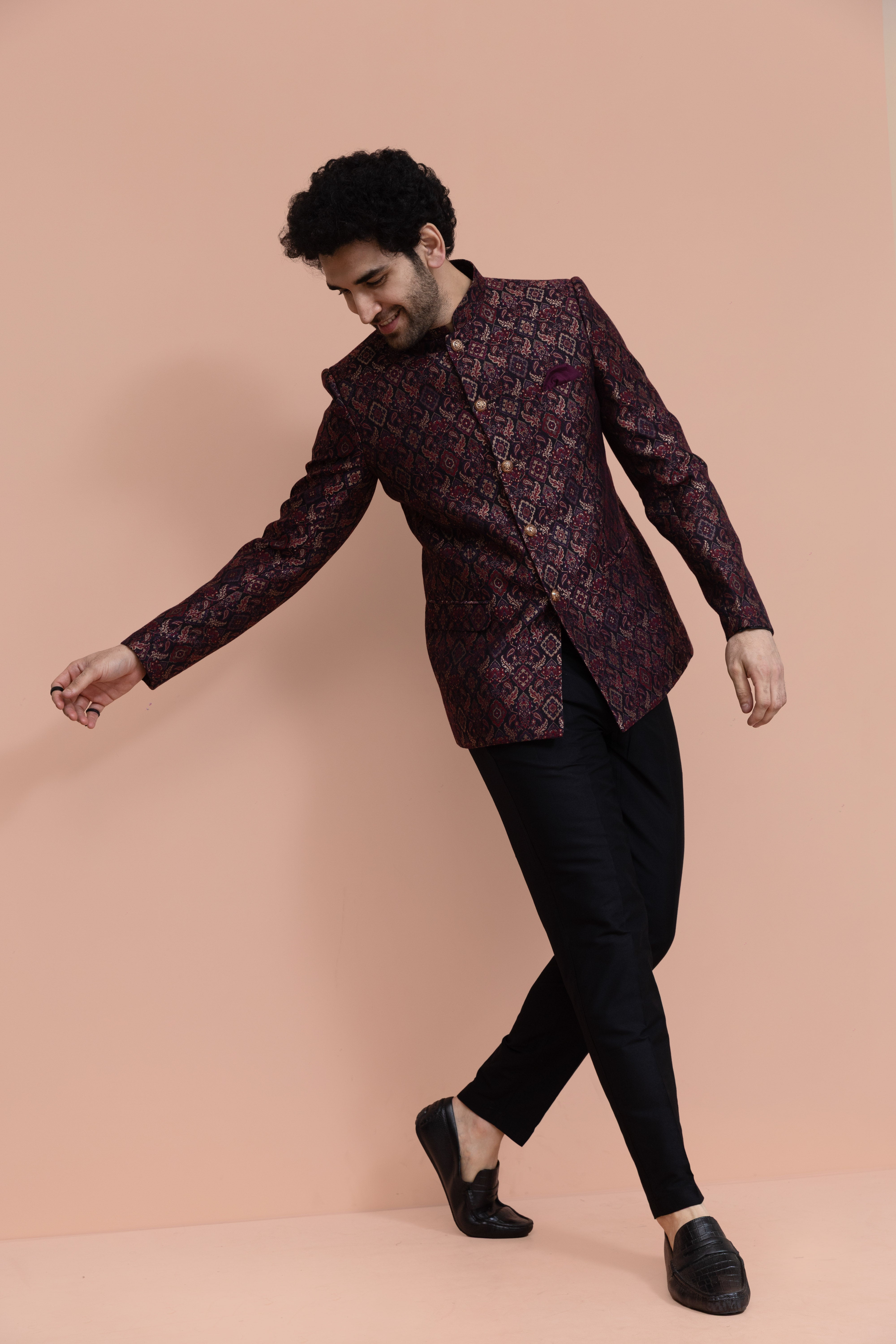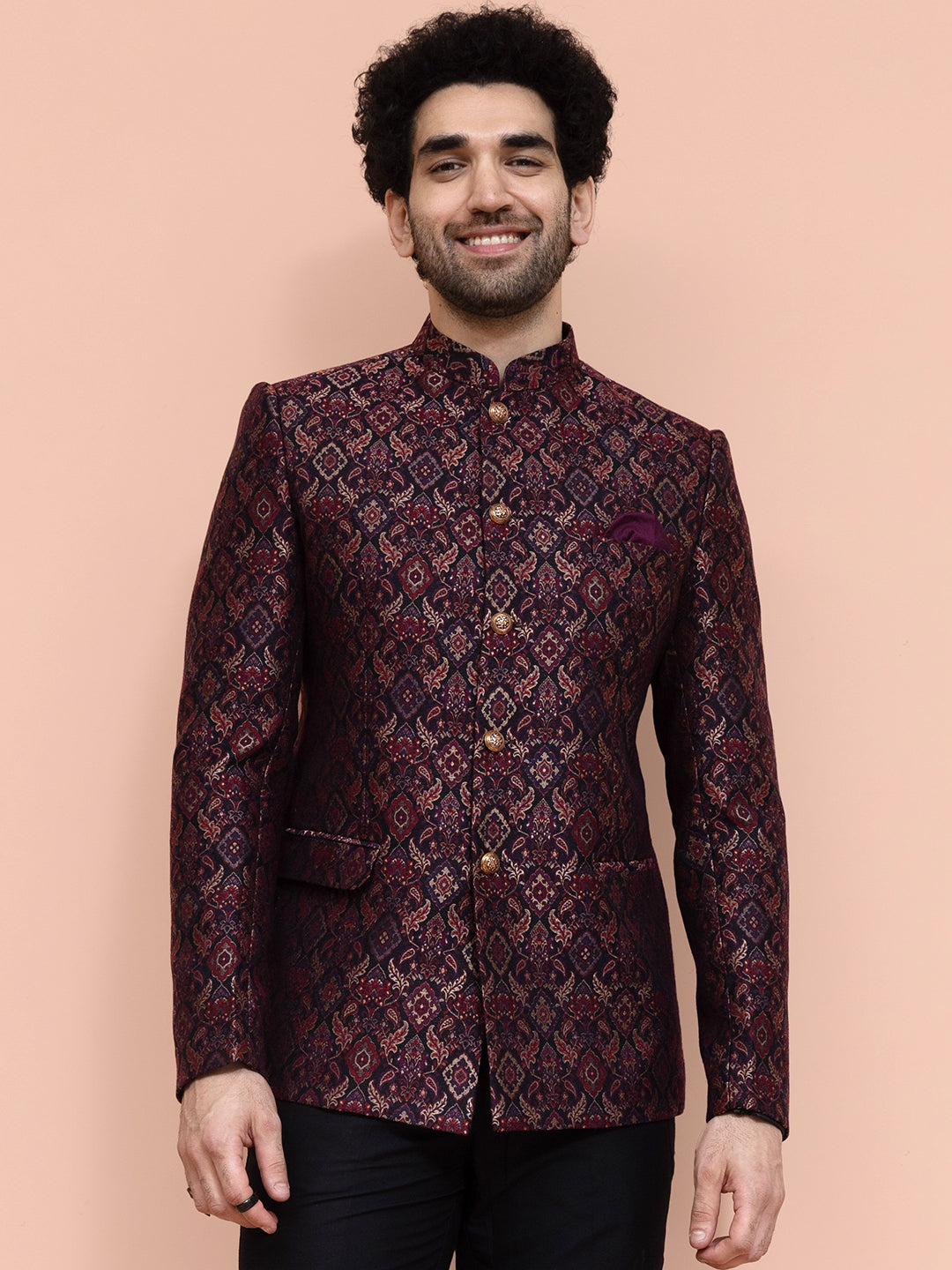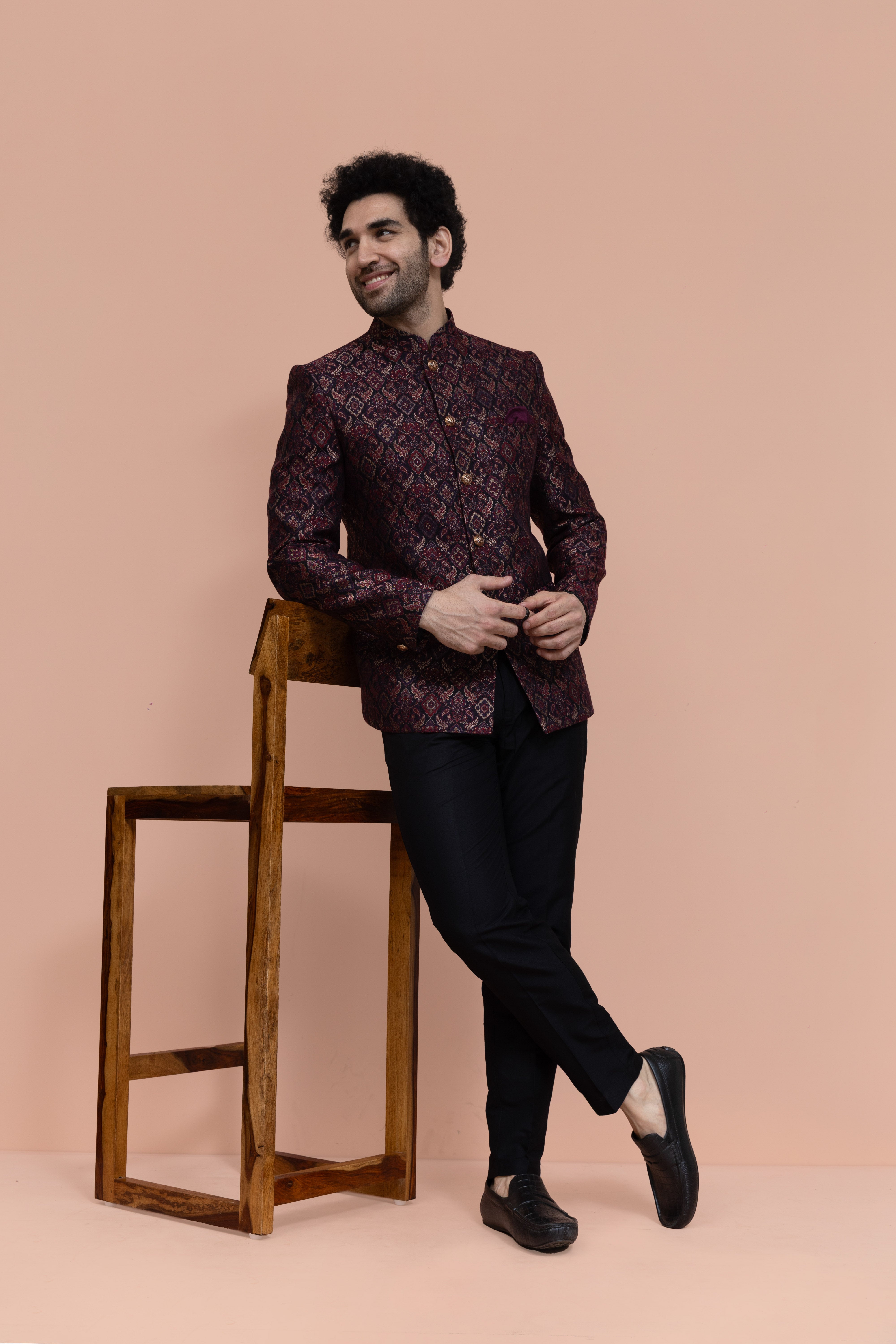 Make an unforgettable moment with this Maroon Woven Design Jodhpuri Bandhgala, designed to bring elegance and charm to every celebration. The rich Jacquard fabric adds Ethnic Motifs and depth, while the expertly tailored fit ensures a sharp, comfortable look. Whether it’s a wedding, festive gathering, or cultural event, this ensemble blends tradition with a modern edge, refined yet effortlessly stylish.
