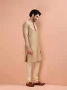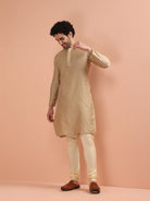 Kisah Men’s beige silk blend long kurta with textured detailing, mandarin collar & side slits. Perfect festive ethnic wear for weddings & occasions.