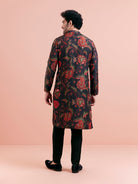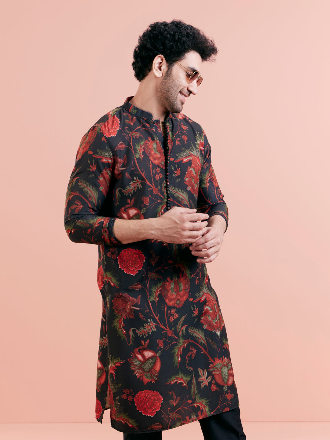 Black Silk Blend Kurta with Red and Green Floral Prints