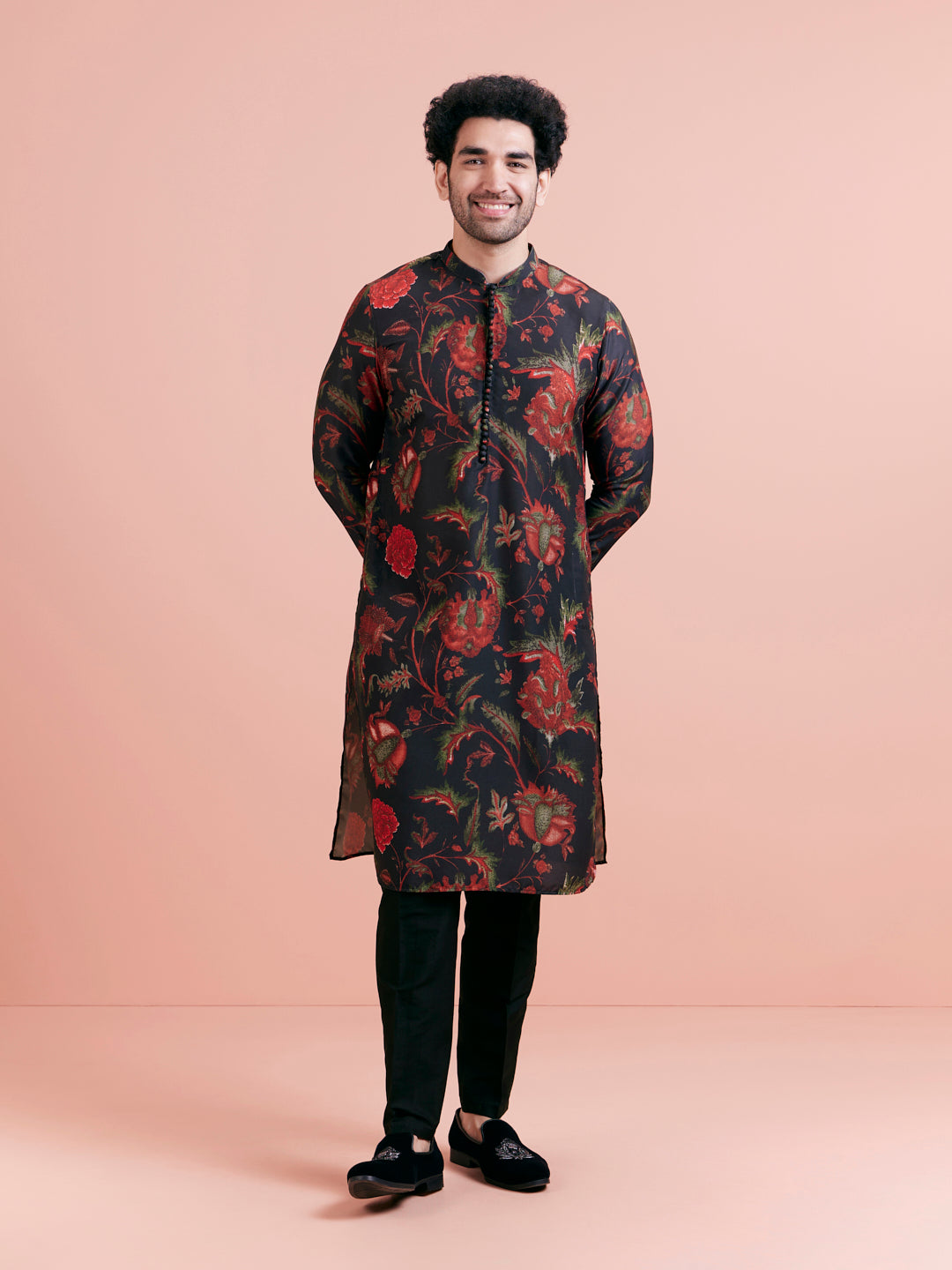 Kisah black silk blend kurta with red and green floral prints, mandarin collar, and fabric-covered button placket, perfect for weddings, receptions, and festive celebrations.