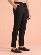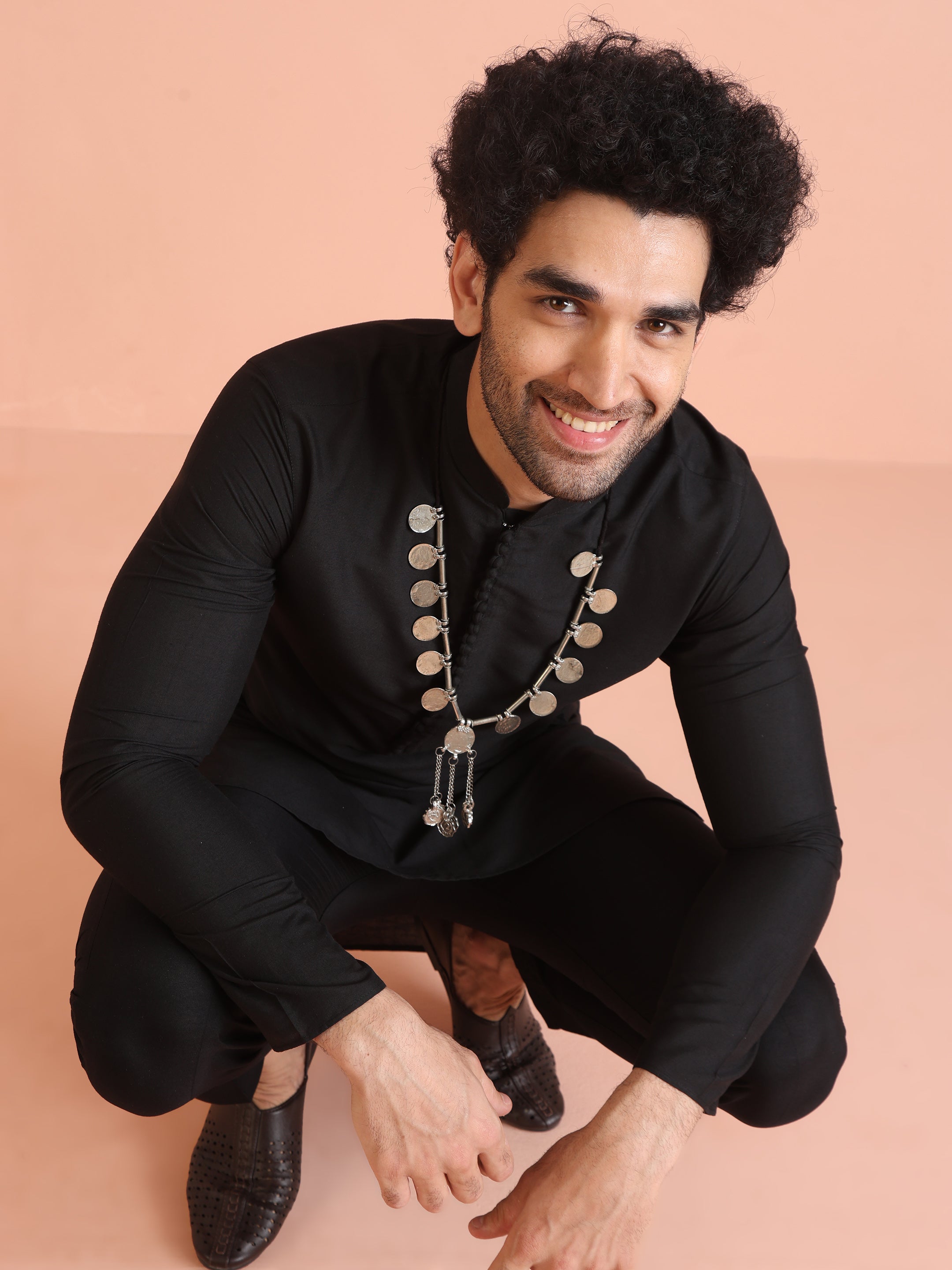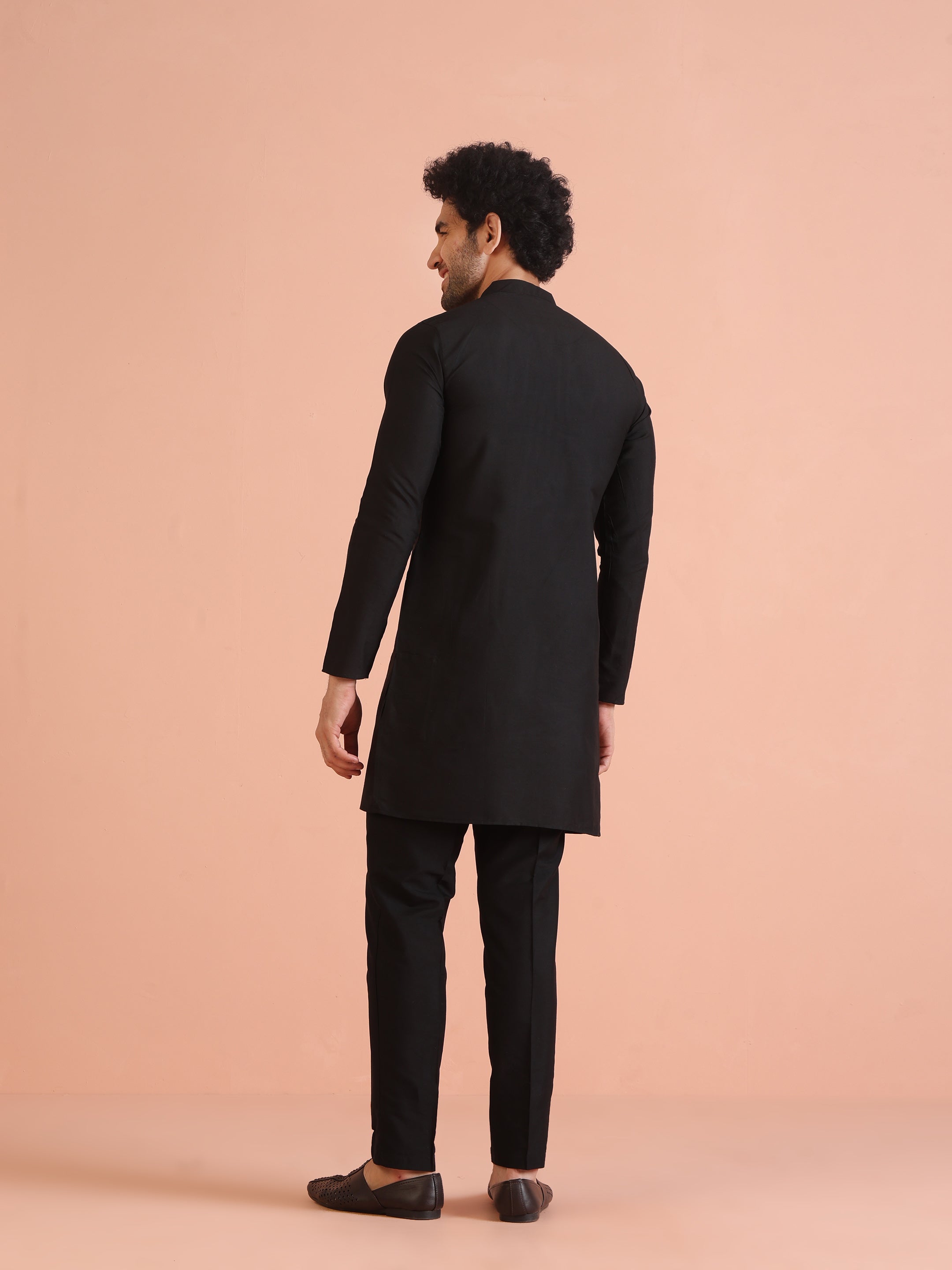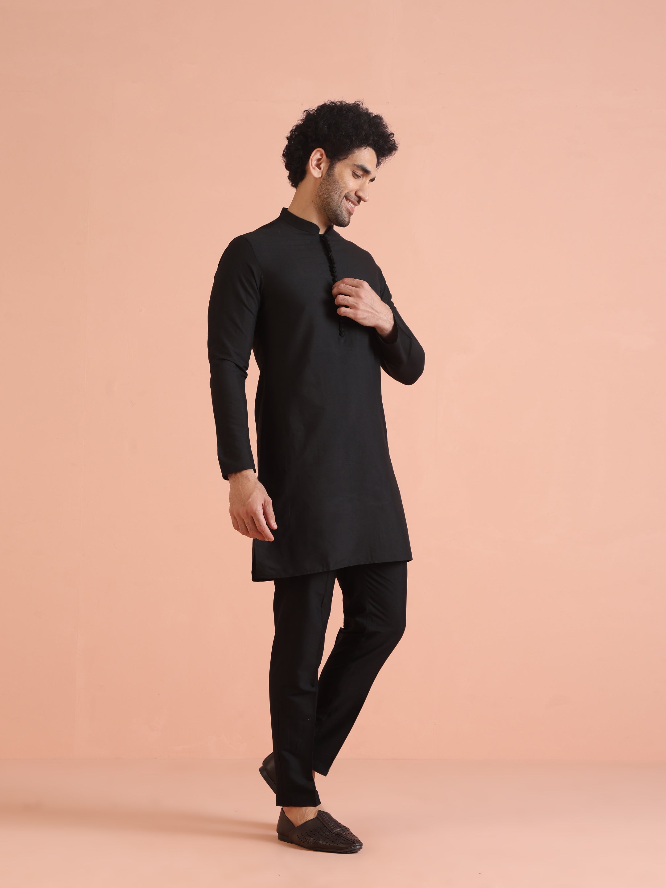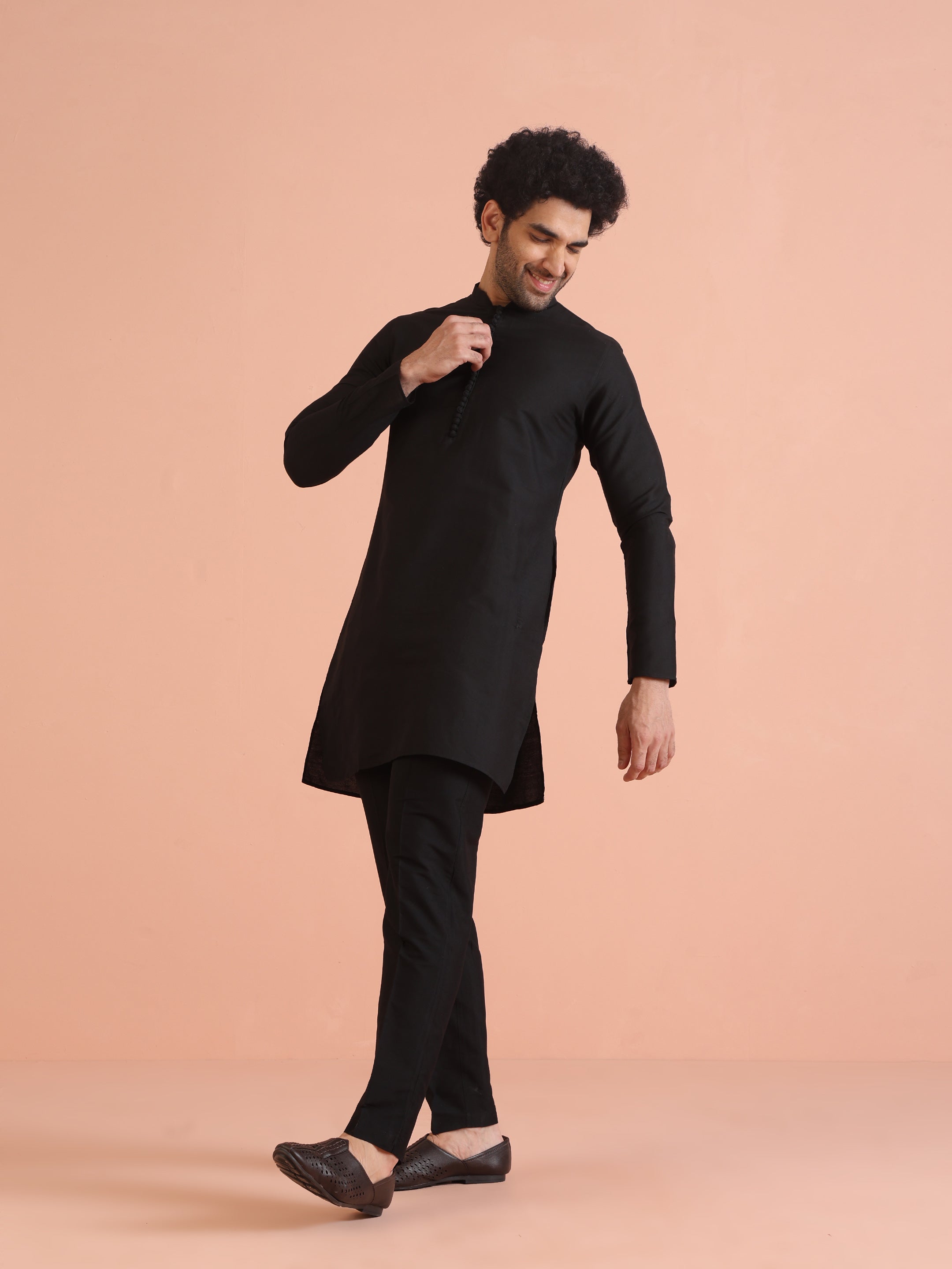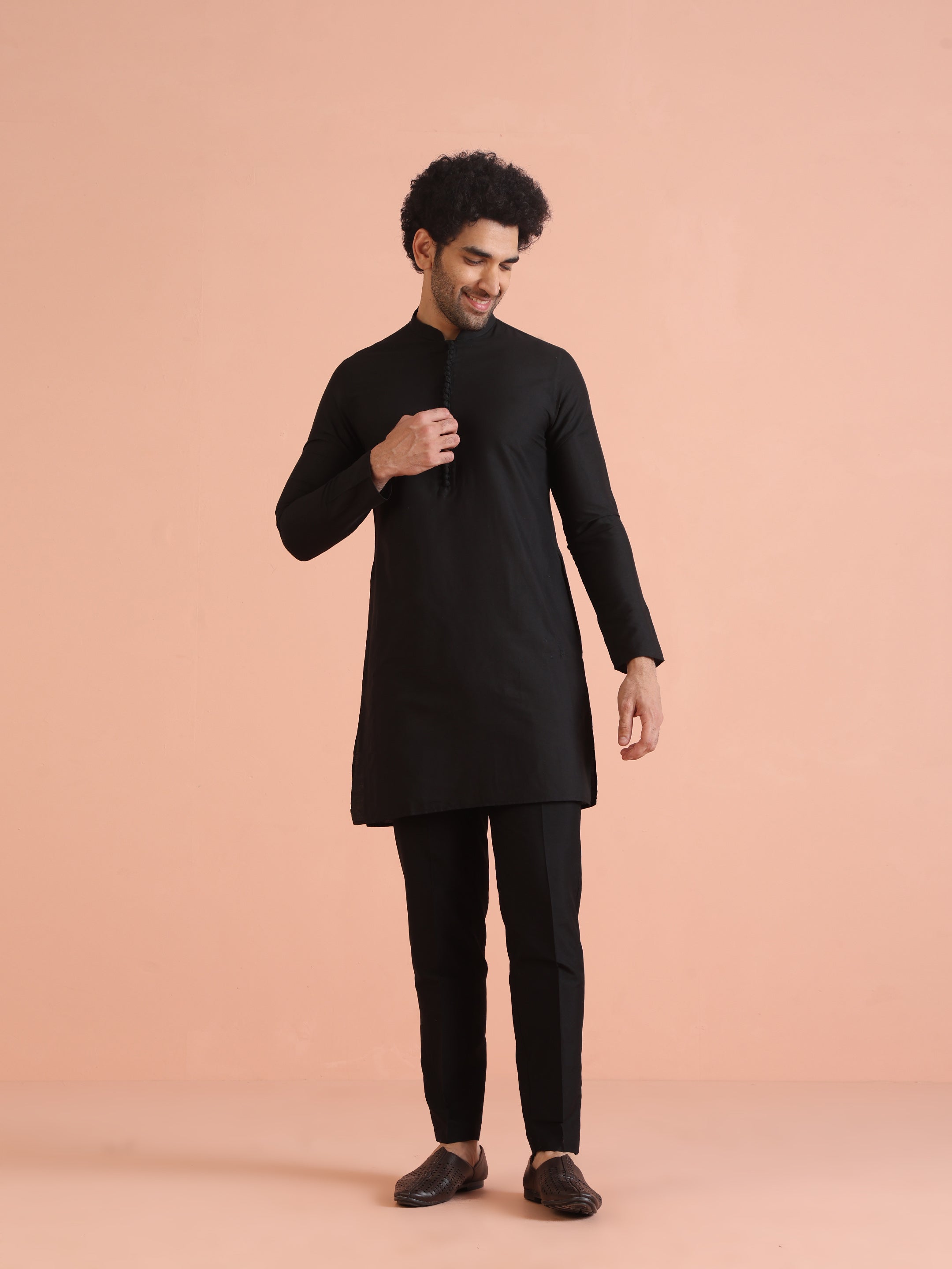 Black Silk Blend Solid Mid Kurta Trouser Set