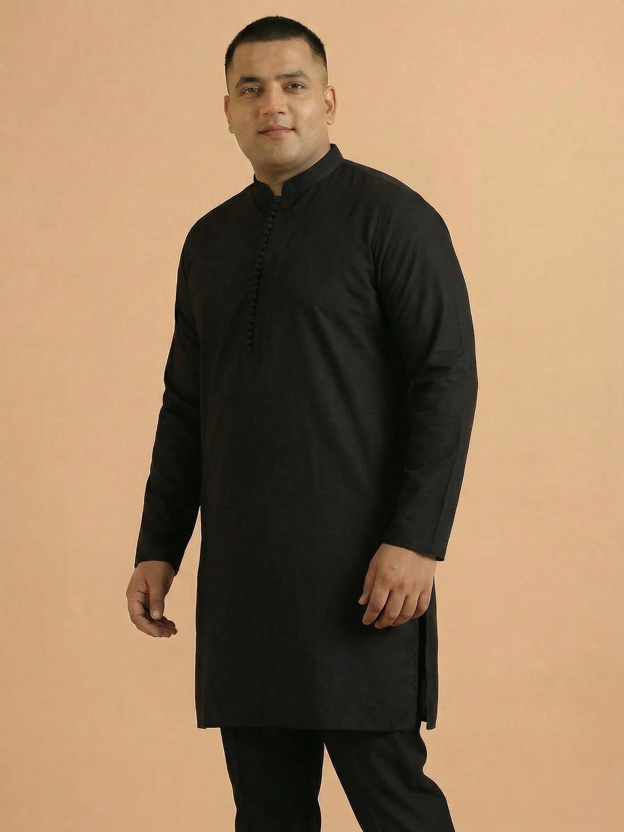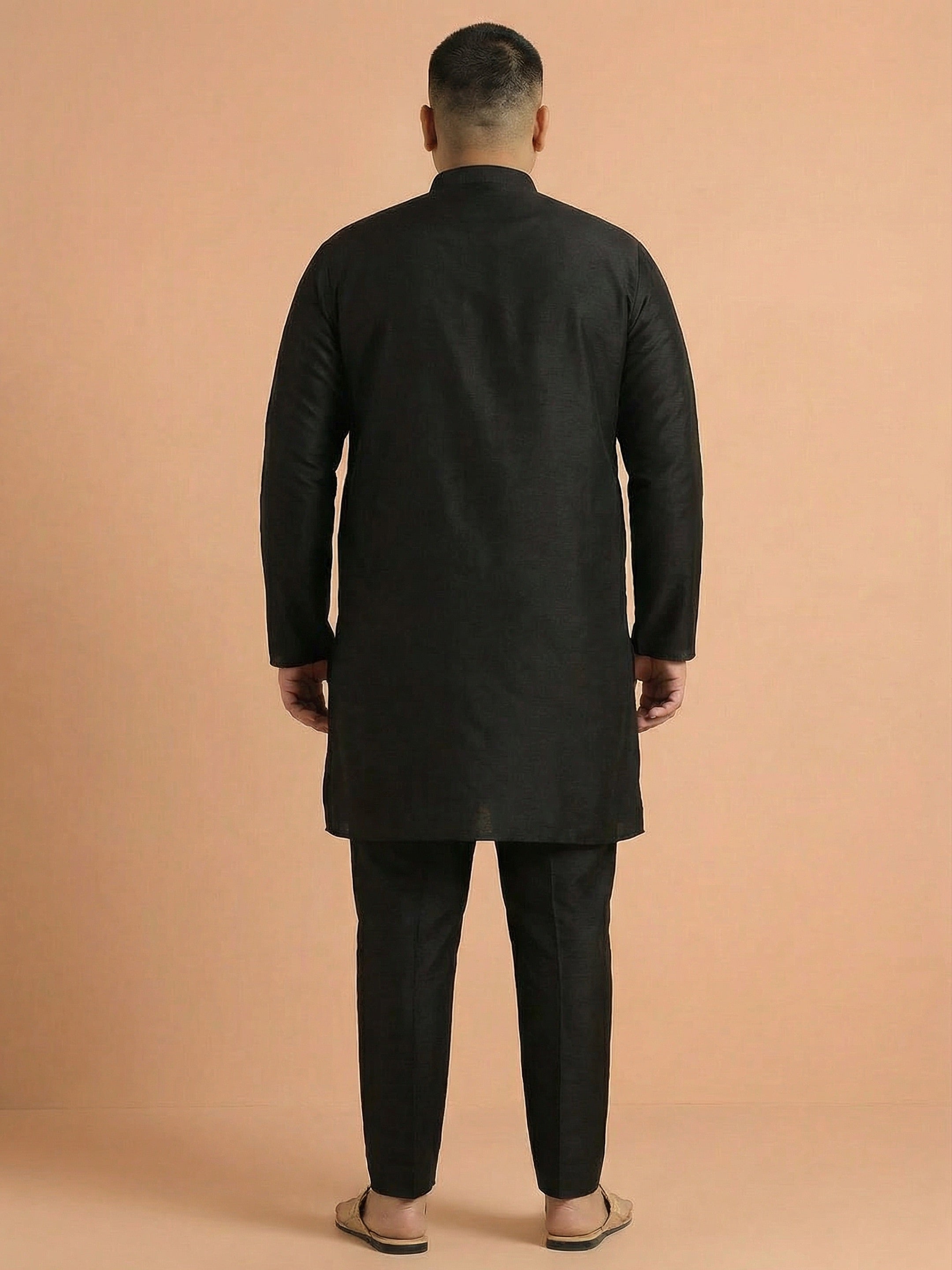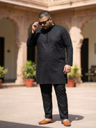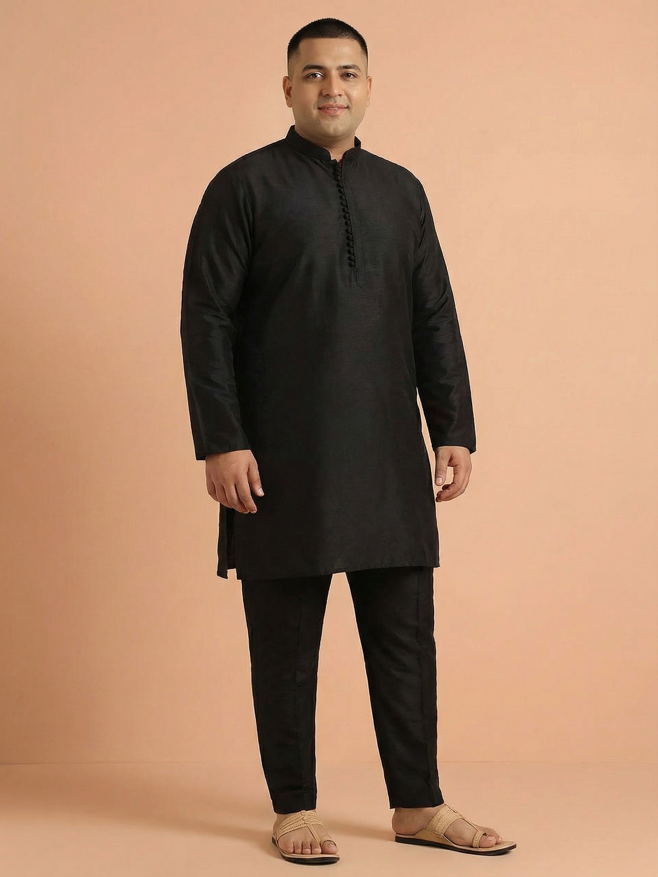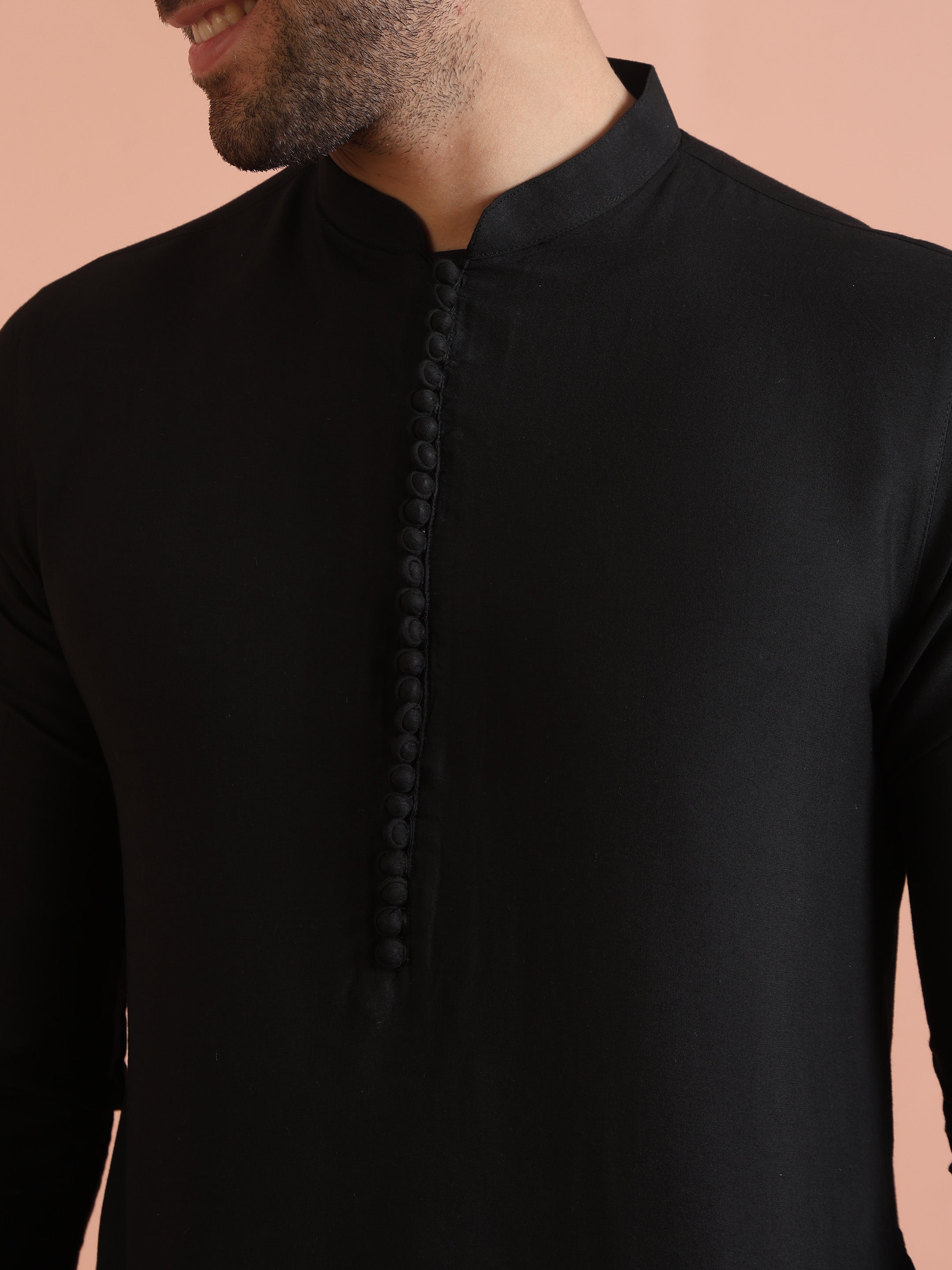 Kisah black cotton silk solid mid kurta with fabric button placket detailing. Perfect for casual festive looks and minimalistic ethnic styling.