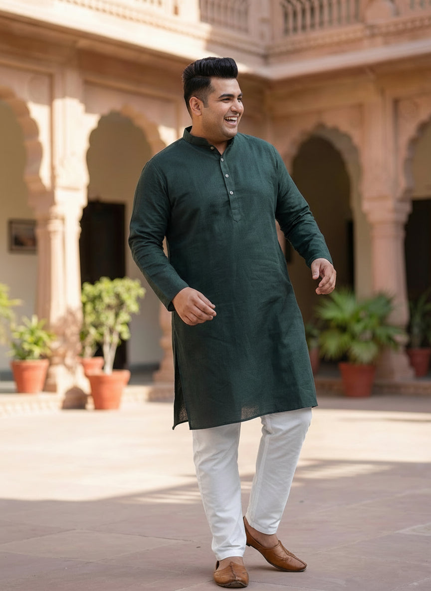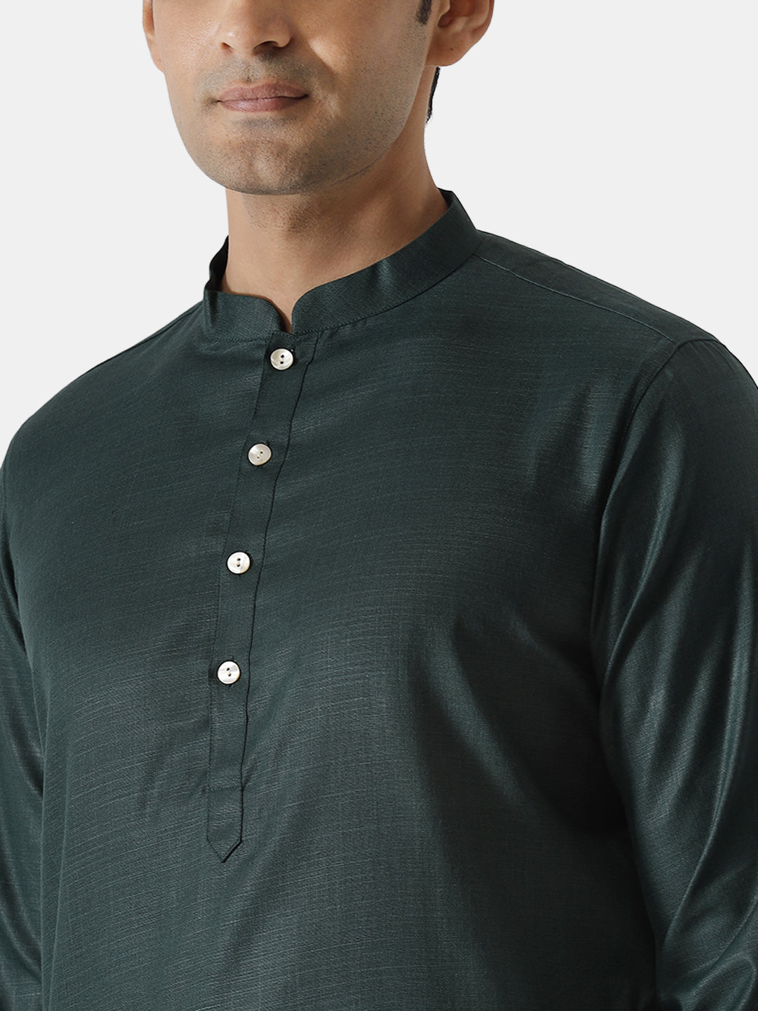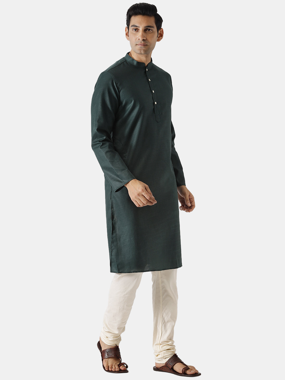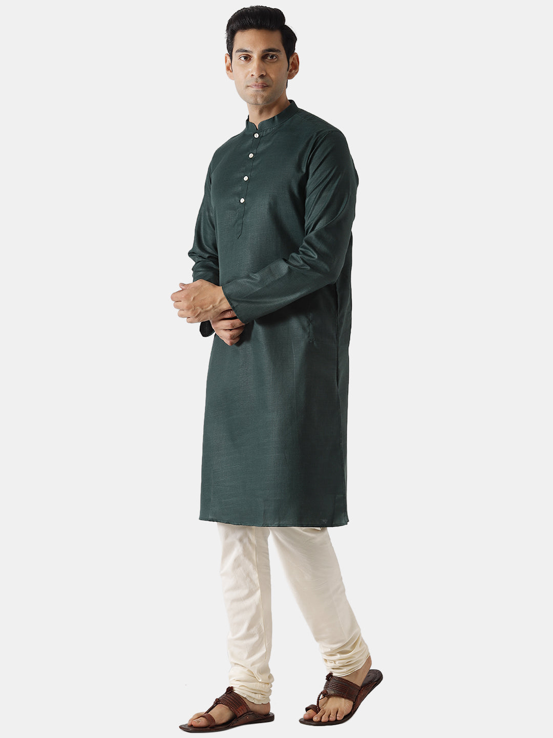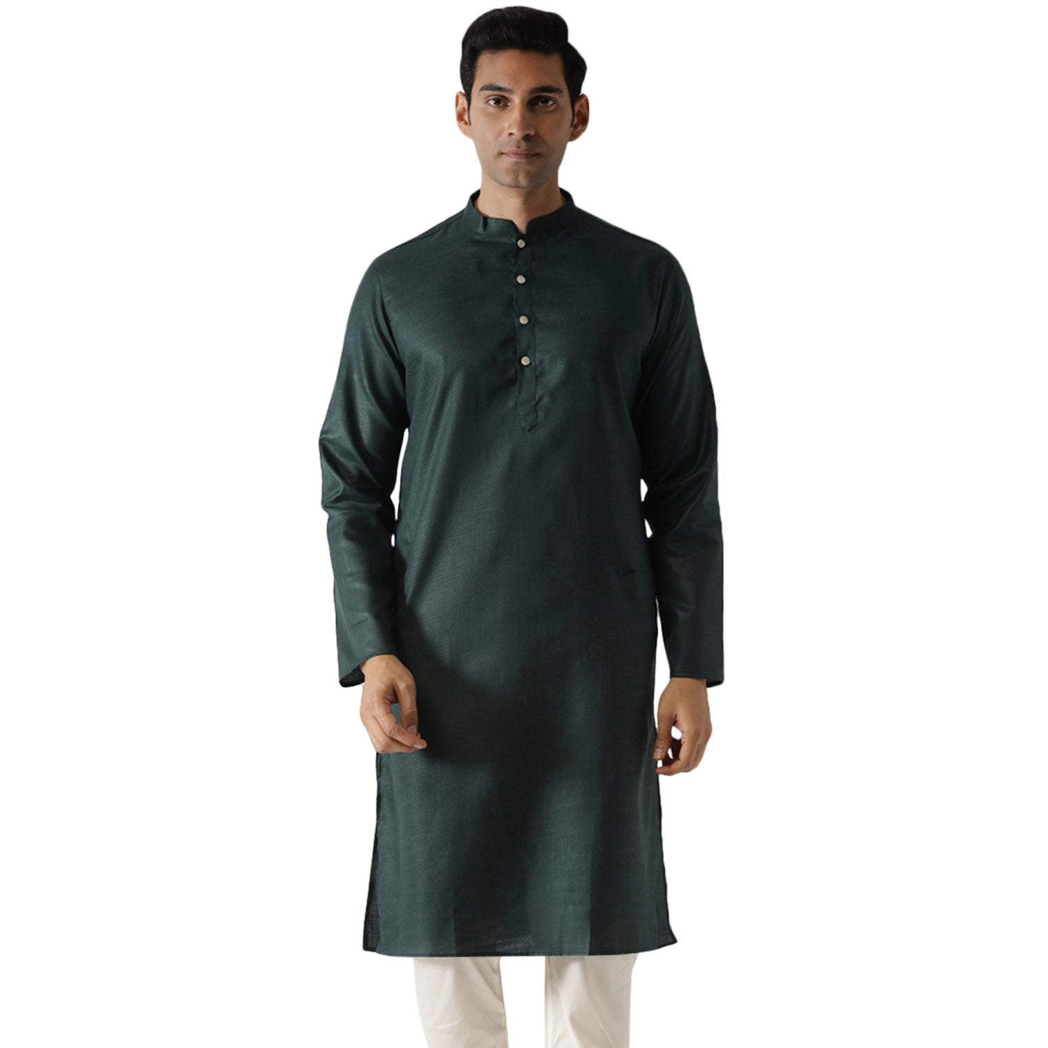 Kisah dark green silk blend solid long kurta with mandarin collar. Elegant festive wear perfect for weddings, puja, Diwali, and Eid celebrations.