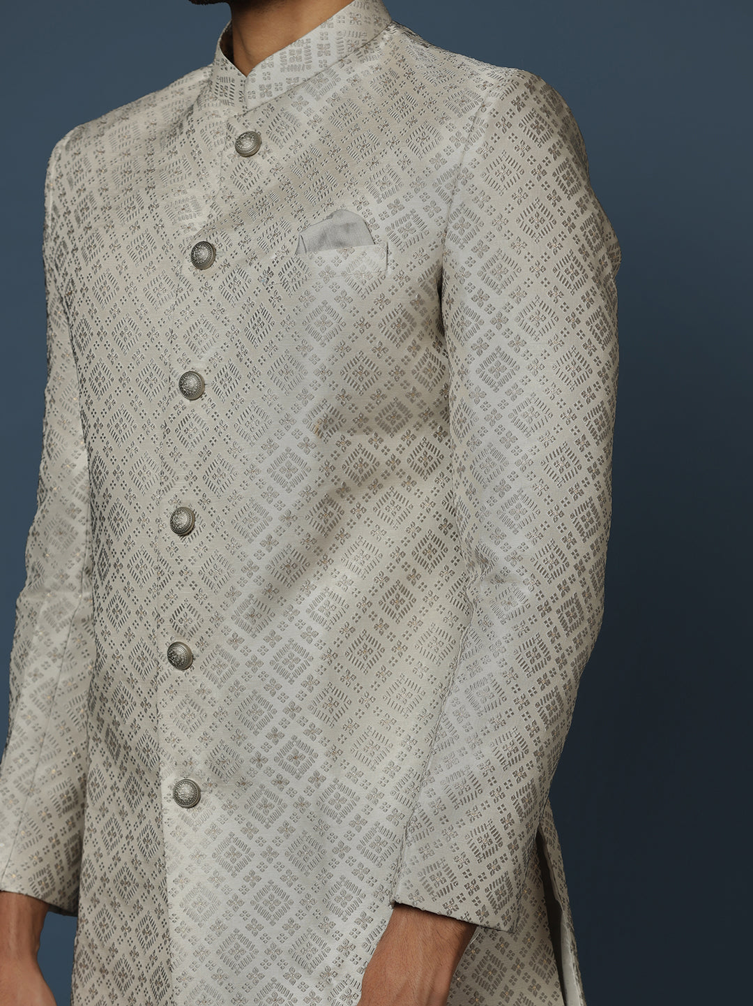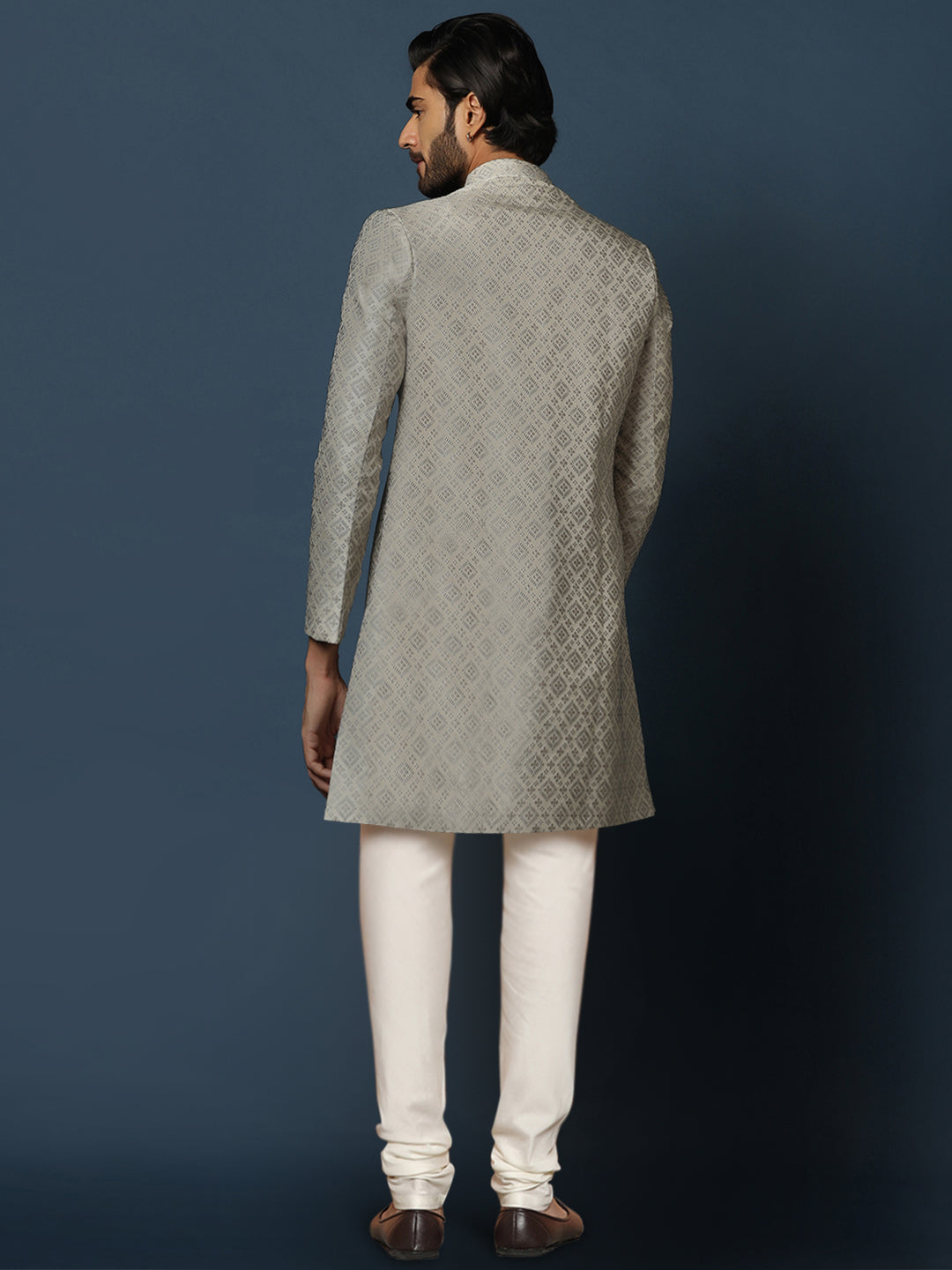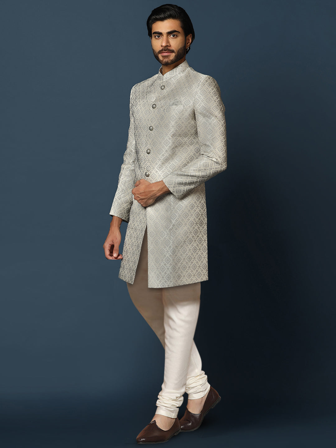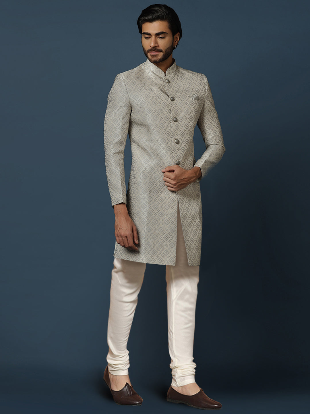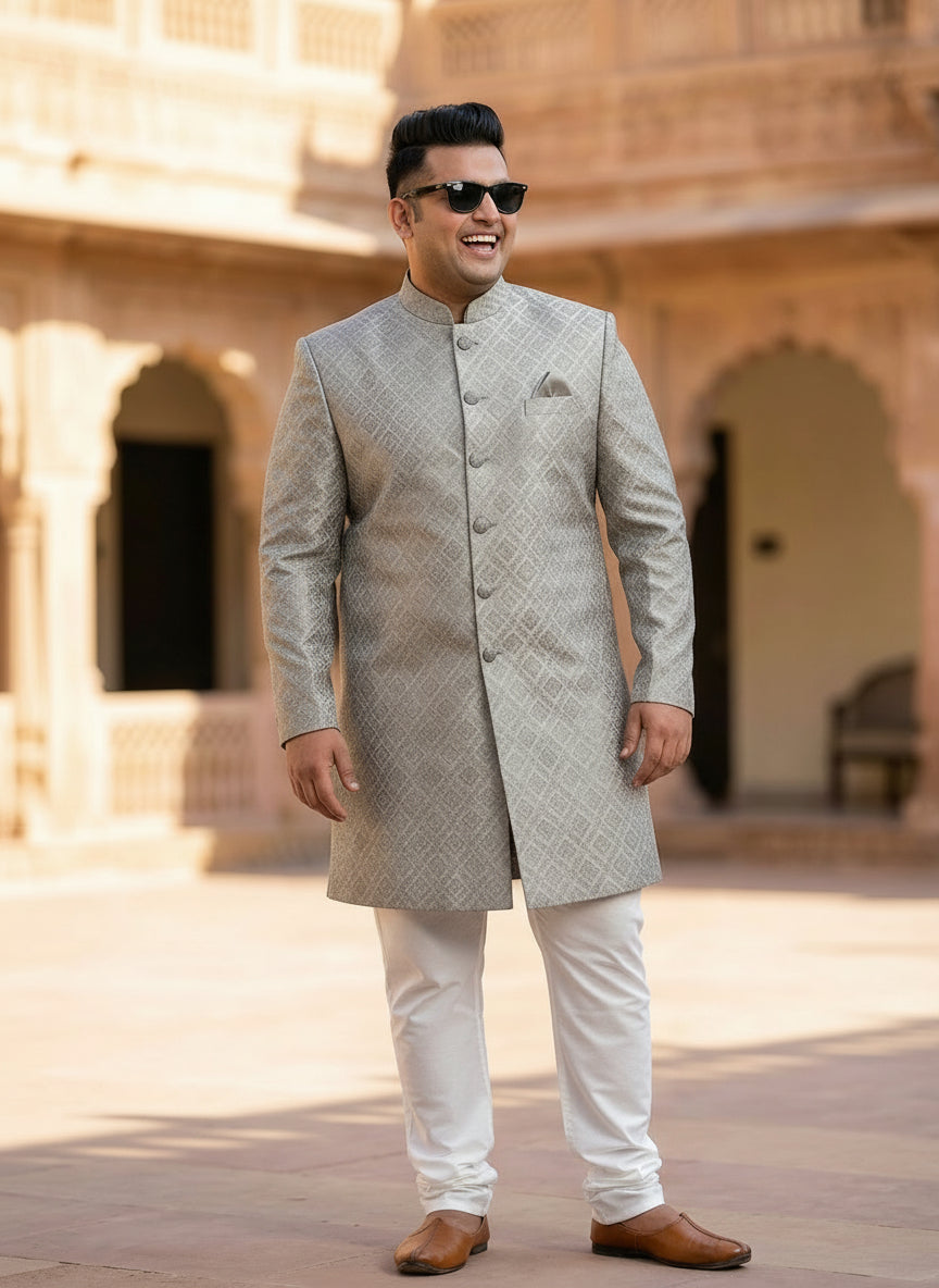 Kisah grey cotton silk sherwani churidar set with textured woven motifs. A premium choice for weddings, receptions, and festive occasions.