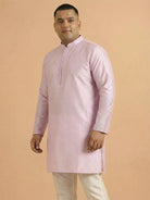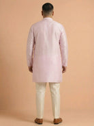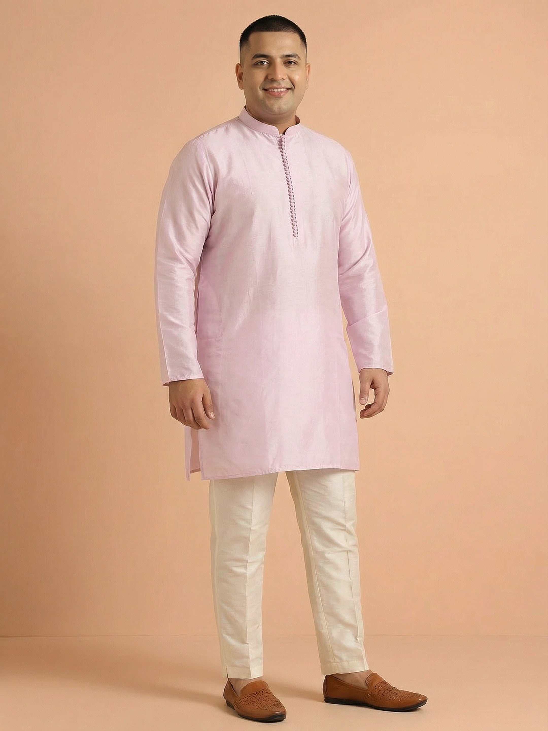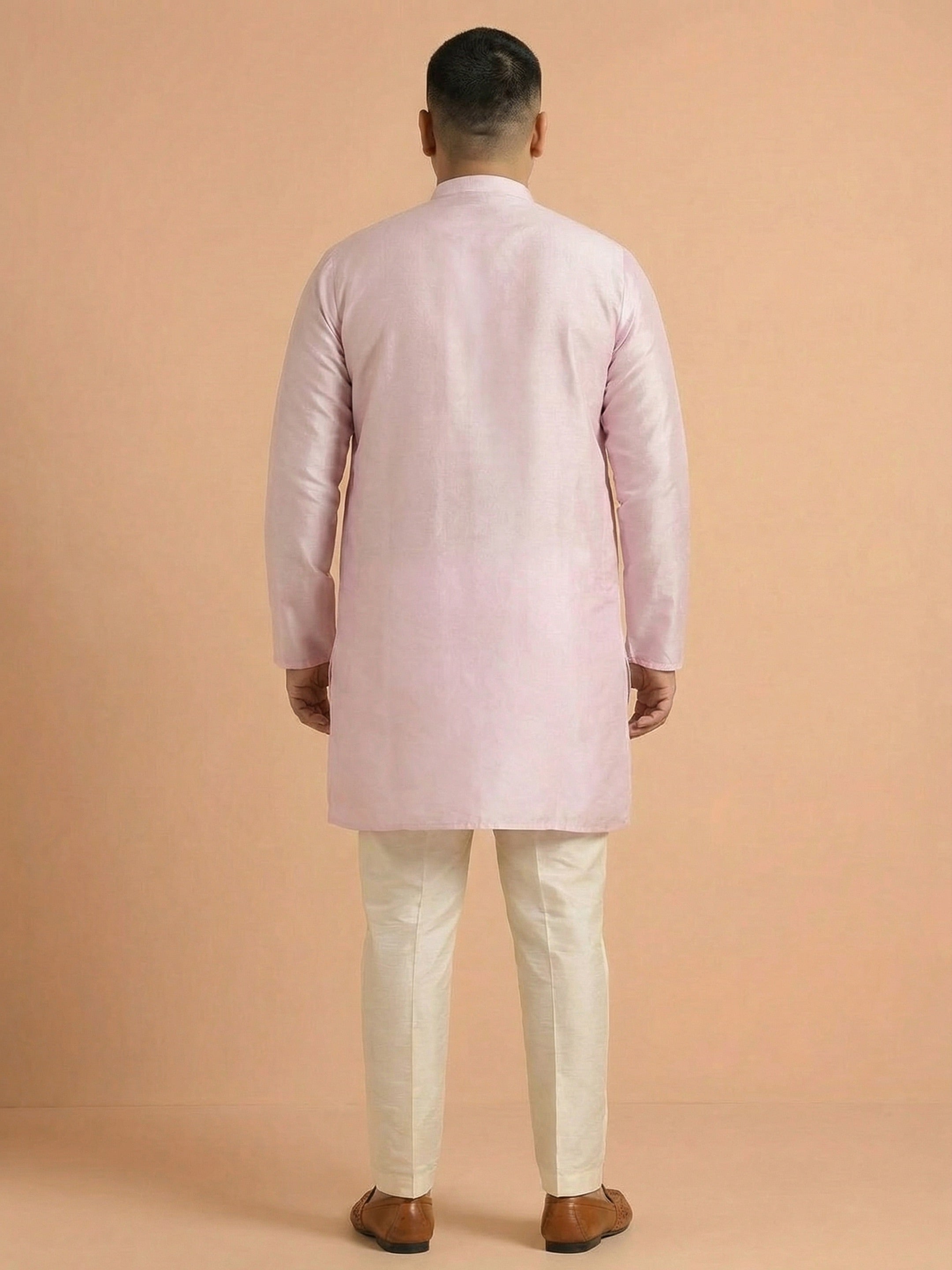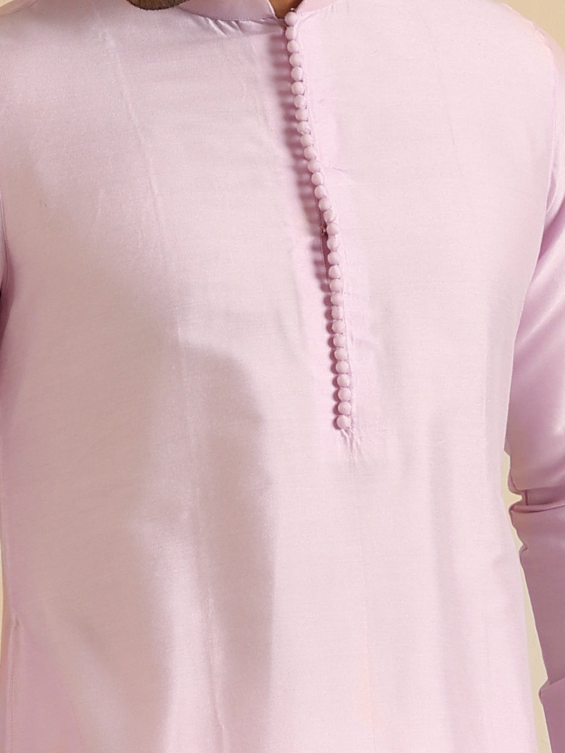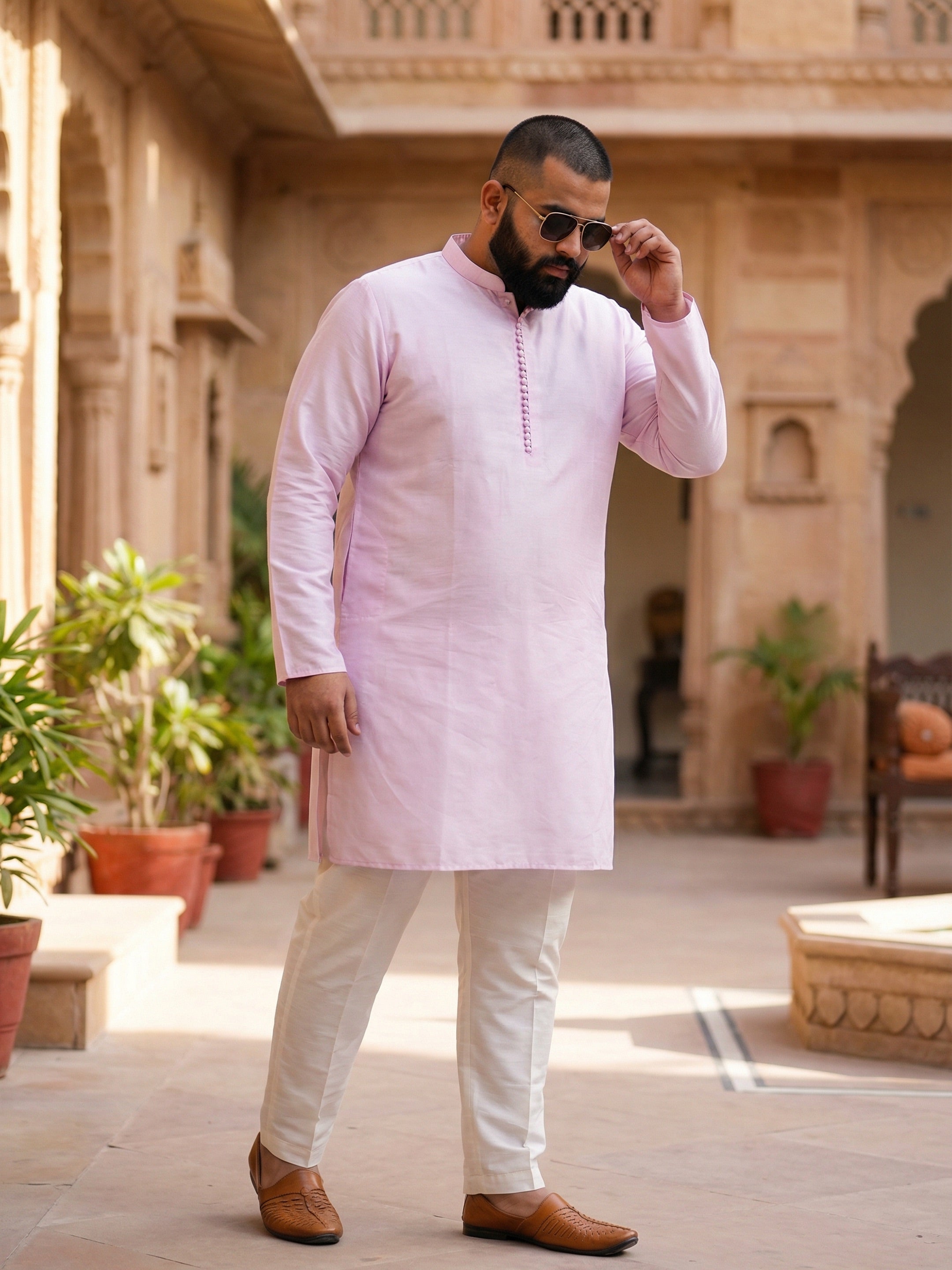 Light pink silk blend mid kurta with fabric button placket. A simple and elegant pastel festive wear for weddings, pujas, and traditional gatherings.