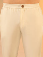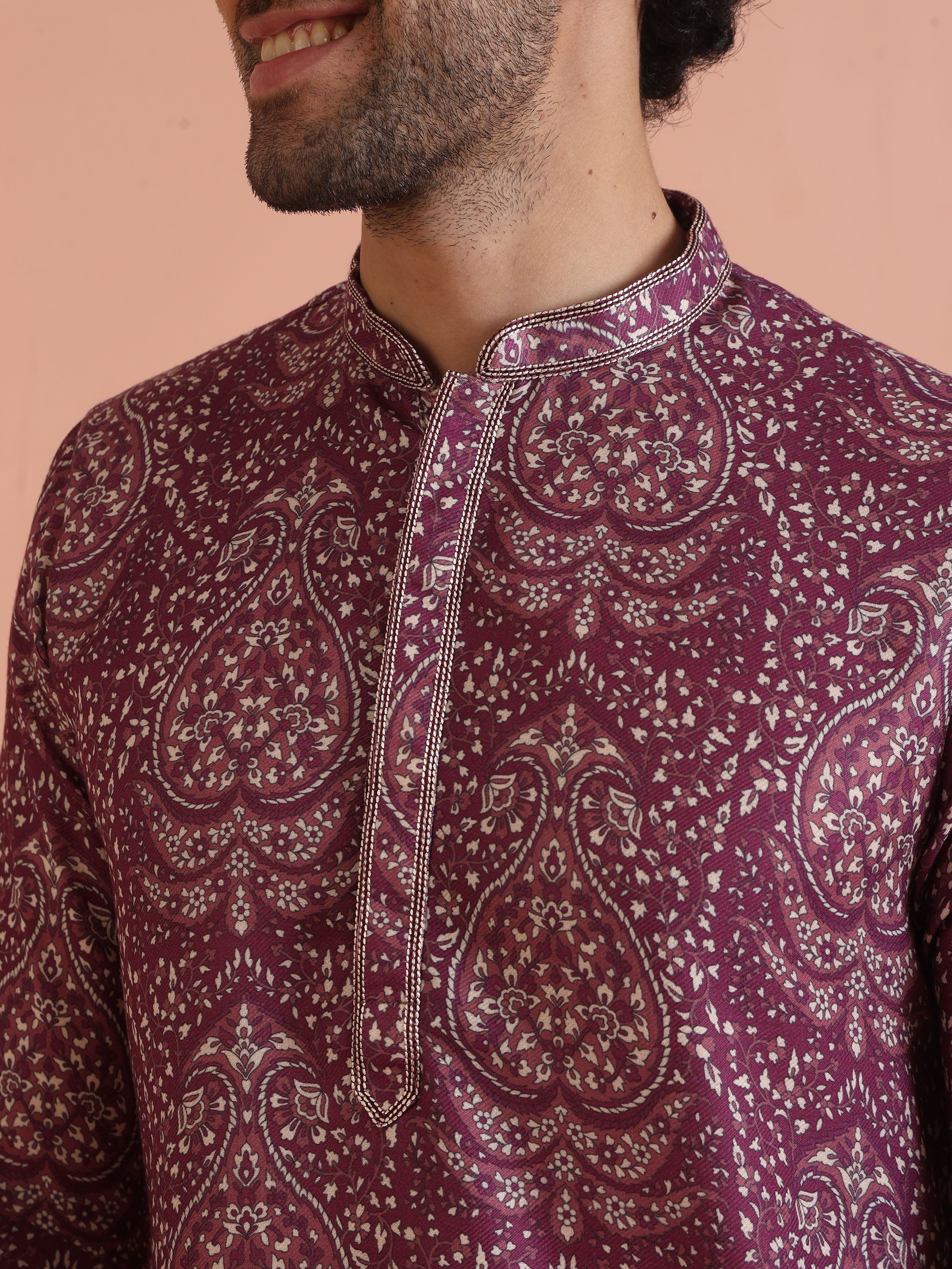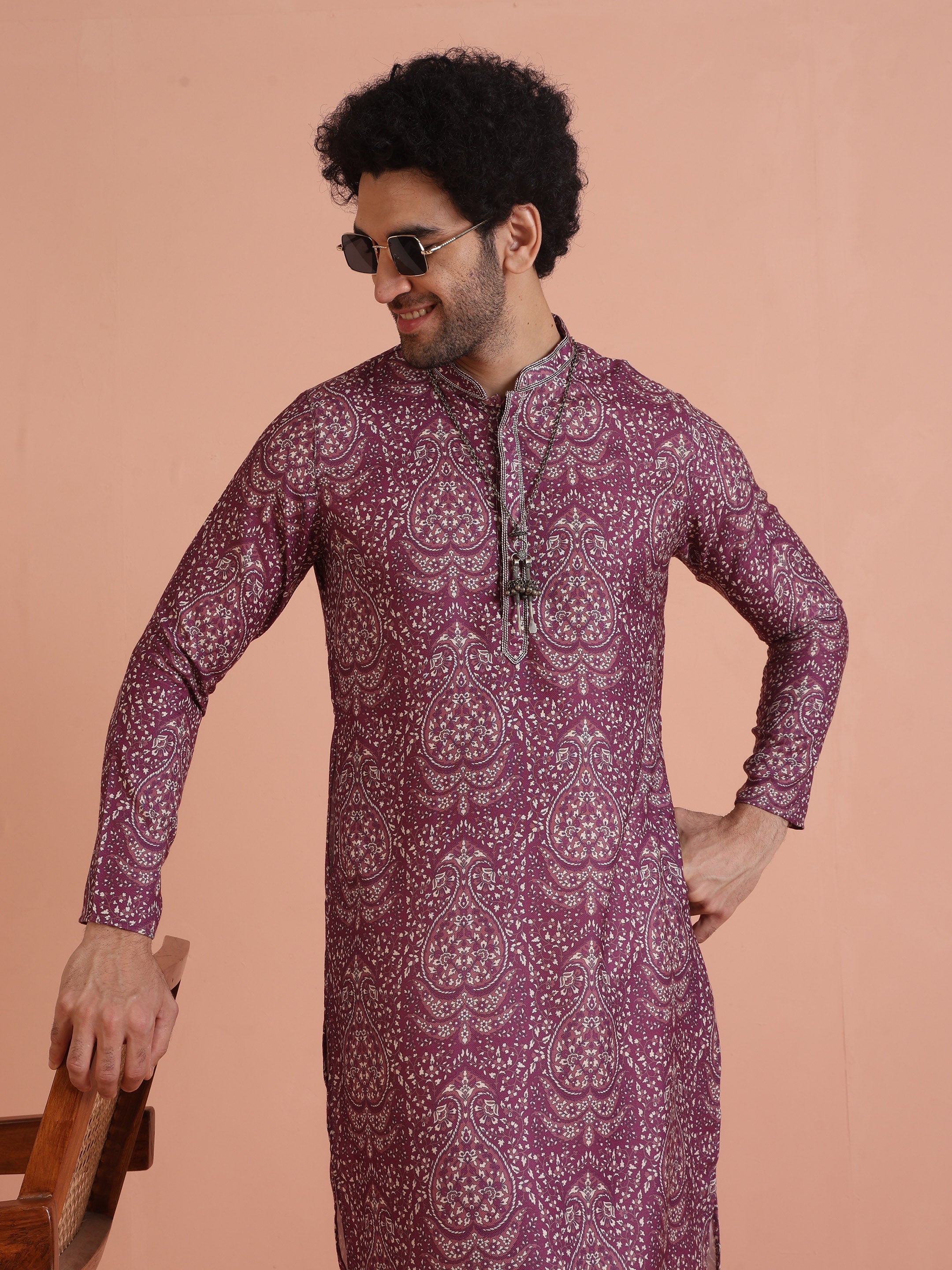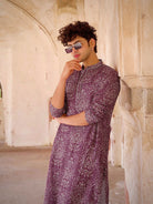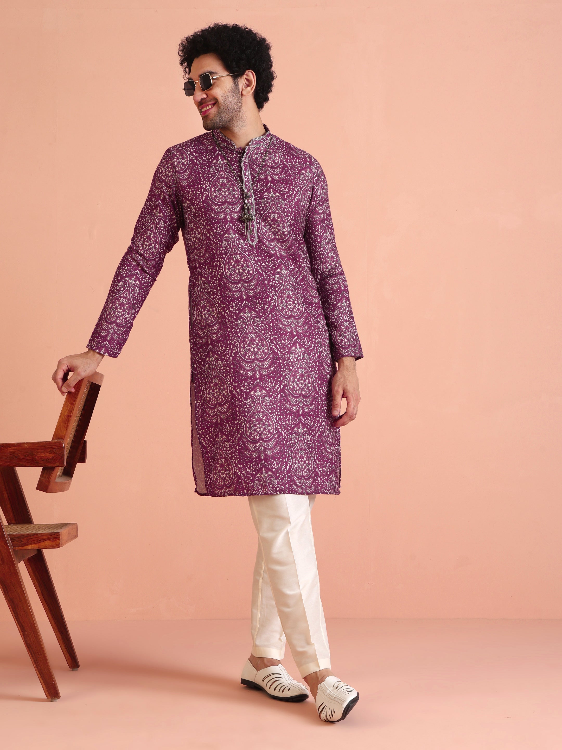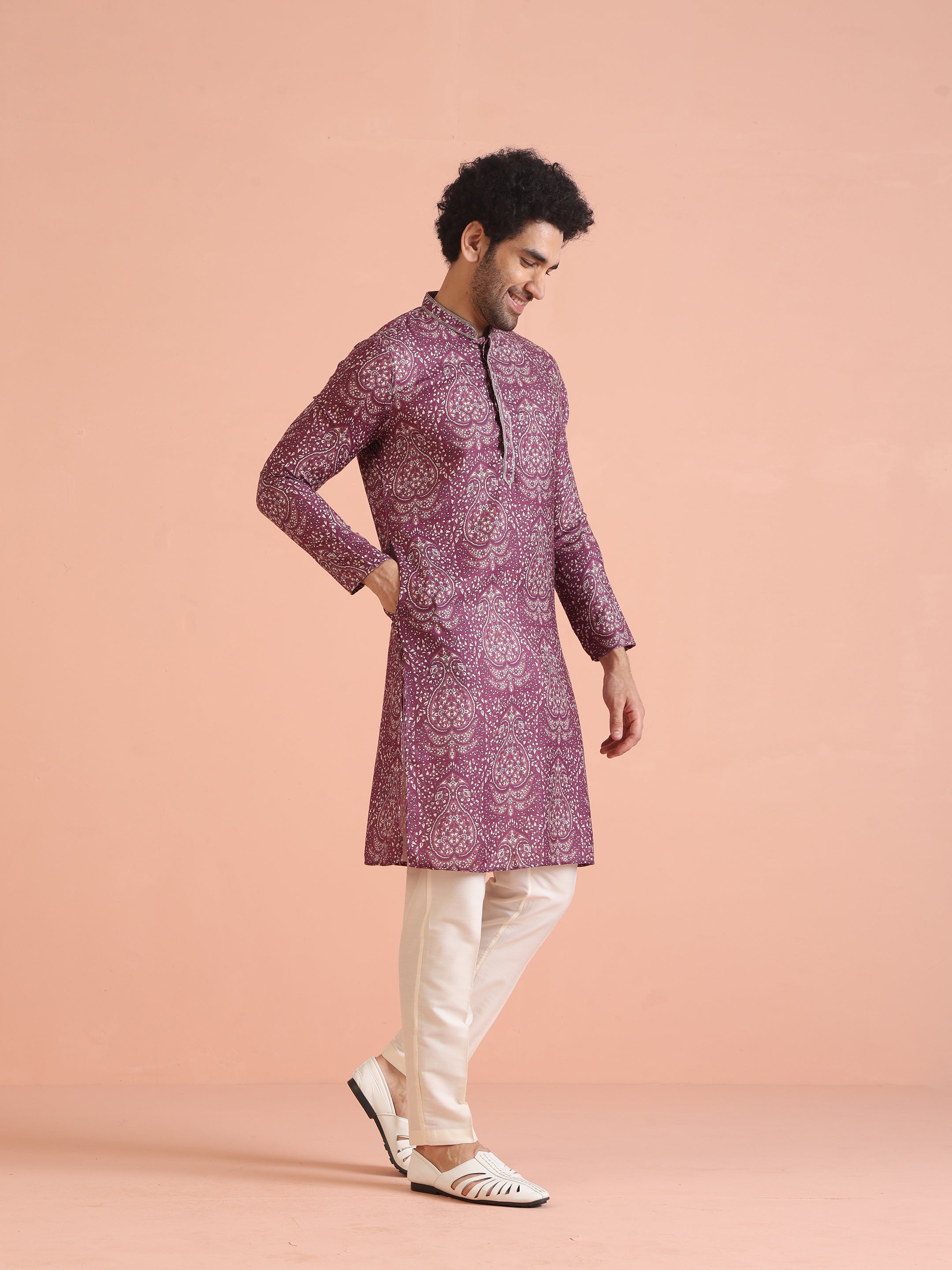 Purple art silk printed kurta with cream trousers. Stylish festive kurta trouser set for weddings, sangeet, and special occasions.
