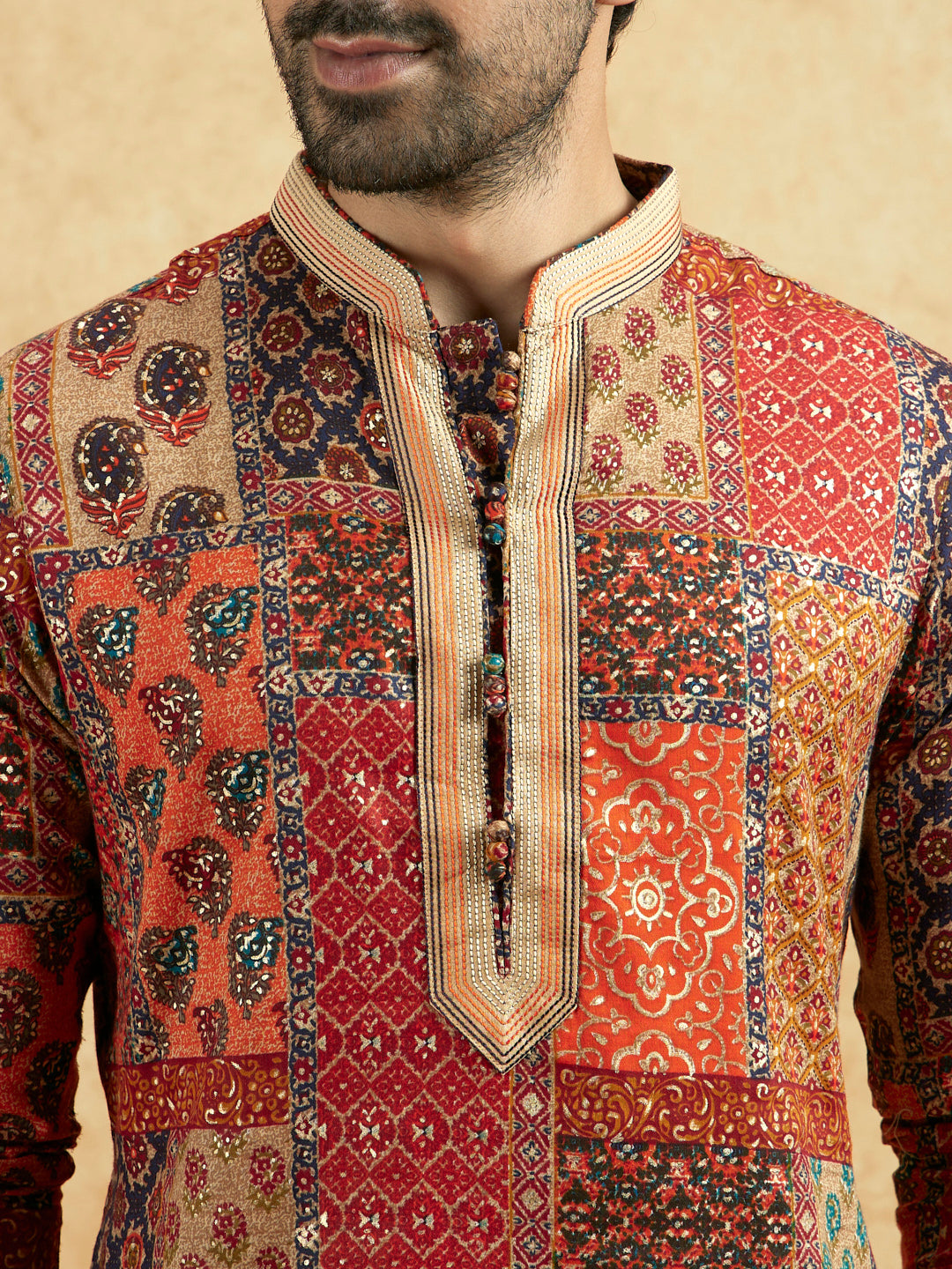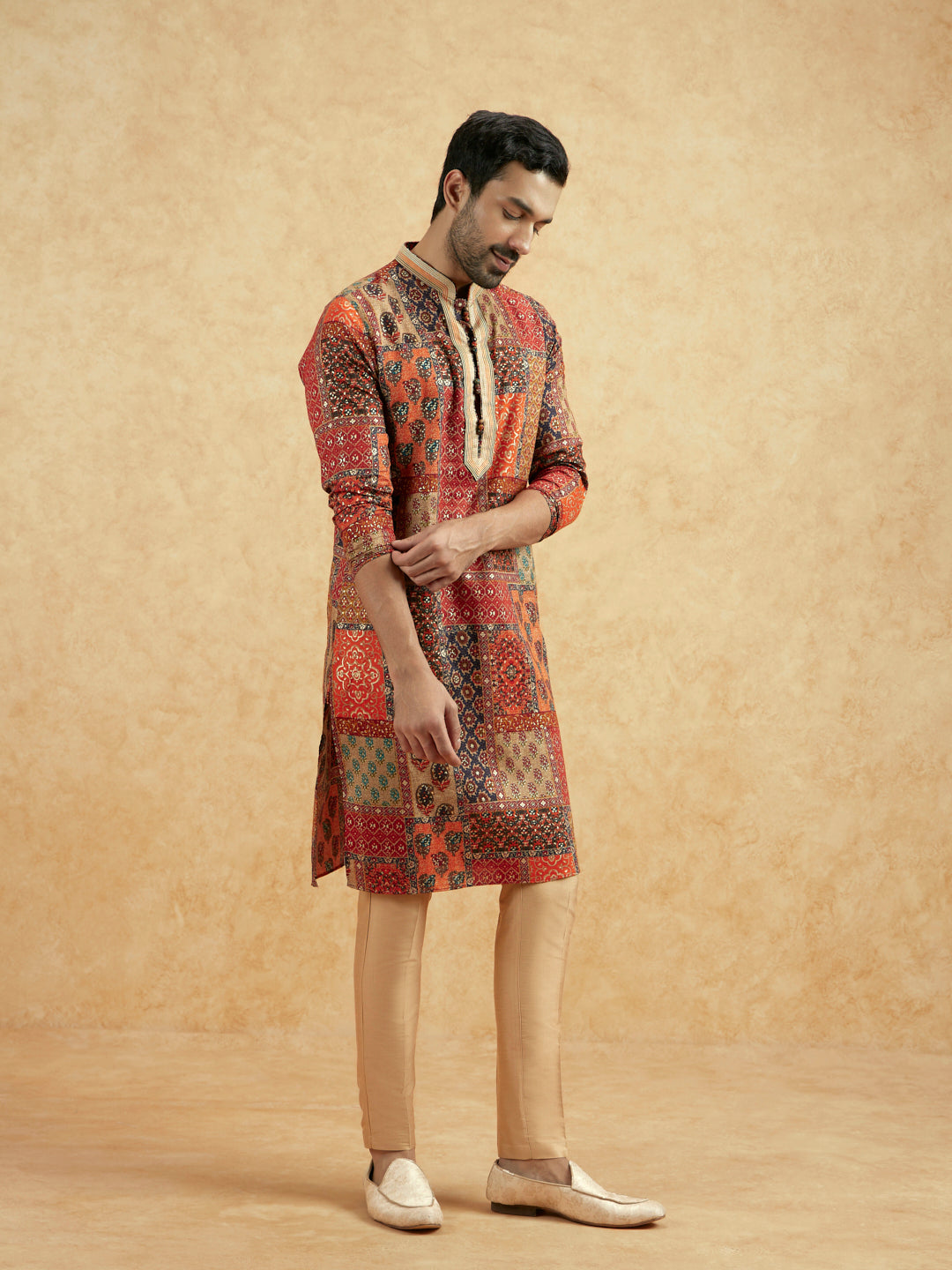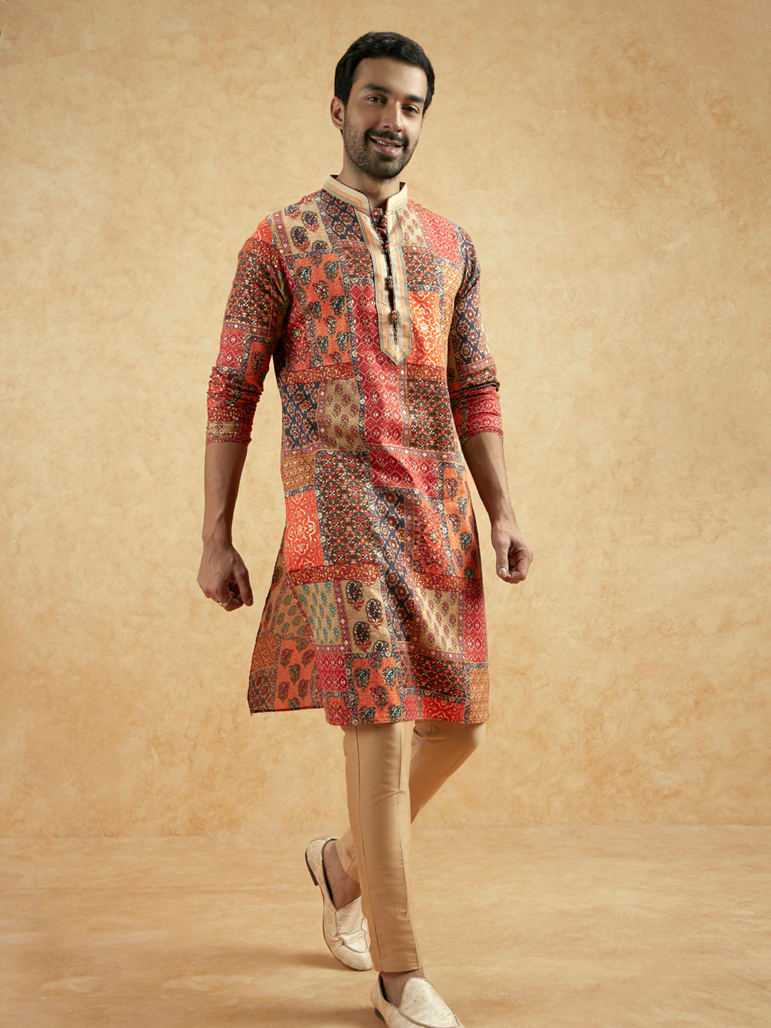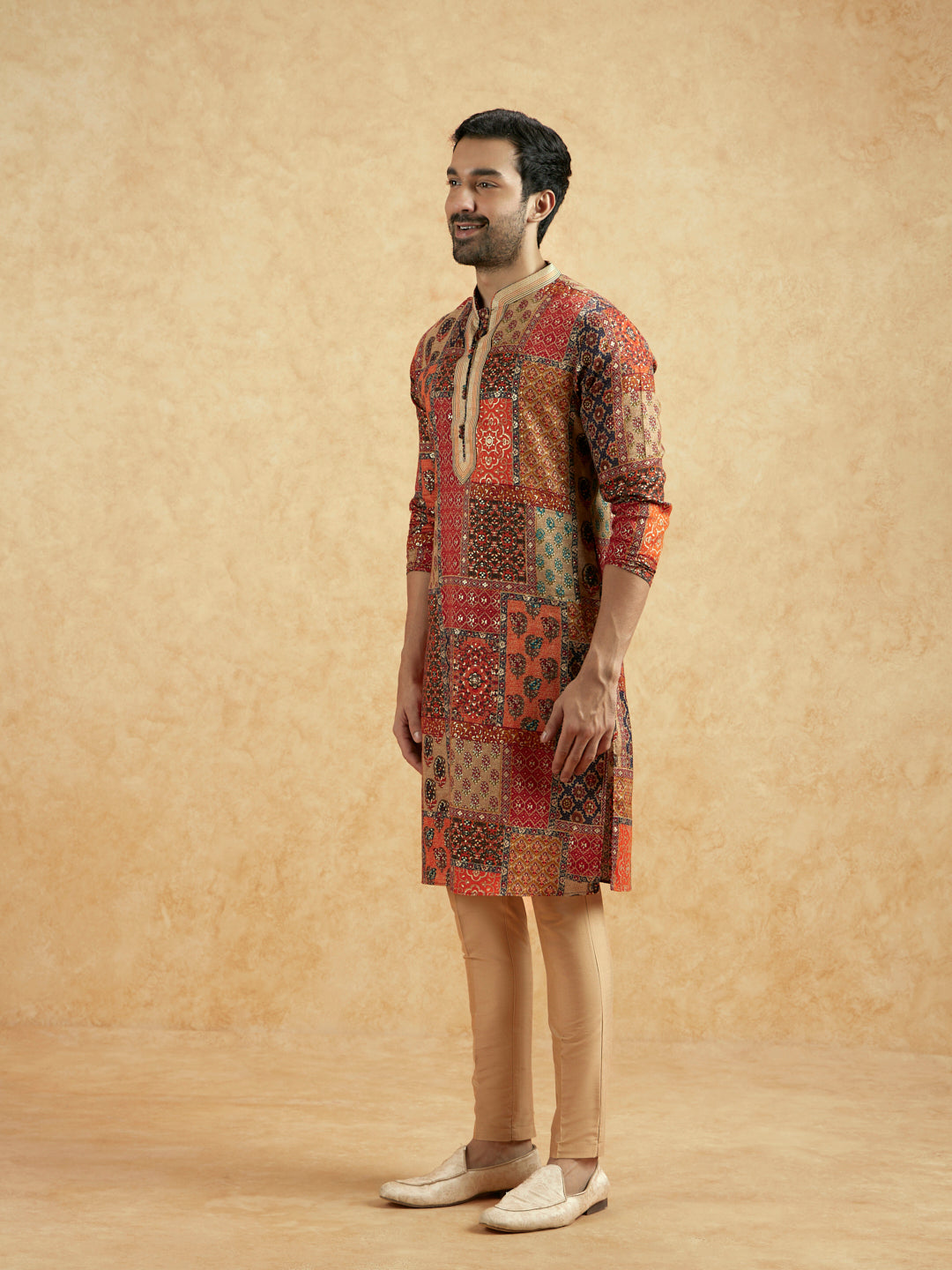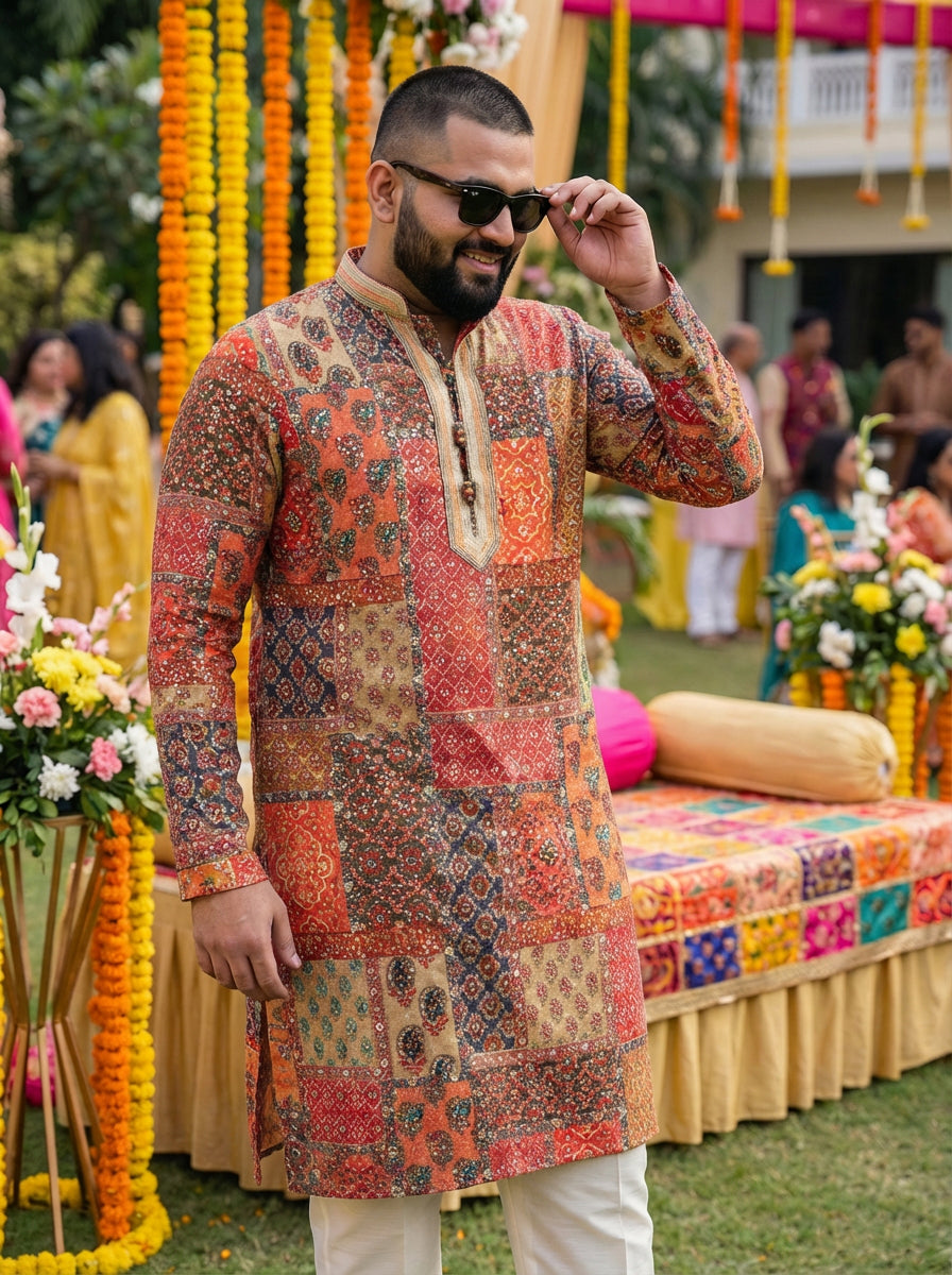 Multi-color art silk kurta with patchwork print and embroidered placket. Ideal for weddings, pujas, and festive celebrations.