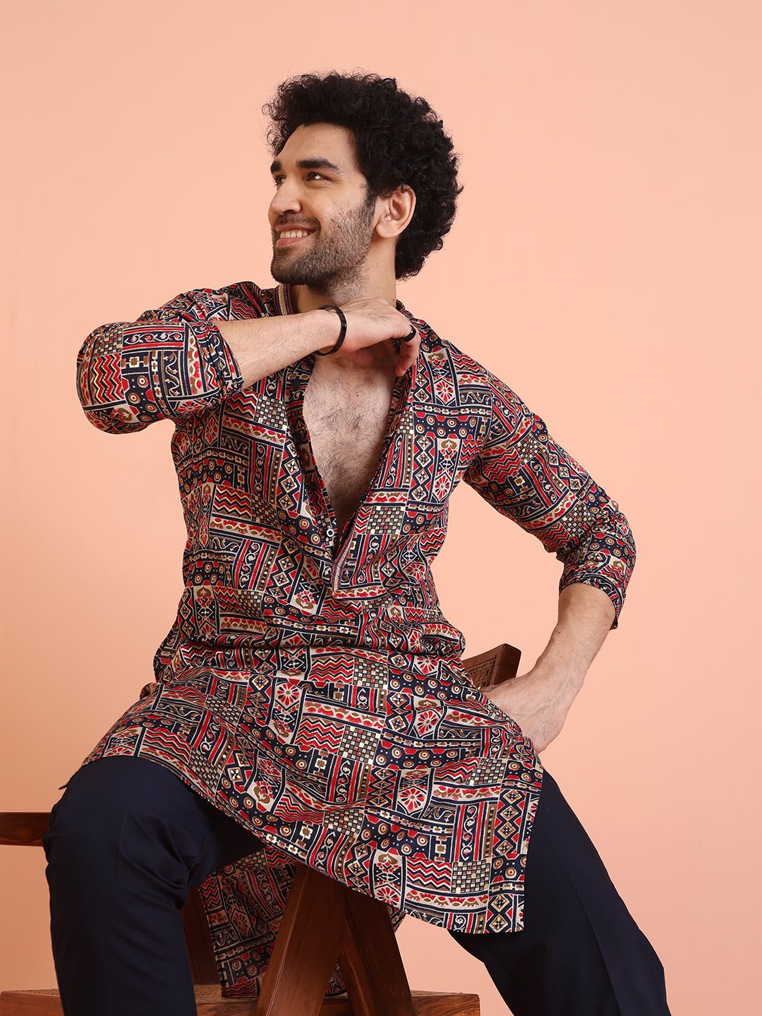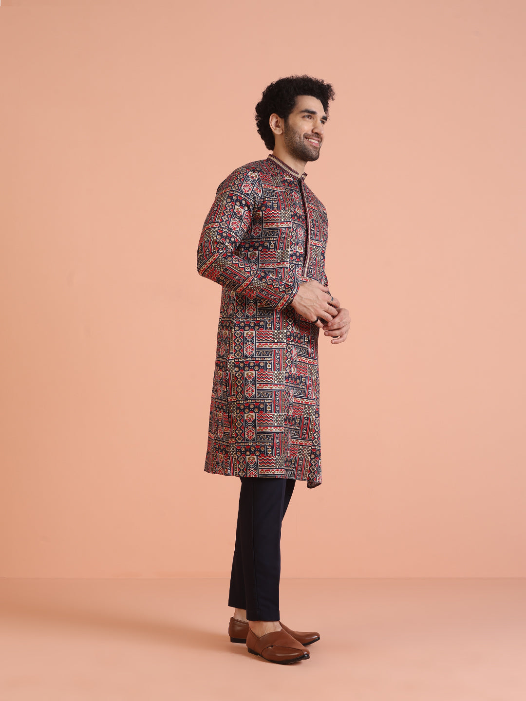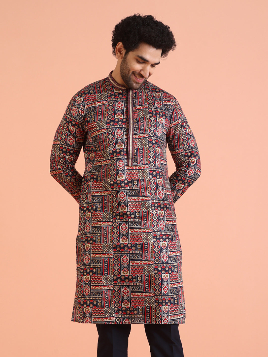 Experience classic elegance with this Men Multi Printed Geometric Kurta. The Printed Pattern adds a refined touch, while the breathable Cotton Blend fabric ensures comfort throughout the day. Ideal for festive events or casual wear, this Kurta is a wardrobe essential..