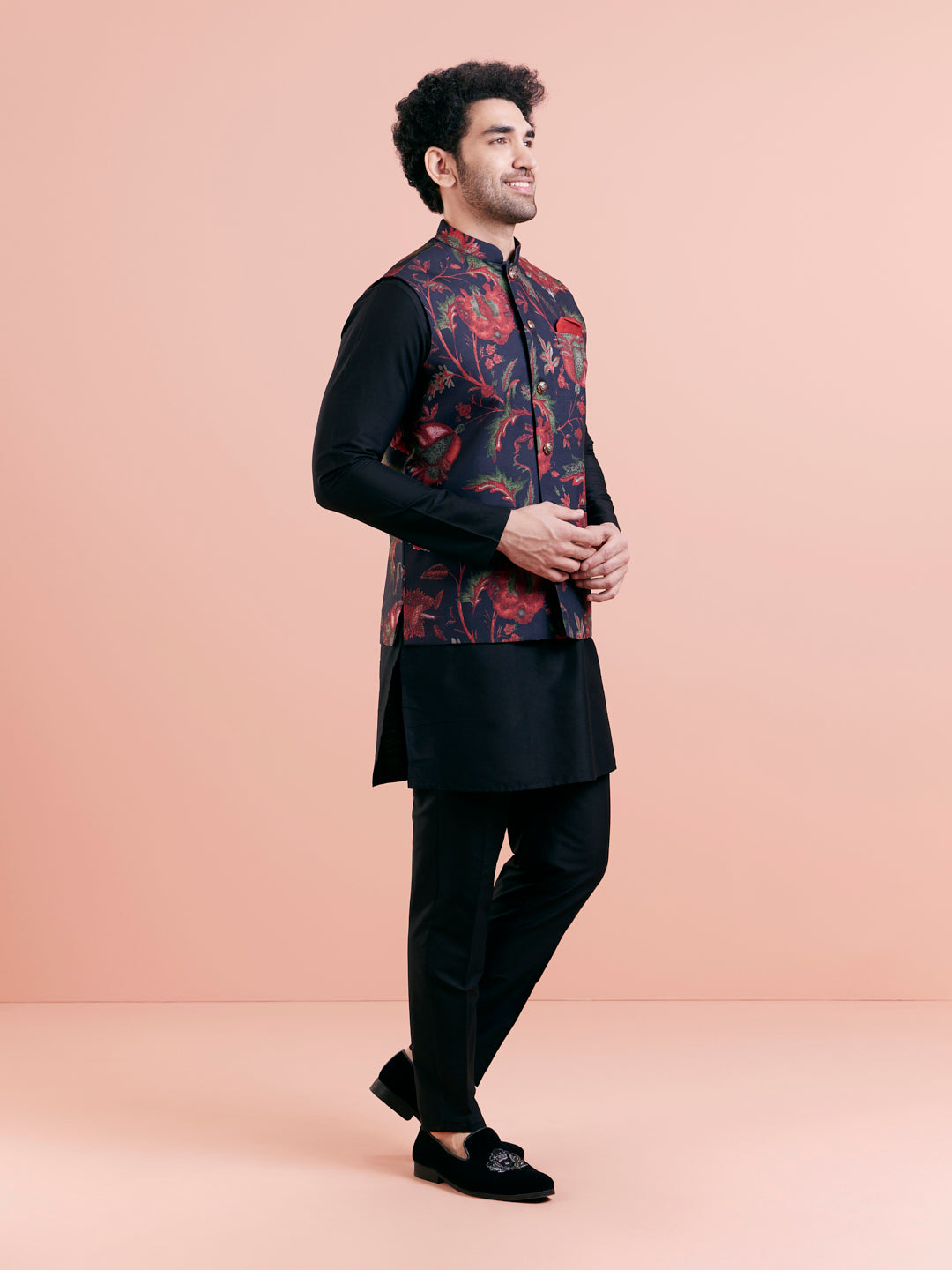 This black cotton blend jacket features a printed design and regular fit. Ideal for festive events, it adds a modern touch to your ethnic wear collection.