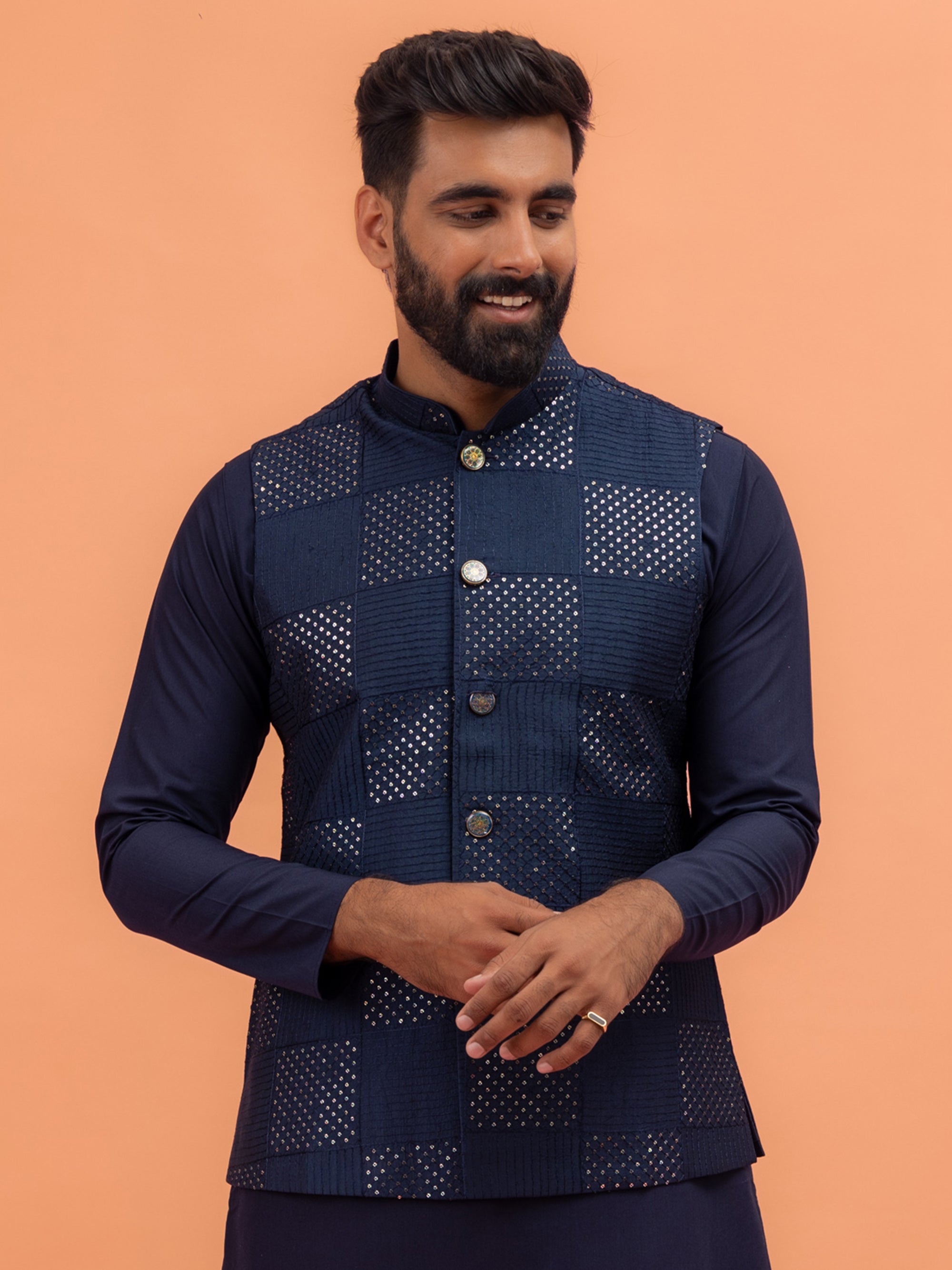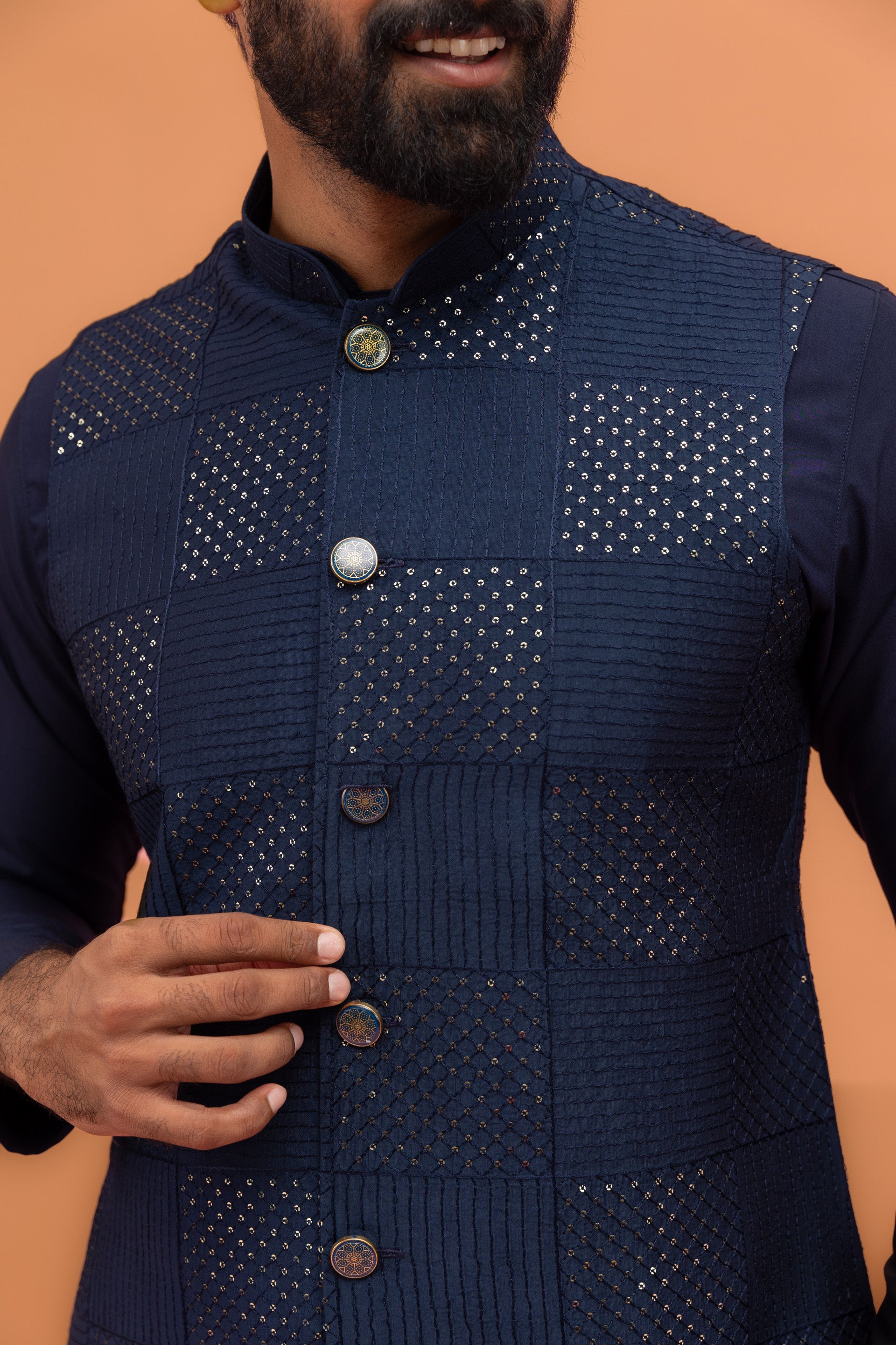 This Nehru Jacket is just perfect for festivals, or any kind off occasions. Its mandarin collar, style gives a charming look, this classic design is made from Cotton Blend fabric and Stylish Embellished Pattern comes in Navy Blue colours. Perfect for any occasion.