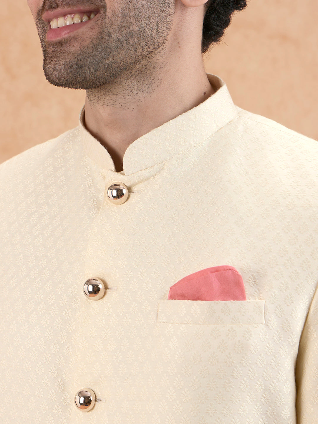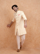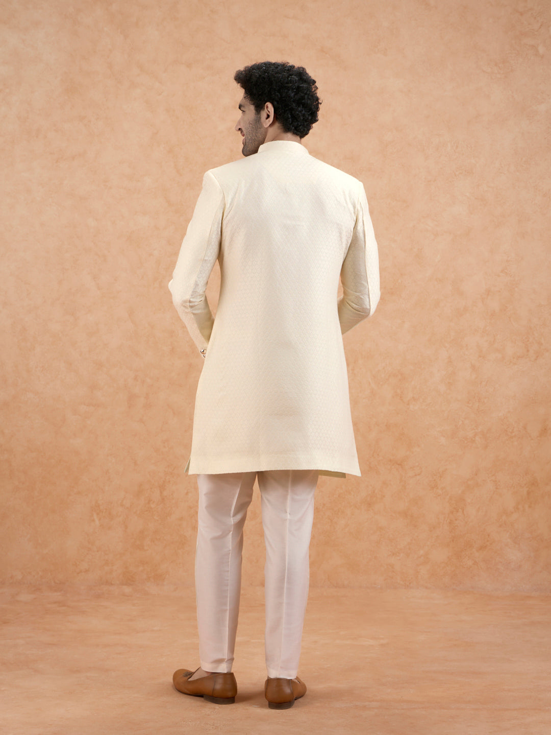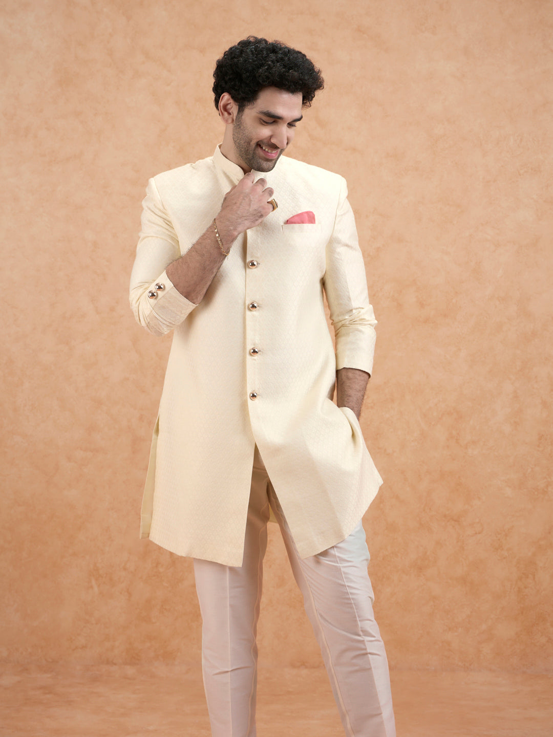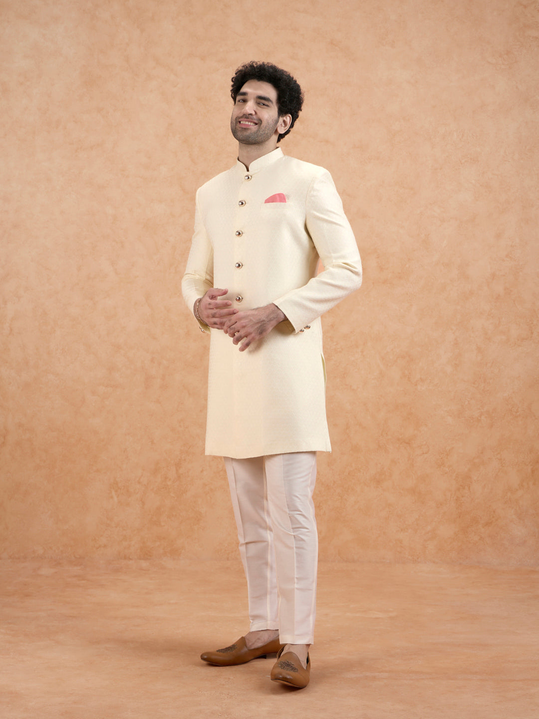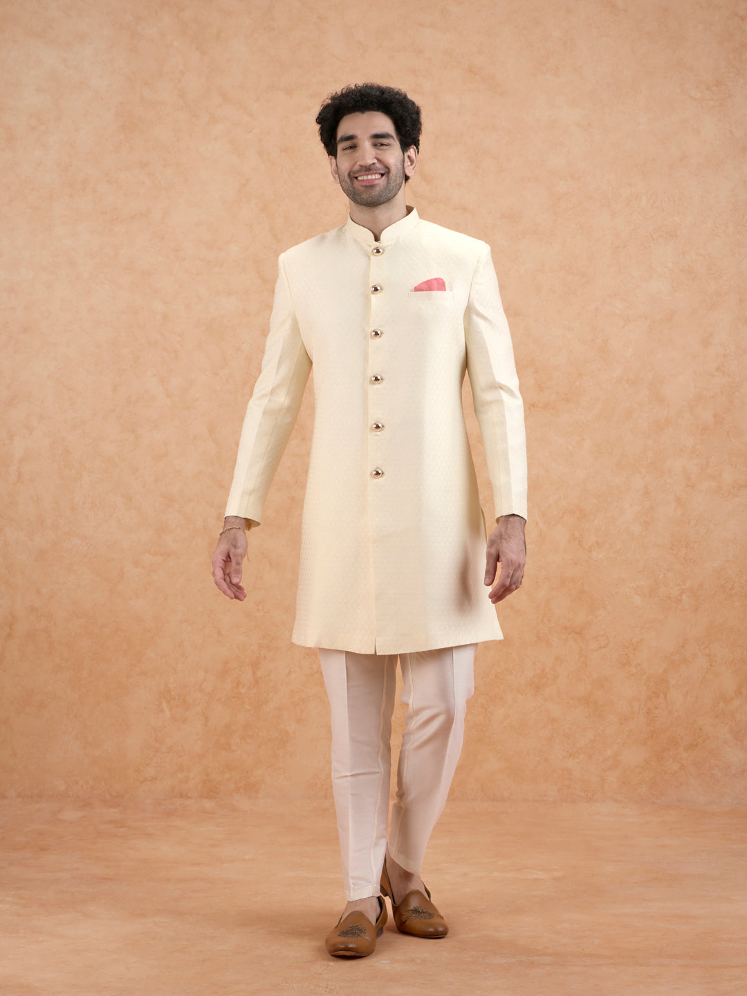 Cream brocade sherwani with trouser an elegant, lightweight silk blend outfit for weddings and festive occasions.