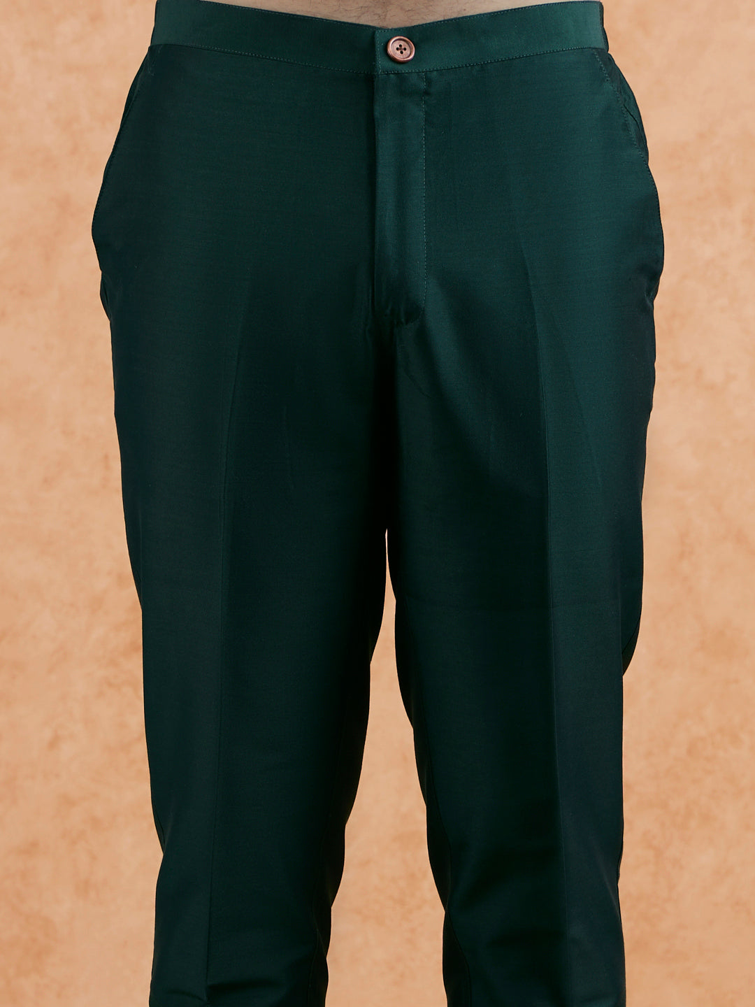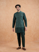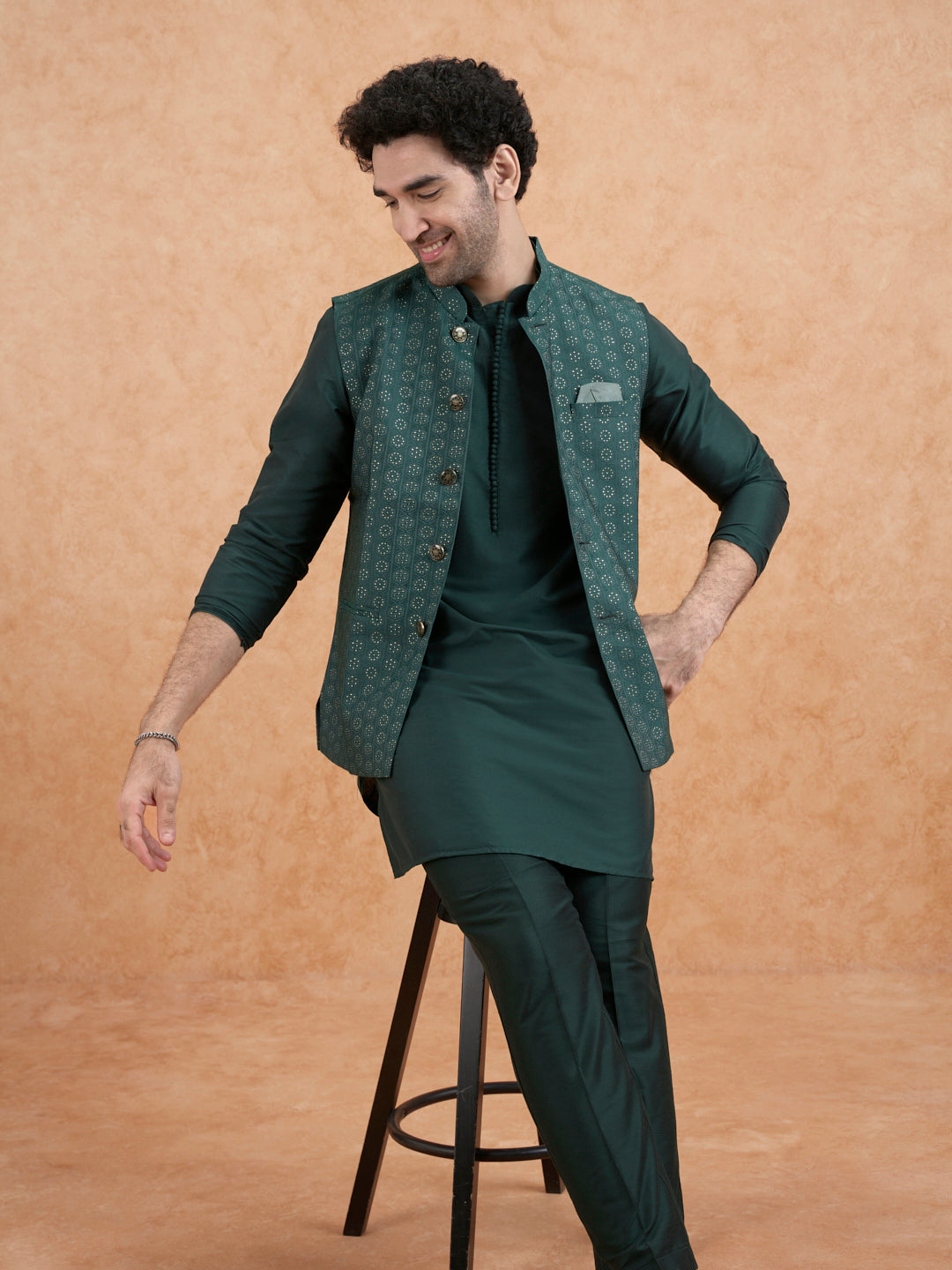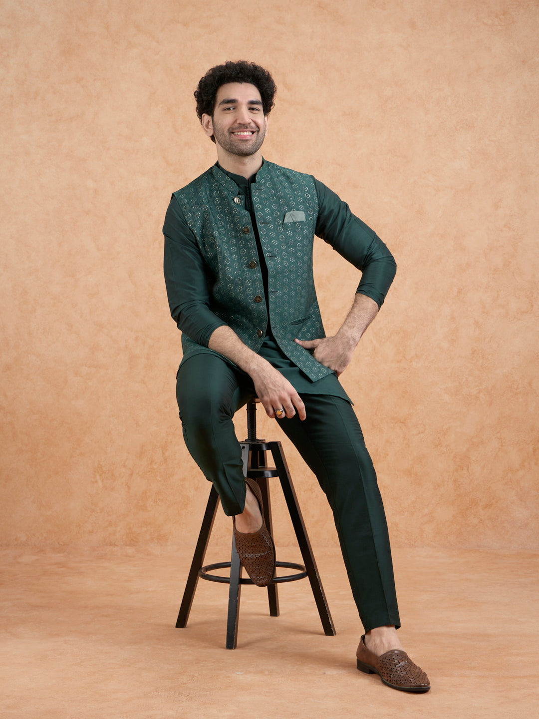 Green mid kurta jacket trouser set for men rich brocade jacket with cotton-blend base, perfect for weddings and festive events.